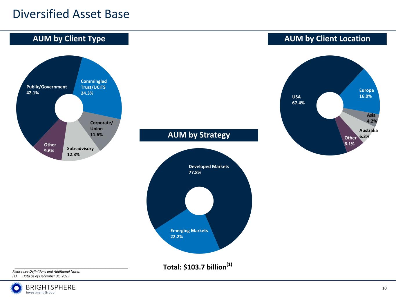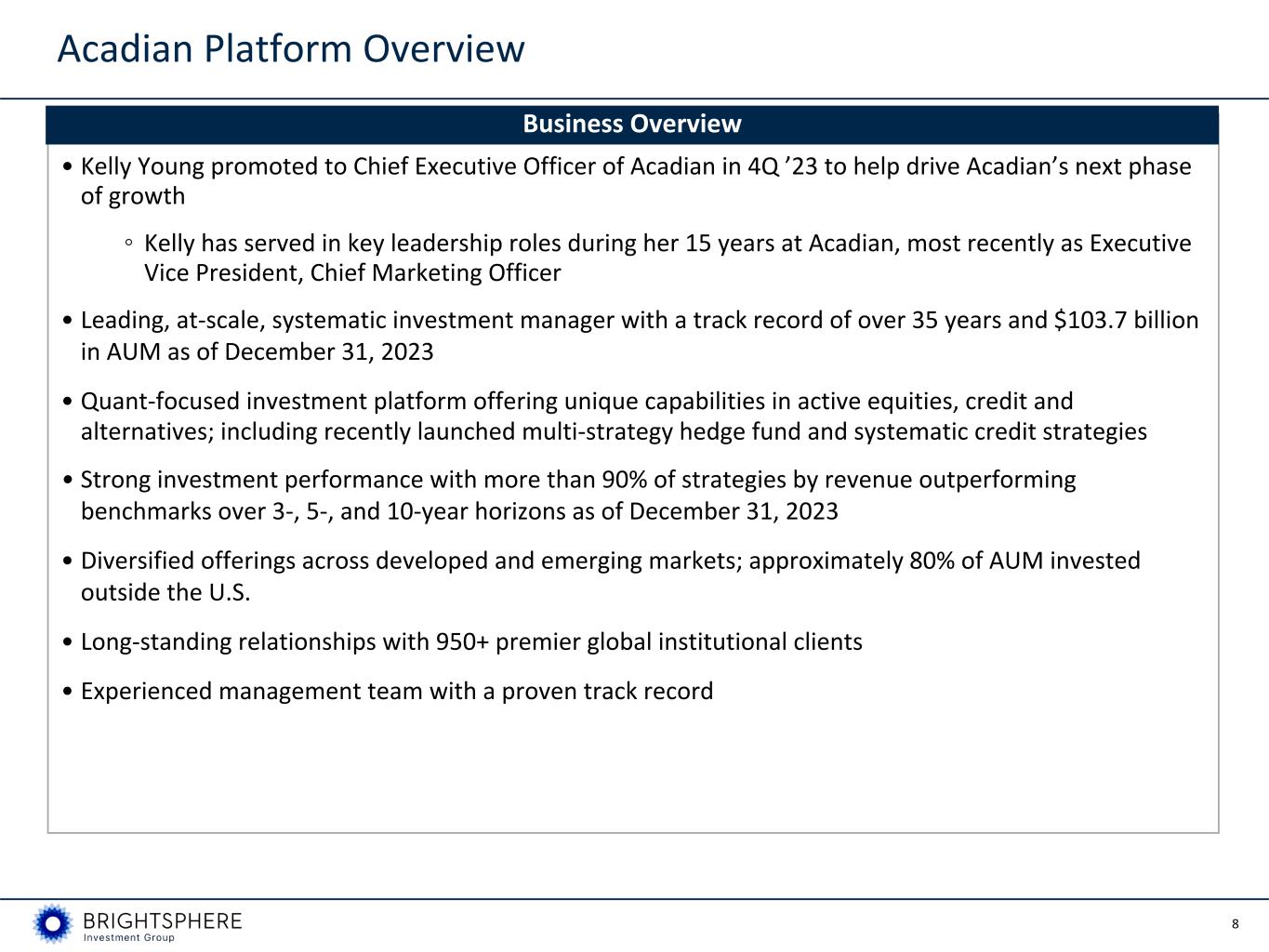 2 Dividend Declaration The Company’s Board of Directors approved a quarterly interim dividend of $0.01 per share payable on March 28, 2024 to shareholders of record as of the close of business on March 15, 2024. Conference Call Dial-in The Company will hold a conference call and simultaneous webcast to discuss the results at 11:00 a.m. Eastern Time on February 1, 2024. To listen to the call or view the webcast, participants should: Dial-in: Toll Free Dial-in Number: (888) 330-3451 International Dial-in Number: (646) 960-0843 Conference ID: 2259293 Link to Webcast: https://events.q4inc.com/attendee/442720240 Dial-in Replay: A replay of the call will be available beginning approximately one hour after its conclusion either on BrightSphere’s website, at http://ir.bsig.com or at: Toll Free Dial-in Number: (800) 770-2030 International Dial-in Number: (647) 362-9199 Conference ID: 2259293 About BrightSphere BrightSphere is a global asset management holding company with one operating subsidiary, Acadian Asset Management, with approximately $104 billion of assets under management as of December 31, 2023. Through Acadian, BrightSphere offers institutional investors across the globe access to a wide array of leading quantitative and solutions-based strategies designed to meet a range of risk and return objectives. For more information, please visit BrightSphere’s website at www.bsig.com. Information that may be important to investors will be routinely posted on our website.