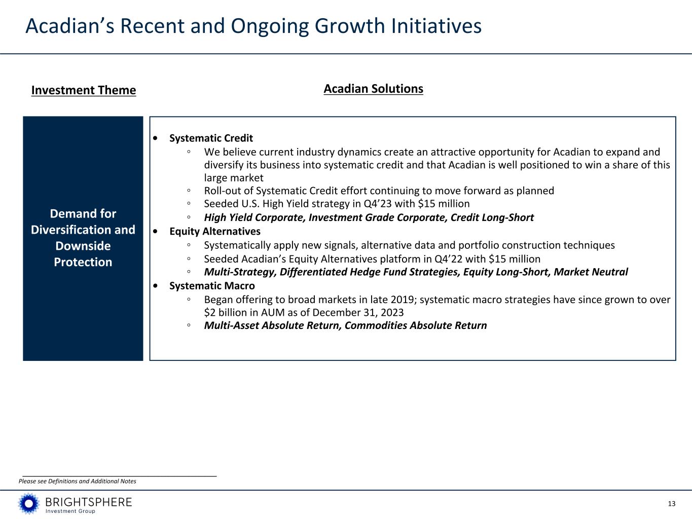12 Sector Tailwinds Expected to Support Organic Long-term Growth Alpha Secular Trends Anticipated Impact for Acadian Acadian Brand and Barriers to Entry Organic Growth Applying Data and Expertise to New Capabilities Explosive Growth in Alternative Data Continued Development of Advanced Techniques: Machine Learning, AI Scale of Investment in Data, Technology, and Talent Increasingly Important Growing Demand for Uncorrelated Strategies and Customization