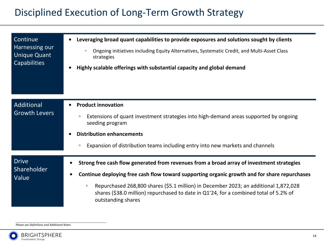 13 • Systematic Credit ◦ We believe current industry dynamics create an attractive opportunity for Acadian to expand and diversify its business into systematic credit and that Acadian is well positioned to win a share of this large market ◦ Roll-out of Systematic Credit effort continuing to move forward as planned ◦ Seeded U.S. High Yield strategy in Q4’23 with $15 million ◦ High Yield Corporate, Investment Grade Corporate, Credit Long-Short • Equity Alternatives ◦ Systematically apply new signals, alternative data and portfolio construction techniques ◦ Seeded Acadian’s Equity Alternatives platform in Q4’22 with $15 million ◦ Multi-Strategy, Differentiated Hedge Fund Strategies, Equity Long-Short, Market Neutral • Systematic Macro ◦ Began offering to broad markets in late 2019; systematic macro strategies have since grown to over $2 billion in AUM as of December 31, 2023 ◦ Multi-Asset Absolute Return, Commodities Absolute Return Demand for Diversification and Downside Protection Acadian’s Recent and Ongoing Growth Initiatives Investment Theme Acadian Solutions __________________________________________________________ Please see Definitions and Additional Notes