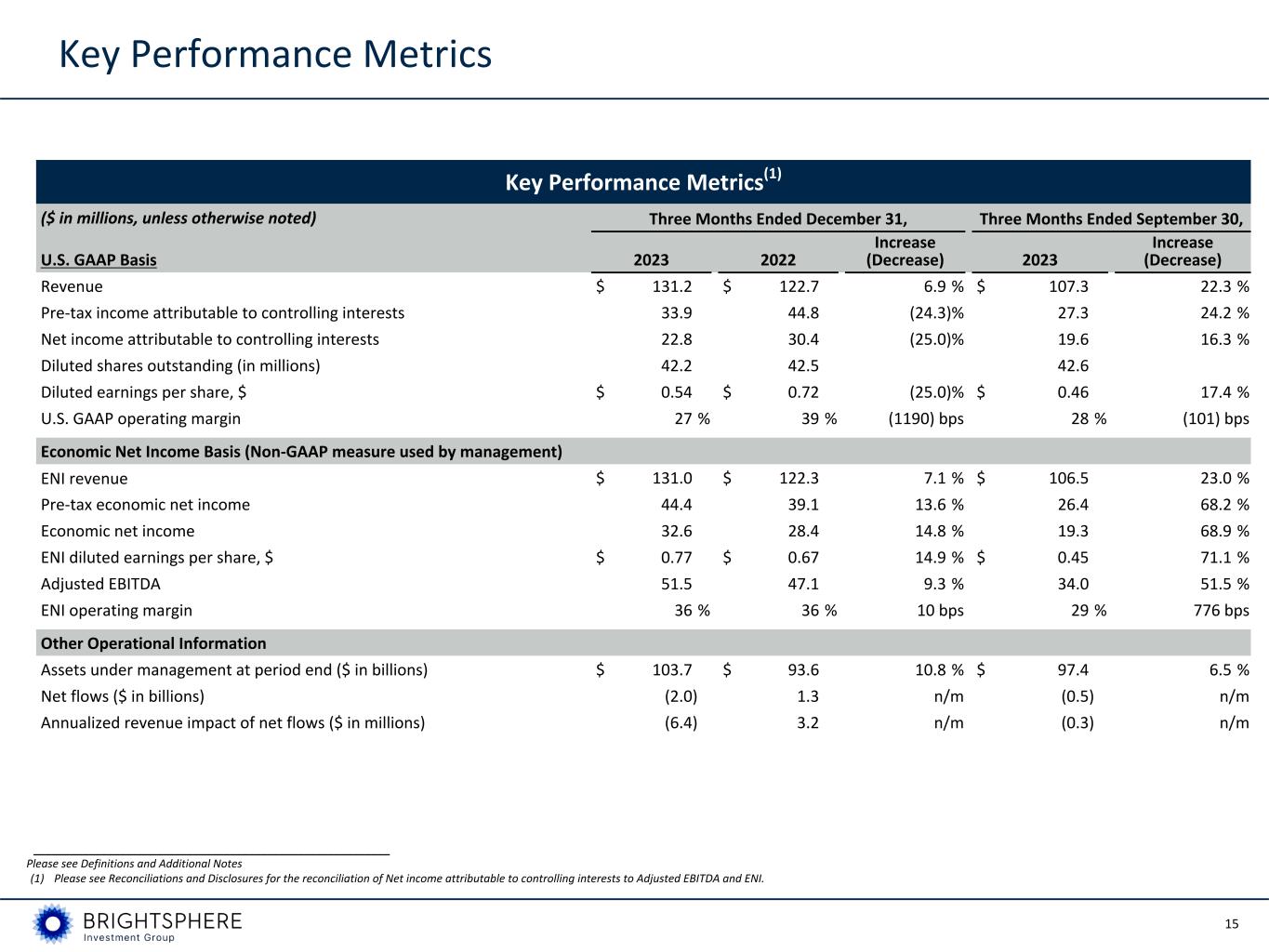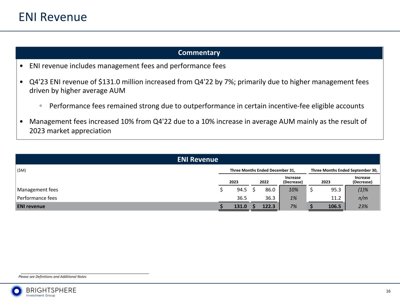 15 Key Performance Metrics Key Performance Metrics(1) ($ in millions, unless otherwise noted) Three Months Ended December 31, Three Months Ended September 30, U.S. GAAP Basis 2023 2022 Increase (Decrease) 2023 Increase (Decrease) Revenue $ 131.2 $ 122.7 6.9 % $ 107.3 22.3 % Pre-tax income attributable to controlling interests 33.9 44.8 (24.3) % 27.3 24.2 % Net income attributable to controlling interests 22.8 30.4 (25.0) % 19.6 16.3 % Diluted shares outstanding (in millions) 42.2 42.5 42.6 Diluted earnings per share, $ $ 0.54 $ 0.72 (25.0) % $ 0.46 17.4 % U.S. GAAP operating margin 27 % 39 % (1190) bps 28 % (101) bps Economic Net Income Basis (Non-GAAP measure used by management) ENI revenue $ 131.0 $ 122.3 7.1 % $ 106.5 23.0 % Pre-tax economic net income 44.4 39.1 13.6 % 26.4 68.2 % Economic net income 32.6 28.4 14.8 % 19.3 68.9 % ENI diluted earnings per share, $ $ 0.77 $ 0.67 14.9 % $ 0.45 71.1 % Adjusted EBITDA 51.5 47.1 9.3 % 34.0 51.5 % ENI operating margin 36 % 36 % 10 bps 29 % 776 bps Other Operational Information Assets under management at period end ($ in billions) $ 103.7 $ 93.6 10.8 % $ 97.4 6.5 % Net flows ($ in billions) (2.0) 1.3 n/m (0.5) n/m Annualized revenue impact of net flows ($ in millions) (6.4) 3.2 n/m (0.3) n/m __________________________________________________________ Please see Definitions and Additional Notes (1) Please see Reconciliations and Disclosures for the reconciliation of Net income attributable to controlling interests to Adjusted EBITDA and ENI.