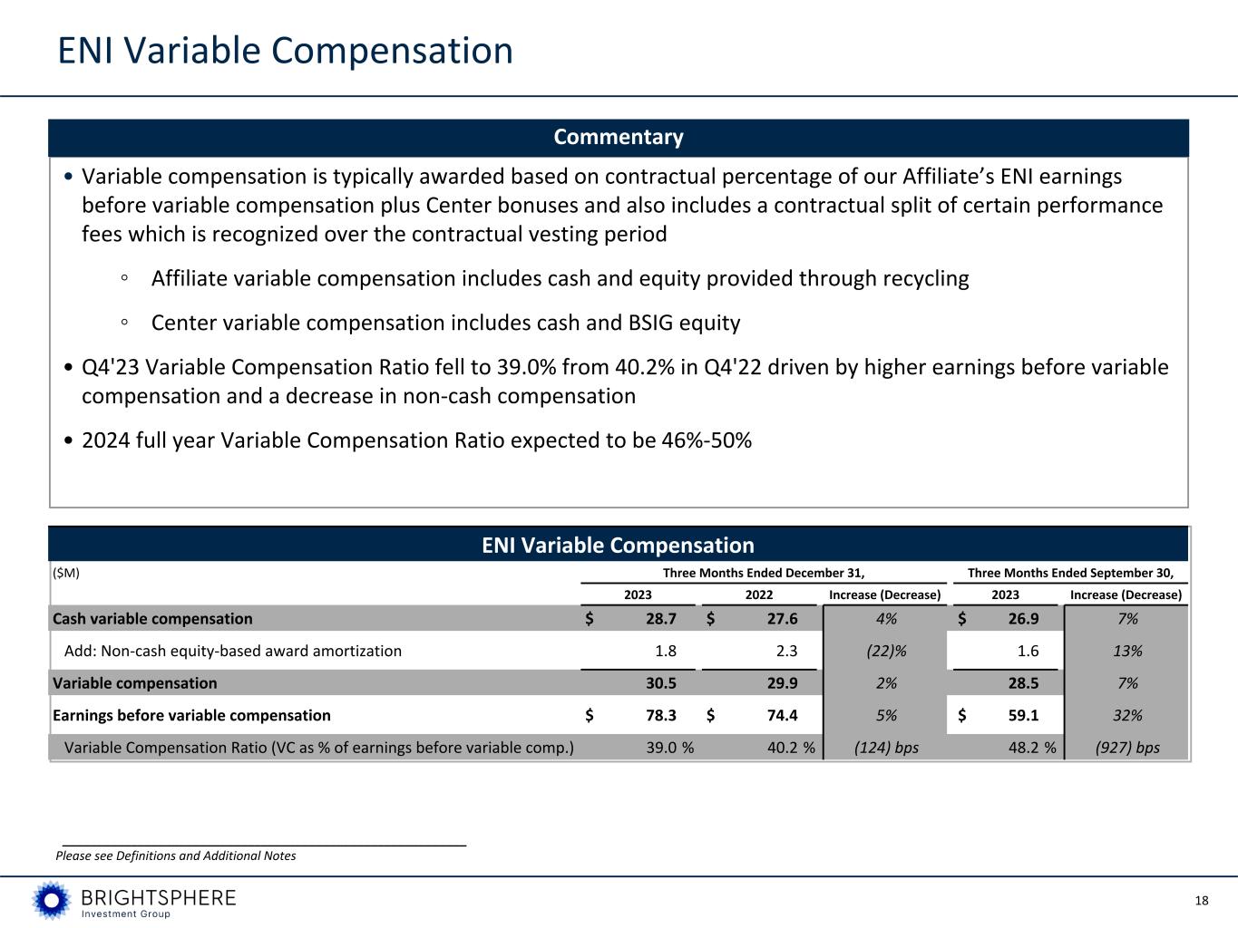 17 ENI Operating Expenses Three Months Ended December 31, Three Months Ended September 30, ($M) 2023 2022 Increase (Decrease) 2023 Increase (Decrease)$M % of MFs(2) $M % of MFs(2) $M % of MFs(2) Fixed compensation and benefits $ 22.9 24.2 % $ 22.2 25.8 % 3% $ 23.1 24.2 % (1)% G&A expenses (excl. sales-based compensation) 22.3 23.6 % 20.0 23.3 % 12% 18.6 19.5 % 20% Depreciation and amortization 4.6 4.9 % 3.7 4.3 % 24% 4.5 4.7 % 2% Core operating expense subtotal $ 49.8 52.7 % $ 45.9 53.4 % 8% $ 46.2 48.5 % 8% Sales-based compensation 2.9 3.1 % 2.0 2.3 % 45% 1.2 1.3 % 142% Total ENI operating expenses $ 52.7 55.8 % $ 47.9 55.7 % 10% $ 47.4 49.7 % 11% Note: ENI management fees $ 94.5 $ 86.0 10% $ 95.3 (1)% • Total ENI operating expenses reflect Affiliate operating expenses and Center expenses (excluding variable compensation) • ENI operating expenses increased to $52.7 million in Q4'23 from $47.9 million in Q4'22 driven by inflation and new investments • Q4'23 Operating Expense Ratio(1) increased to 55.8% for the period from 55.7% in Q4'22 • 2024 full year Operating Expense Ratio expected to be approximately 48%-53% if the equity market remains at the same level; ratio is subject to fluctuations as AUM and ENI management fees change __________________________________________________________ Please see Definitions and Additional Notes (1) Operating Expense Ratio reflects total ENI operating expenses as a percent of management fees. (2) Represents reported ENI management fee revenue. ENI Operating Expenses Commentary