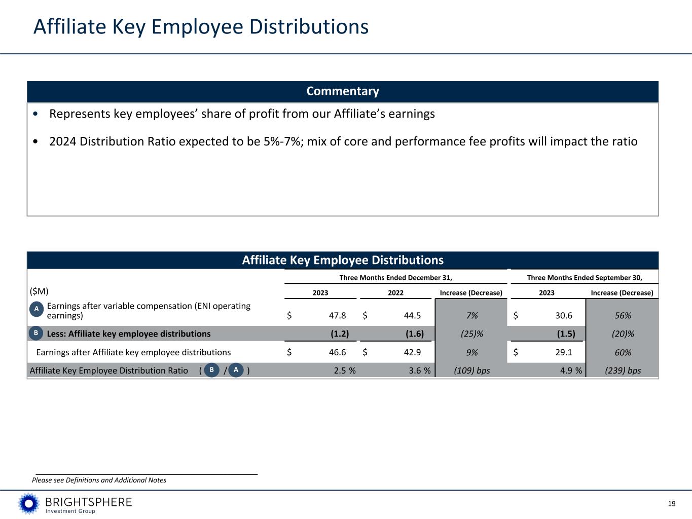 18 ENI Variable Compensation ($M) Three Months Ended December 31, Three Months Ended September 30, 2023 2022 Increase (Decrease) 2023 Increase (Decrease) Cash variable compensation $ 28.7 $ 27.6 4% $ 26.9 7% Add: Non-cash equity-based award amortization 1.8 2.3 (22)% 1.6 13% Variable compensation 30.5 29.9 2% 28.5 7% Earnings before variable compensation $ 78.3 $ 74.4 5% $ 59.1 32% Variable Compensation Ratio (VC as % of earnings before variable comp.) 39.0 % 40.2 % (124) bps 48.2 % (927) bps • Variable compensation is typically awarded based on contractual percentage of our Affiliate’s ENI earnings before variable compensation plus Center bonuses and also includes a contractual split of certain performance fees which is recognized over the contractual vesting period ◦ Affiliate variable compensation includes cash and equity provided through recycling ◦ Center variable compensation includes cash and BSIG equity • Q4'23 Variable Compensation Ratio fell to 39.0% from 40.2% in Q4'22 driven by higher earnings before variable compensation and a decrease in non-cash compensation • 2024 full year Variable Compensation Ratio expected to be 46%-50% ___________________________________________________________ Please see Definitions and Additional Notes ENI Variable Compensation Commentary