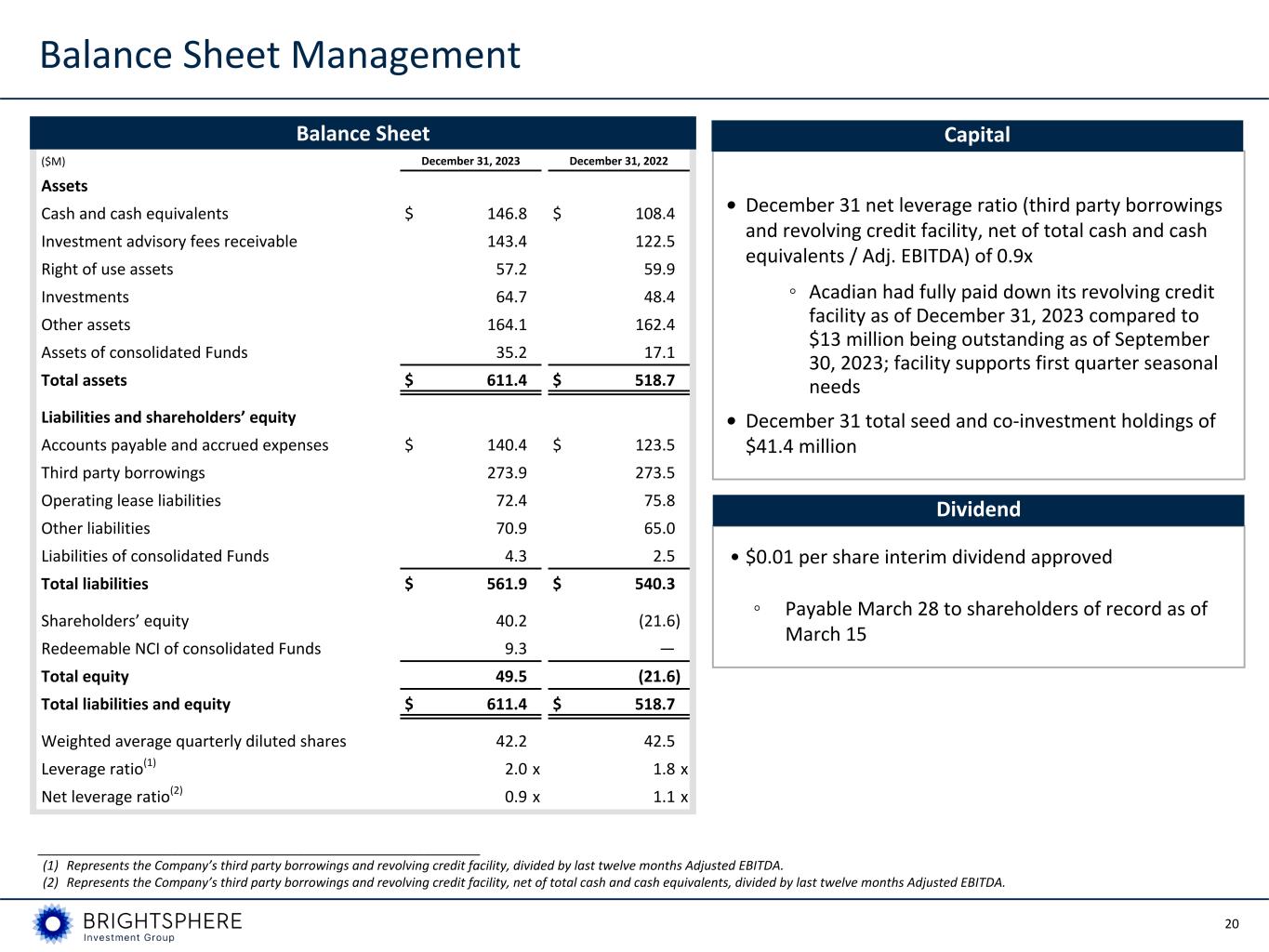 20 Balance Sheet ($M) December 31, 2023 December 31, 2022 Assets Cash and cash equivalents $ 146.8 $ 108.4 Investment advisory fees receivable 143.4 122.5 Right of use assets 57.2 59.9 Investments 64.7 48.4 Other assets 164.1 162.4 Assets of consolidated Funds 35.2 17.1 Total assets $ 611.4 $ 518.7 Liabilities and shareholders’ equity Accounts payable and accrued expenses $ 140.4 $ 123.5 Third party borrowings 273.9 273.5 Operating lease liabilities 72.4 75.8 Other liabilities 70.9 65.0 Liabilities of consolidated Funds 4.3 2.5 Total liabilities $ 561.9 $ 540.3 Shareholders’ equity 40.2 (21.6) Redeemable NCI of consolidated Funds 9.3 — Total equity 49.5 (21.6) Total liabilities and equity $ 611.4 $ 518.7 Weighted average quarterly diluted shares 42.2 42.5 Leverage ratio(1) 2.0 x 1.8 x Net leverage ratio(2) 0.9 x 1.1 x Balance Sheet Management • $0.01 per share interim dividend approved ◦ Payable March 28 to shareholders of record as of March 15 • December 31 net leverage ratio (third party borrowings and revolving credit facility, net of total cash and cash equivalents / Adj. EBITDA) of 0.9x ◦ Acadian had fully paid down its revolving credit facility as of December 31, 2023 compared to $13 million being outstanding as of September 30, 2023; facility supports first quarter seasonal needs • December 31 total seed and co-investment holdings of $41.4 million Capital Dividend _______________________________________________________________ (1) Represents the Company’s third party borrowings and revolving credit facility, divided by last twelve months Adjusted EBITDA. (2) Represents the Company’s third party borrowings and revolving credit facility, net of total cash and cash equivalents, divided by last twelve months Adjusted EBITDA.