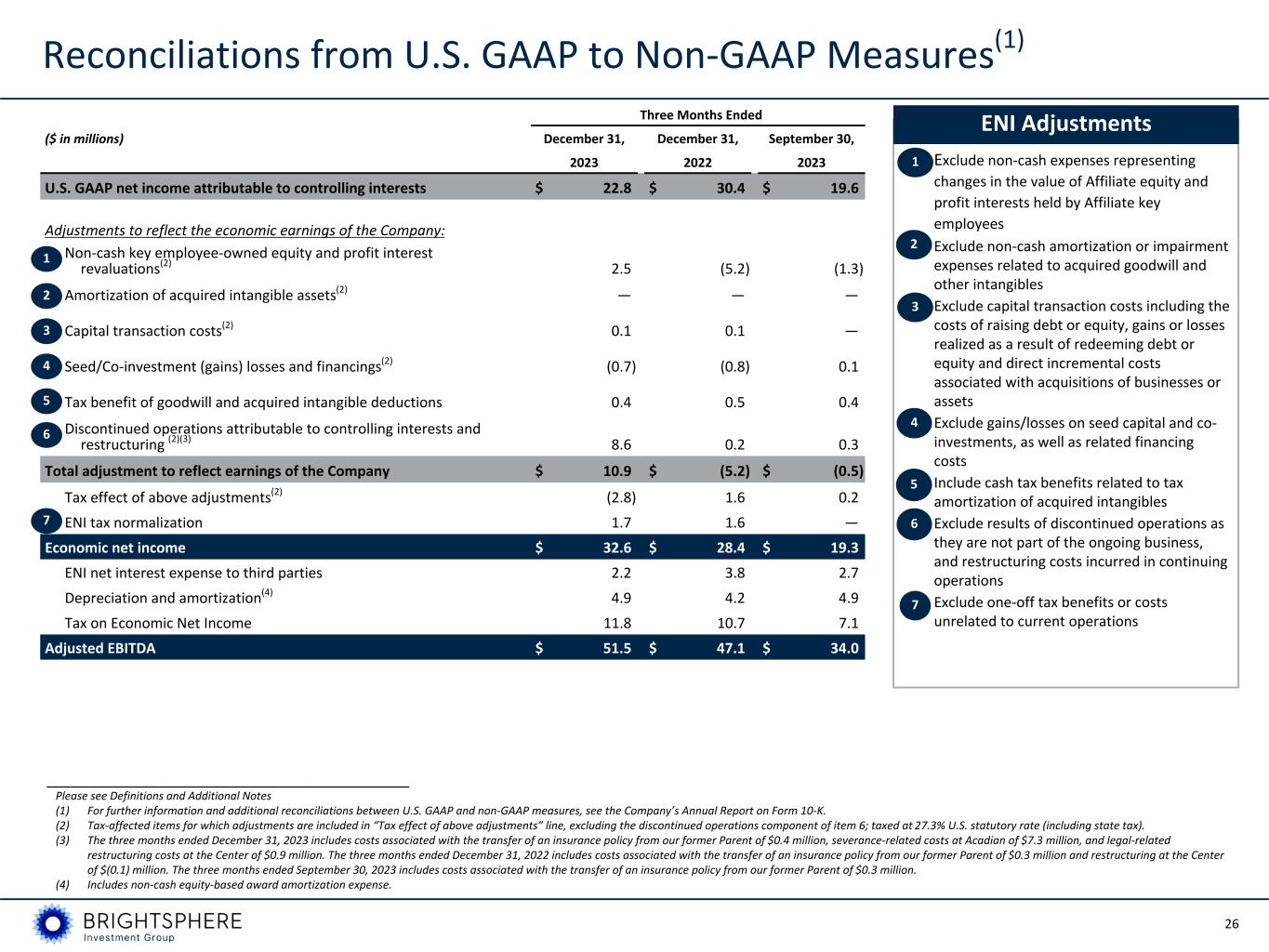 31 The Company adjusts its income tax expense to reflect any tax impact of its ENI adjustments. Adjusted EBITDA Adjusted EBITDA is defined as economic net income before interest, income taxes, depreciation and amortization. The Company notes that its calculation of Adjusted EBITDA may not be consistent with Adjusted EBITDA as calculated by other companies. The Company believes Adjusted EBITDA is a useful liquidity metric because it indicates the Company’s ability to make further investments in its business, service debt and meet working capital requirements. Refer to the reconciliation of U.S. GAAP net income attributable to controlling interests to ENI and Adjusted EBITDA. Segment ENI Segment ENI represents ENI for the Company’s reportable segment, calculated in accordance with the Company’s definition of Economic Net Income, before income tax, interest income and interest expense. Methodologies for calculating investment performance: Revenue-weighted investment performance measures the percentage of management fee revenue generated by Affiliate strategies which are beating benchmarks. It calculates each strategy’s percentage weight by taking its estimated composite revenue over total composite revenues in each period, then sums the total percentage of revenue for strategies outperforming. Equal-weighted investment performance measures the percentage of Affiliate scale strategies (defined as strategies with greater than $100 million of AUM) beating benchmarks. Each outperforming strategy over $100 million has the same weight; the calculation sums the number of strategies outperforming relative to the total number of composites over $100 million. Asset-weighted investment performance measures the percentage of AUM in strategies beating benchmarks. It calculates each strategy’s percentage weight by taking its composite AUM over total composite AUM in each period, then sums the total percentage of AUM for strategies outperforming. ENI operating earnings ENI operating earnings represents ENI earnings before Affiliate key employee distributions and is calculated as ENI revenue, less ENI operating expense, less ENI variable compensation. It differs from economic net income because it does not include the effects of Affiliate key employee distributions, net interest expense or income tax expense. ENI operating margin The ENI operating margin, which is calculated before Affiliate key employee distributions, is used by management and is useful to investors to evaluate the overall operating margin of the business without regard to the Company’s various ownership levels at each of the Affiliates. ENI operating margin is a non-GAAP efficiency measure, calculated based on ENI operating earnings divided by ENI revenue. The ENI operating margin is most comparable to the Company’s U.S. GAAP operating margin. ENI management fee revenue ENI management fee revenue corresponds to U.S. GAAP management fee revenue. ENI operating expense ratio The ENI operating expense ratio is used by management and is useful to investors to evaluate the level of operating expense as measured against the Company’s recurring management fee revenue. The Company has provided this ratio since many operating expenses, including fixed compensation & benefits and general and administrative expense, are generally linked to the overall size of the business. The Company tracks this ratio as a key measure of scale economies at BrightSphere because in its profit sharing economic model, scale benefits both the Affiliate employees and BrightSphere shareholders. Definitions and Additional Notes