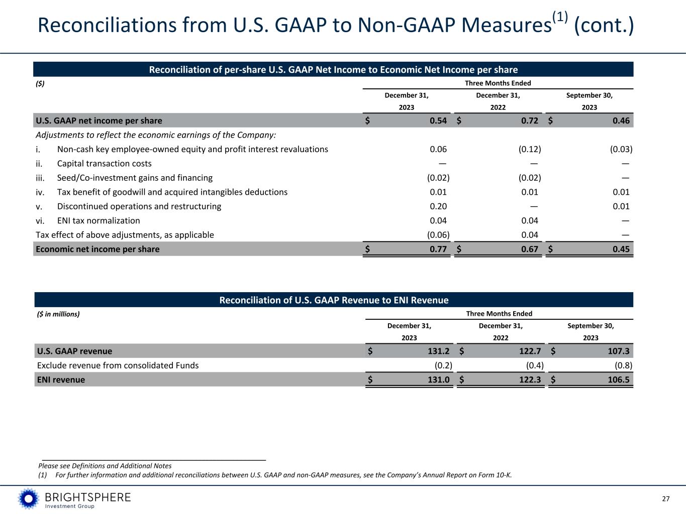 26 Three Months Ended ($ in millions) December 31, December 31, September 30, 2023 2022 2023 U.S. GAAP net income attributable to controlling interests $ 22.8 $ 30.4 $ 19.6 Adjustments to reflect the economic earnings of the Company: Non-cash key employee-owned equity and profit interest revaluations(2) 2.5 (5.2) (1.3) Amortization of acquired intangible assets(2) — — — Capital transaction costs(2) 0.1 0.1 — Seed/Co-investment (gains) losses and financings(2) (0.7) (0.8) 0.1 Tax benefit of goodwill and acquired intangible deductions 0.4 0.5 0.4 Discontinued operations attributable to controlling interests and restructuring (2)(3) 8.6 0.2 0.3 Total adjustment to reflect earnings of the Company $ 10.9 $ (5.2) $ (0.5) Tax effect of above adjustments(2) (2.8) 1.6 0.2 ENI tax normalization 1.7 1.6 — Economic net income $ 32.6 $ 28.4 $ 19.3 ENI net interest expense to third parties 2.2 3.8 2.7 Depreciation and amortization(4) 4.9 4.2 4.9 Tax on Economic Net Income 11.8 10.7 7.1 Adjusted EBITDA $ 51.5 $ 47.1 $ 34.0 Reconciliations from U.S. GAAP to Non-GAAP Measures(1) i. Exclude non-cash expenses representing changes in the value of Affiliate equity and profit interests held by Affiliate key employees ii. Exclude non-cash amortization or impairment expenses related to acquired goodwill and other intangibles iii.Exclude capital transaction costs including the costs of raising debt or equity, gains or losses realized as a result of redeeming debt or equity and direct incremental costs associated with acquisitions of businesses or assets iv.Exclude gains/losses on seed capital and co- investments, as well as related financing costs v. Include cash tax benefits related to tax amortization of acquired intangibles vi.Exclude results of discontinued operations as they are not part of the ongoing business, and restructuring costs incurred in continuing operations vii. Exclude one-off tax benefits or costs unrelated to current operations ENI Adjustments 1 3 2 3 4 5 7 6 2 1 4 5 6 7 ___________________________________________________________ Please see Definitions and Additional Notes (1) For further information and additional reconciliations between U.S. GAAP and non-GAAP measures, see the Company’s Annual Report on Form 10-K. (2) Tax-affected items for which adjustments are included in “Tax effect of above adjustments” line, excluding the discontinued operations component of item 6; taxed at 27.3% U.S. statutory rate (including state tax). (3) The three months ended December 31, 2023 includes costs associated with the transfer of an insurance policy from our former Parent of $0.4 million, severance-related costs at Acadian of $7.3 million, and legal-related restructuring costs at the Center of $0.9 million. The three months ended December 31, 2022 includes costs associated with the transfer of an insurance policy from our former Parent of $0.3 million and restructuring at the Center of $(0.1) million. The three months ended September 30, 2023 includes costs associated with the transfer of an insurance policy from our former Parent of $0.3 million. (4) Includes non-cash equity-based award amortization expense.