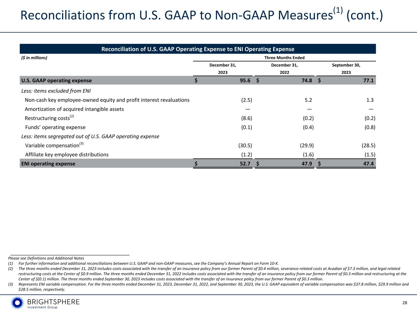 27 Reconciliations from U.S. GAAP to Non-GAAP Measures(1) (cont.) Reconciliation of per-share U.S. GAAP Net Income to Economic Net Income per share ($) Three Months Ended December 31, December 31, September 30, 2023 2022 2023 U.S. GAAP net income per share $ 0.54 $ 0.72 $ 0.46 Adjustments to reflect the economic earnings of the Company: i. Non-cash key employee-owned equity and profit interest revaluations 0.06 (0.12) (0.03) ii. Capital transaction costs — — — iii. Seed/Co-investment gains and financing (0.02) (0.02) — iv. Tax benefit of goodwill and acquired intangibles deductions 0.01 0.01 0.01 v. Discontinued operations and restructuring 0.20 — 0.01 vi. ENI tax normalization 0.04 0.04 — Tax effect of above adjustments, as applicable (0.06) 0.04 — Economic net income per share $ 0.77 $ 0.67 $ 0.45 Reconciliation of U.S. GAAP Revenue to ENI Revenue ($ in millions) Three Months Ended December 31, December 31, September 30, 2023 2022 2023 U.S. GAAP revenue $ 131.2 $ 122.7 $ 107.3 Exclude revenue from consolidated Funds (0.2) (0.4) (0.8) ENI revenue $ 131.0 $ 122.3 $ 106.5 ___________________________________________________________ Please see Definitions and Additional Notes (1) For further information and additional reconciliations between U.S. GAAP and non-GAAP measures, see the Company’s Annual Report on Form 10-K.