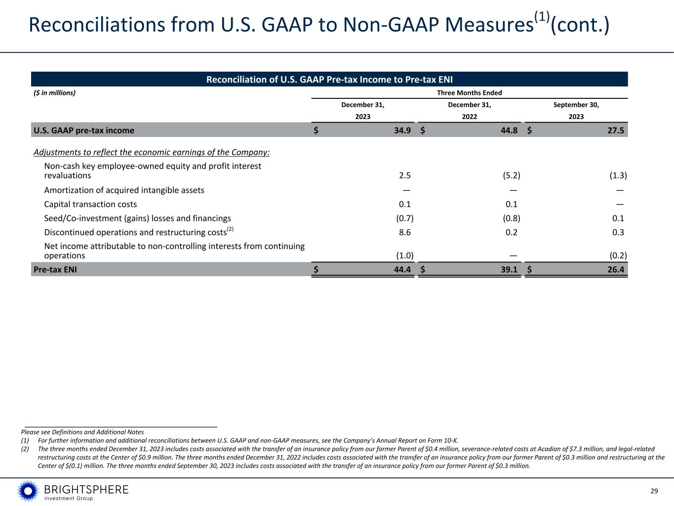 28 Reconciliations from U.S. GAAP to Non-GAAP Measures(1) (cont.) Reconciliation of U.S. GAAP Operating Expense to ENI Operating Expense ($ in millions) Three Months Ended December 31, December 31, September 30, 2023 2022 2023 U.S. GAAP operating expense $ 95.6 $ 74.8 $ 77.1 Less: items excluded from ENI Non-cash key employee-owned equity and profit interest revaluations (2.5) 5.2 1.3 Amortization of acquired intangible assets — — — Restructuring costs(2) (8.6) (0.2) (0.2) Funds’ operating expense (0.1) (0.4) (0.8) Less: items segregated out of U.S. GAAP operating expense Variable compensation(3) (30.5) (29.9) (28.5) Affiliate key employee distributions (1.2) (1.6) (1.5) ENI operating expense $ 52.7 $ 47.9 $ 47.4 ___________________________________________________________ Please see Definitions and Additional Notes (1) For further information and additional reconciliations between U.S. GAAP and non-GAAP measures, see the Company’s Annual Report on Form 10-K. (2) The three months ended December 31, 2023 includes costs associated with the transfer of an insurance policy from our former Parent of $0.4 million, severance-related costs at Acadian of $7.3 million, and legal-related restructuring costs at the Center of $0.9 million. The three months ended December 31, 2022 includes costs associated with the transfer of an insurance policy from our former Parent of $0.3 million and restructuring at the Center of $(0.1) million. The three months ended September 30, 2023 includes costs associated with the transfer of an insurance policy from our former Parent of $0.3 million. (3) Represents ENI variable compensation. For the three months ended December 31, 2023, December 31, 2022, and September 30, 2023, the U.S. GAAP equivalent of variable compensation was $37.8 million, $29.9 million and $28.5 million, respectively.