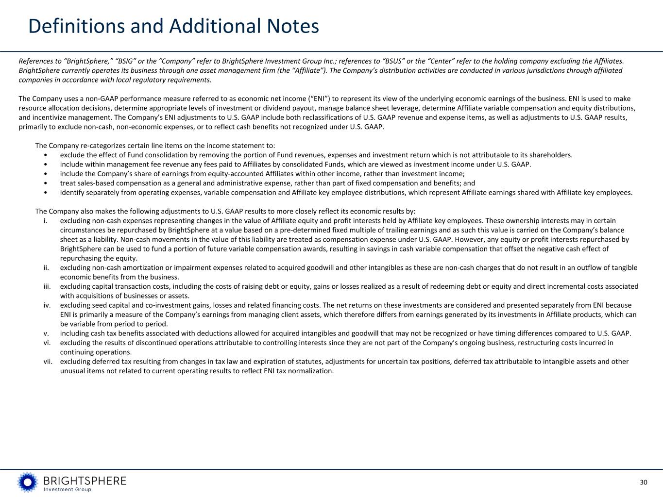 30 Definitions and Additional Notes References to “BrightSphere,” “BSIG” or the “Company” refer to BrightSphere Investment Group Inc.; references to “BSUS” or the “Center” refer to the holding company excluding the Affiliates. BrightSphere currently operates its business through one asset management firm (the “Affiliate”). The Company’s distribution activities are conducted in various jurisdictions through affiliated companies in accordance with local regulatory requirements. The Company uses a non-GAAP performance measure referred to as economic net income (“ENI”) to represent its view of the underlying economic earnings of the business. ENI is used to make resource allocation decisions, determine appropriate levels of investment or dividend payout, manage balance sheet leverage, determine Affiliate variable compensation and equity distributions, and incentivize management. The Company’s ENI adjustments to U.S. GAAP include both reclassifications of U.S. GAAP revenue and expense items, as well as adjustments to U.S. GAAP results, primarily to exclude non-cash, non-economic expenses, or to reflect cash benefits not recognized under U.S. GAAP. The Company re-categorizes certain line items on the income statement to: • exclude the effect of Fund consolidation by removing the portion of Fund revenues, expenses and investment return which is not attributable to its shareholders. • include within management fee revenue any fees paid to Affiliates by consolidated Funds, which are viewed as investment income under U.S. GAAP. • include the Company’s share of earnings from equity-accounted Affiliates within other income, rather than investment income; • treat sales-based compensation as a general and administrative expense, rather than part of fixed compensation and benefits; and • identify separately from operating expenses, variable compensation and Affiliate key employee distributions, which represent Affiliate earnings shared with Affiliate key employees. The Company also makes the following adjustments to U.S. GAAP results to more closely reflect its economic results by: i. excluding non-cash expenses representing changes in the value of Affiliate equity and profit interests held by Affiliate key employees. These ownership interests may in certain circumstances be repurchased by BrightSphere at a value based on a pre-determined fixed multiple of trailing earnings and as such this value is carried on the Company’s balance sheet as a liability. Non-cash movements in the value of this liability are treated as compensation expense under U.S. GAAP. However, any equity or profit interests repurchased by BrightSphere can be used to fund a portion of future variable compensation awards, resulting in savings in cash variable compensation that offset the negative cash effect of repurchasing the equity. ii. excluding non-cash amortization or impairment expenses related to acquired goodwill and other intangibles as these are non-cash charges that do not result in an outflow of tangible economic benefits from the business. iii. excluding capital transaction costs, including the costs of raising debt or equity, gains or losses realized as a result of redeeming debt or equity and direct incremental costs associated with acquisitions of businesses or assets. iv. excluding seed capital and co-investment gains, losses and related financing costs. The net returns on these investments are considered and presented separately from ENI because ENI is primarily a measure of the Company’s earnings from managing client assets, which therefore differs from earnings generated by its investments in Affiliate products, which can be variable from period to period. v. including cash tax benefits associated with deductions allowed for acquired intangibles and goodwill that may not be recognized or have timing differences compared to U.S. GAAP. vi. excluding the results of discontinued operations attributable to controlling interests since they are not part of the Company’s ongoing business, restructuring costs incurred in continuing operations. vii. excluding deferred tax resulting from changes in tax law and expiration of statutes, adjustments for uncertain tax positions, deferred tax attributable to intangible assets and other unusual items not related to current operating results to reflect ENI tax normalization.