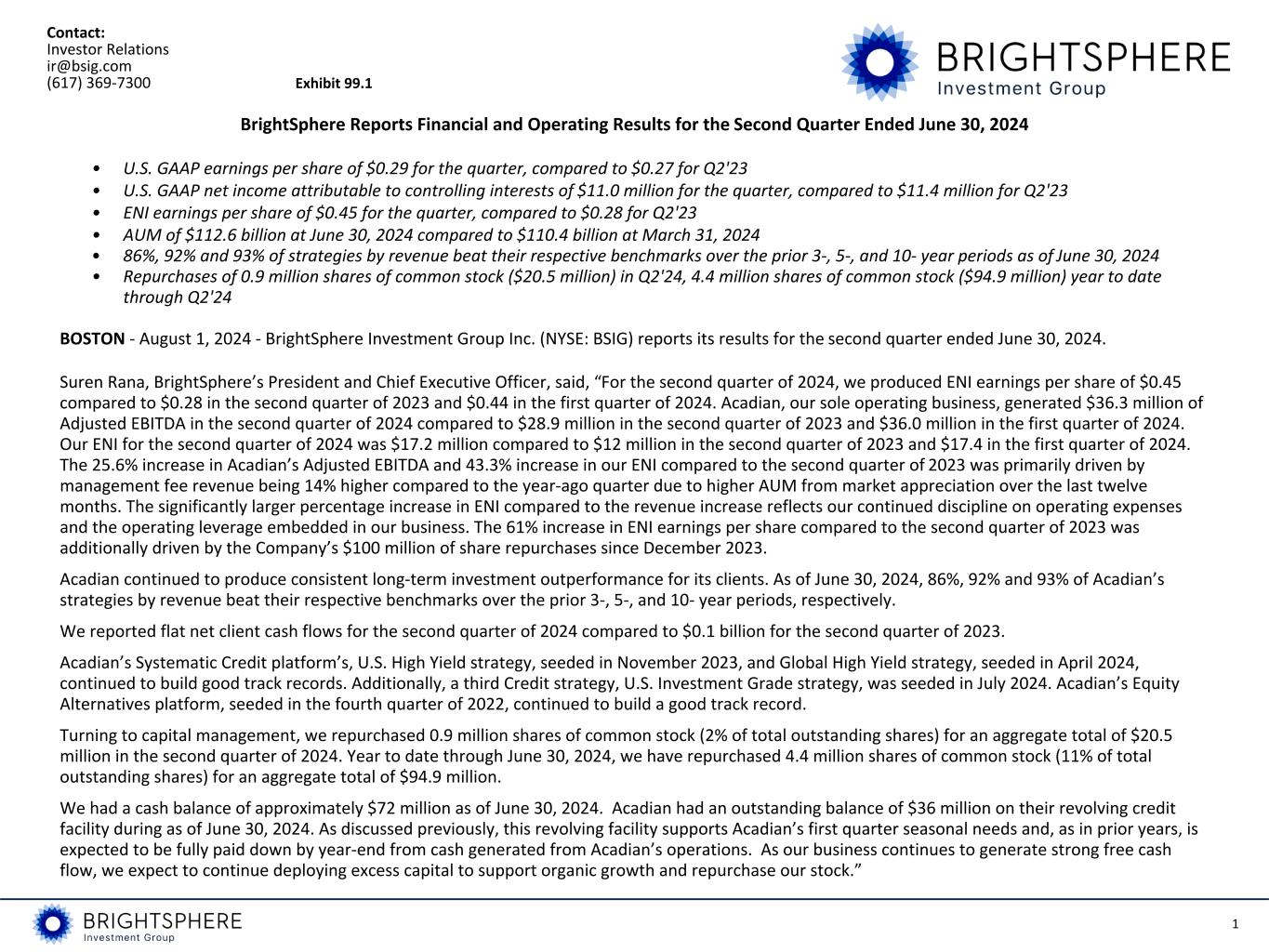 1 Contact: Investor Relations ir@bsig.com (617) 369-7300 Exhibit 99.1 BrightSphere Reports Financial and Operating Results for the Second Quarter Ended June 30, 2024 • U.S. GAAP earnings per share of $0.29 for the quarter, compared to $0.27 for Q2'23 • U.S. GAAP net income attributable to controlling interests of $11.0 million for the quarter, compared to $11.4 million for Q2'23 • ENI earnings per share of $0.45 for the quarter, compared to $0.28 for Q2'23 • AUM of $112.6 billion at June 30, 2024 compared to $110.4 billion at March 31, 2024 • 86%, 92% and 93% of strategies by revenue beat their respective benchmarks over the prior 3-, 5-, and 10- year periods as of June 30, 2024 • Repurchases of 0.9 million shares of common stock ($20.5 million) in Q2'24, 4.4 million shares of common stock ($94.9 million) year to date through Q2'24 BOSTON - August 1, 2024 - BrightSphere Investment Group Inc. (NYSE: BSIG) reports its results for the second quarter ended June 30, 2024. Suren Rana, BrightSphere’s President and Chief Executive Officer, said, “For the second quarter of 2024, we produced ENI earnings per share of $0.45 compared to $0.28 in the second quarter of 2023 and $0.44 in the first quarter of 2024. Acadian, our sole operating business, generated $36.3 million of Adjusted EBITDA in the second quarter of 2024 compared to $28.9 million in the second quarter of 2023 and $36.0 million in the first quarter of 2024. Our ENI for the second quarter of 2024 was $17.2 million compared to $12 million in the second quarter of 2023 and $17.4 in the first quarter of 2024. The 25.6% increase in Acadian’s Adjusted EBITDA and 43.3% increase in our ENI compared to the second quarter of 2023 was primarily driven by management fee revenue being 14% higher compared to the year-ago quarter due to higher AUM from market appreciation over the last twelve months. The significantly larger percentage increase in ENI compared to the revenue increase reflects our continued discipline on operating expenses and the operating leverage embedded in our business. The 61% increase in ENI earnings per share compared to the second quarter of 2023 was additionally driven by the Company’s $100 million of share repurchases since December 2023. Acadian continued to produce consistent long-term investment outperformance for its clients. As of June 30, 2024, 86%, 92% and 93% of Acadian’s strategies by revenue beat their respective benchmarks over the prior 3-, 5-, and 10- year periods, respectively. We reported flat net client cash flows for the second quarter of 2024 compared to $0.1 billion for the second quarter of 2023. Acadian’s Systematic Credit platform’s, U.S. High Yield strategy, seeded in November 2023, and Global High Yield strategy, seeded in April 2024, continued to build good track records. Additionally, a third Credit strategy, U.S. Investment Grade strategy, was seeded in July 2024. Acadian’s Equity Alternatives platform, seeded in the fourth quarter of 2022, continued to build a good track record. Turning to capital management, we repurchased 0.9 million shares of common stock (2% of total outstanding shares) for an aggregate total of $20.5 million in the second quarter of 2024. Year to date through June 30, 2024, we have repurchased 4.4 million shares of common stock (11% of total outstanding shares) for an aggregate total of $94.9 million. We had a cash balance of approximately $72 million as of June 30, 2024. Acadian had an outstanding balance of $36 million on their revolving credit facility during as of June 30, 2024. As discussed previously, this revolving facility supports Acadian’s first quarter seasonal needs and, as in prior years, is expected to be fully paid down by year-end from cash generated from Acadian’s operations. As our business continues to generate strong free cash flow, we expect to continue deploying excess capital to support organic growth and repurchase our stock.”