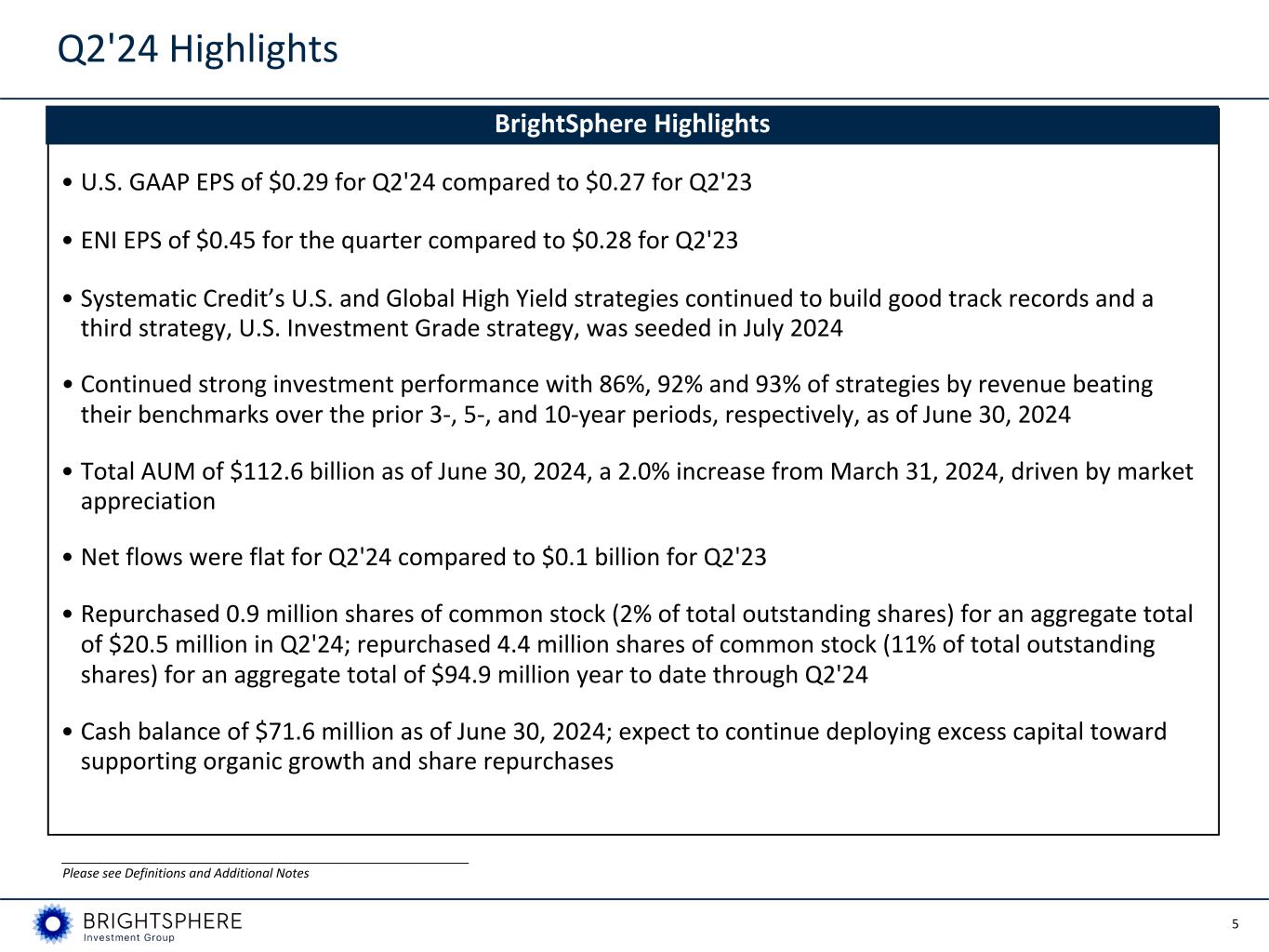 5 • U.S. GAAP EPS of $0.29 for Q2'24 compared to $0.27 for Q2'23 • ENI EPS of $0.45 for the quarter compared to $0.28 for Q2'23 • Systematic Credit’s U.S. and Global High Yield strategies continued to build good track records and a third strategy, U.S. Investment Grade strategy, was seeded in July 2024 • Continued strong investment performance with 86%, 92% and 93% of strategies by revenue beating their benchmarks over the prior 3-, 5-, and 10-year periods, respectively, as of June 30, 2024 • Total AUM of $112.6 billion as of June 30, 2024, a 2.0% increase from March 31, 2024, driven by market appreciation • Net flows were flat for Q2'24 compared to $0.1 billion for Q2'23 • Repurchased 0.9 million shares of common stock (2% of total outstanding shares) for an aggregate total of $20.5 million in Q2'24; repurchased 4.4 million shares of common stock (11% of total outstanding shares) for an aggregate total of $94.9 million year to date through Q2'24 • Cash balance of $71.6 million as of June 30, 2024; expect to continue deploying excess capital toward supporting organic growth and share repurchases BrightSphere Highlights Q2'24 Highlights __________________________________________________________ Please see Definitions and Additional Notes