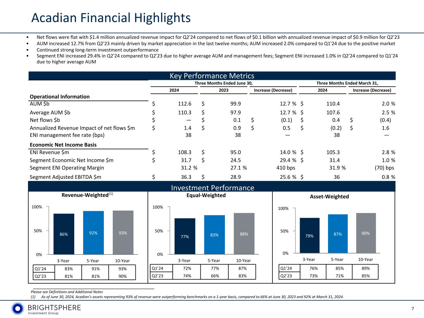 6 U.S. GAAP Statement of Operations ($ in millions, unless otherwise noted) Three Months Ended June 30, June 30, Increase (Decrease) March 31, 2024 2023 2024 Management fees $ 105.5 $ 92.8 13.7 % $ 102.2 Performance fees 2.8 2.2 27.3 % 3.1 Consolidated Funds’ revenue 0.7 1.3 (46.2) % 0.4 Total revenue 109.0 96.3 13.2 % 105.7 Compensation and benefits 62.2 48.5 28.2 % 58.1 General and administrative 21.1 21.8 (3.2) % 20.0 Depreciation and amortization 5.0 4.4 13.6 % 4.6 Consolidated Funds’ expense 0.1 1.2 (91.7) % 0.1 Total operating expenses 88.4 75.9 16.5 % 82.8 Operating income 20.6 20.4 1.0 % 22.9 Investment income 0.1 0.2 (50.0) % 0.9 Interest income 0.9 1.5 (40.0) % 1.3 Interest expense (5.3) (5.4) (1.9) % (5.0) Net consolidated Funds’ investment losses 0.8 0.3 n/m 1.7 Income before income taxes 17.1 17.0 0.6 % 21.8 Income tax expense 5.6 5.5 1.8 % 6.1 Net income 11.5 11.5 — % 15.7 Net income attributable to non-controlling interests 0.5 0.1 n/m 1.1 Net income attributable to controlling interests $ 11.0 $ 11.4 (3.5) % $ 14.6 Earnings per share, basic, $ $ 0.29 $ 0.27 7.4 % $ 0.37 Earnings per share, diluted, $ $ 0.29 $ 0.27 7.4 % $ 0.37 Average basic shares outstanding (in millions) 37.5 41.5 39.1 Average diluted shares outstanding (in millions) 38.2 42.6 39.7 U.S. GAAP operating margin 19 % 21 % (228) bps 22 % Pre-tax income attributable to controlling interests $ 16.6 $ 16.9 (1.8) % $ 20.7 Net income attributable to controlling interests $ 11.0 $ 11.4 (3.5) % $ 14.6 Q2'24 vs. Q2'23 __________________________________________________________ Please see Definitions and Additional Notes • Total revenue increased 13.2% from Q2'23 primarily due to higher management fees reflecting an increase in average AUM in Q2'24 compared to Q2'23 • Operating expenses increased 16.5% from Q2'23 driven by an increase in compensation and benefits expense due to an increase in the value of the Acadian equity plan liability in Q2'24 and an increase in variable compensation • Income tax expense increased 1.8% from Q2'23 primarily driven by changes in discrete tax items, partially offset by a decrease in pre-tax income attributable to controlling interests • U.S. GAAP net income attributable to controlling interests decreased 3.5% from Q2'23 primarily due to an increase in operating expenses • Diluted earnings per share increased 7.4% from Q2'23 reflecting the positive impact of stock repurchases made year to date through Q2'24 that decreased average diluted shares outstanding