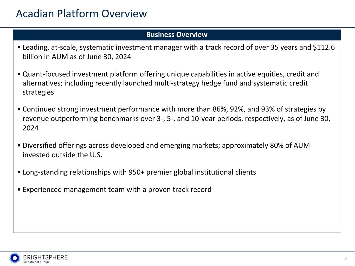 7 Revenue-Weighted 86% 92% 93% 3-Year 5-Year 10-Year 0% 50% 100% Equal-Weighted 77% 83% 88% 3-Year 5-Year 10-Year 0% 50% 100% Acadian Financial Highlights • Net flows were flat with $1.4 million annualized revenue impact for Q2'24 compared to net flows of $0.1 billion with annualized revenue impact of $0.9 million for Q2'23 • AUM increased 12.7% from Q2'23 mainly driven by market appreciation in the last twelve months; AUM increased 2.0% compared to Q1'24 due to the positive market • Continued strong long-term investment outperformance • Segment ENI increased 29.4% in Q2'24 compared to Q2'23 due to higher average AUM and management fees; Segment ENI increased 1.0% in Q2'24 compared to Q1'24 due to higher average AUM Investment Performance Q1’24 83% 91% 93% Q2’23 81% 81% 90% Q1’24 72% 77% 87% Q2’23 74% 66% 83% Asset-Weighted 79% 87% 90% 3-Year 5-Year 10-Year 0% 50% 100% Q1’24 76% 85% 89% Q2’23 73% 71% 85% Key Performance Metrics Three Months Ended June 30, Three Months Ended March 31, 2024 2023 Increase (Decrease) 2024 Increase (Decrease) Operational Information AUM $b $ 112.6 $ 99.9 12.7 % $ 110.4 2.0 % Average AUM $b $ 110.3 $ 97.9 12.7 % $ 107.6 2.5 % Net flows $b $ — $ 0.1 $ (0.1) $ 0.4 $ (0.4) Annualized Revenue Impact of net flows $m $ 1.4 $ 0.9 $ 0.5 $ (0.2) $ 1.6 ENI management fee rate (bps) 38 38 — 38 — Economic Net Income Basis ENI Revenue $m $ 108.3 $ 95.0 14.0 % $ 105.3 2.8 % Segment Economic Net Income $m $ 31.7 $ 24.5 29.4 % $ 31.4 1.0 % Segment ENI Operating Margin 31.2 % 27.1 % 410 bps 31.9 % (70) bps Segment Adjusted EBITDA $m $ 36.3 $ 28.9 25.6 % $ 36 0.8 % ___________________________________________________________ Please see Definitions and Additional Notes (1) As of June 30, 2024, Acadian’s assets representing 93% of revenue were outperforming benchmarks on a 1-year basis, compared to 66% at June 30, 2023 and 92% at March 31, 2024. (1)