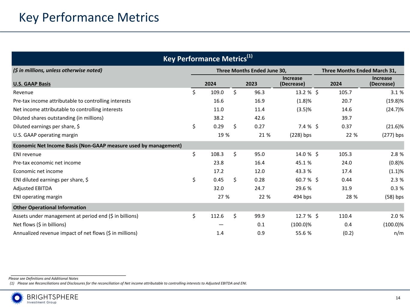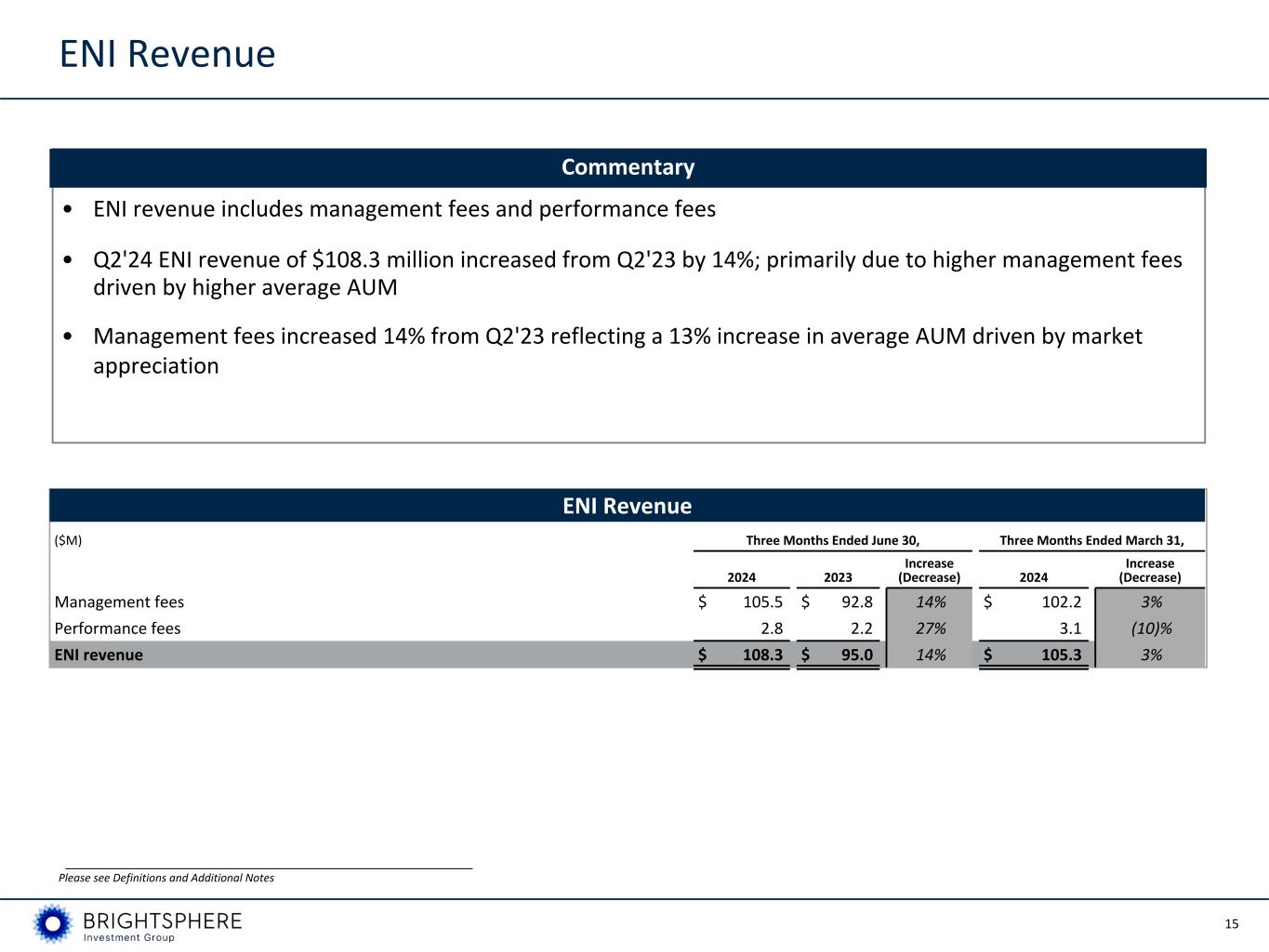 14 Key Performance Metrics Key Performance Metrics(1) ($ in millions, unless otherwise noted) Three Months Ended June 30, Three Months Ended March 31, U.S. GAAP Basis 2024 2023 Increase (Decrease) 2024 Increase (Decrease) Revenue $ 109.0 $ 96.3 13.2 % $ 105.7 3.1 % Pre-tax income attributable to controlling interests 16.6 16.9 (1.8) % 20.7 (19.8) % Net income attributable to controlling interests 11.0 11.4 (3.5) % 14.6 (24.7) % Diluted shares outstanding (in millions) 38.2 42.6 39.7 Diluted earnings per share, $ $ 0.29 $ 0.27 7.4 % $ 0.37 (21.6) % U.S. GAAP operating margin 19 % 21 % (228) bps 22 % (277) bps Economic Net Income Basis (Non-GAAP measure used by management) ENI revenue $ 108.3 $ 95.0 14.0 % $ 105.3 2.8 % Pre-tax economic net income 23.8 16.4 45.1 % 24.0 (0.8) % Economic net income 17.2 12.0 43.3 % 17.4 (1.1) % ENI diluted earnings per share, $ $ 0.45 $ 0.28 60.7 % $ 0.44 2.3 % Adjusted EBITDA 32.0 24.7 29.6 % 31.9 0.3 % ENI operating margin 27 % 22 % 494 bps 28 % (58) bps Other Operational Information Assets under management at period end ($ in billions) $ 112.6 $ 99.9 12.7 % $ 110.4 2.0 % Net flows ($ in billions) — 0.1 (100.0) % 0.4 (100.0) % Annualized revenue impact of net flows ($ in millions) 1.4 0.9 55.6 % (0.2) n/m __________________________________________________________ Please see Definitions and Additional Notes (1) Please see Reconciliations and Disclosures for the reconciliation of Net income attributable to controlling interests to Adjusted EBITDA and ENI.