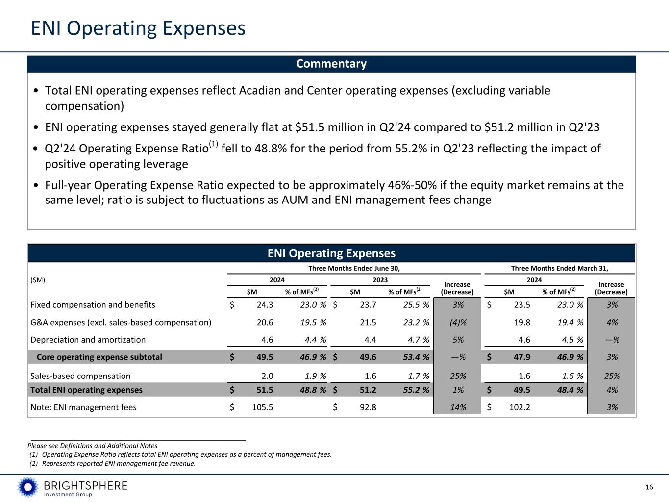 15 ENI Revenue • ENI revenue includes management fees and performance fees • Q2'24 ENI revenue of $108.3 million increased from Q2'23 by 14%; primarily due to higher management fees driven by higher average AUM • Management fees increased 14% from Q2'23 reflecting a 13% increase in average AUM driven by market appreciation Commentary ENI Revenue ($M) Three Months Ended June 30, Three Months Ended March 31, 2024 2023 Increase (Decrease) 2024 Increase (Decrease) Management fees $ 105.5 $ 92.8 14% $ 102.2 3% Performance fees 2.8 2.2 27% 3.1 (10)% ENI revenue $ 108.3 $ 95.0 14% $ 105.3 3% __________________________________________________________ Please see Definitions and Additional Notes