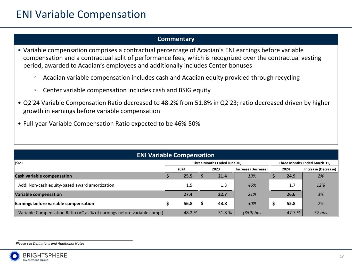 16 ENI Operating Expenses Three Months Ended June 30, Three Months Ended March 31, ($M) 2024 2023 Increase (Decrease) 2024 Increase (Decrease)$M % of MFs(2) $M % of MFs(2) $M % of MFs(2) Fixed compensation and benefits $ 24.3 23.0 % $ 23.7 25.5 % 3% $ 23.5 23.0 % 3% G&A expenses (excl. sales-based compensation) 20.6 19.5 % 21.5 23.2 % (4)% 19.8 19.4 % 4% Depreciation and amortization 4.6 4.4 % 4.4 4.7 % 5% 4.6 4.5 % —% Core operating expense subtotal $ 49.5 46.9 % $ 49.6 53.4 % —% $ 47.9 46.9 % 3% Sales-based compensation 2.0 1.9 % 1.6 1.7 % 25% 1.6 1.6 % 25% Total ENI operating expenses $ 51.5 48.8 % $ 51.2 55.2 % 1% $ 49.5 48.4 % 4% Note: ENI management fees $ 105.5 $ 92.8 14% $ 102.2 3% • Total ENI operating expenses reflect Acadian and Center operating expenses (excluding variable compensation) • ENI operating expenses stayed generally flat at $51.5 million in Q2'24 compared to $51.2 million in Q2'23 • Q2'24 Operating Expense Ratio(1) fell to 48.8% for the period from 55.2% in Q2'23 reflecting the impact of positive operating leverage • Full-year Operating Expense Ratio expected to be approximately 46%-50% if the equity market remains at the same level; ratio is subject to fluctuations as AUM and ENI management fees change __________________________________________________________ Please see Definitions and Additional Notes (1) Operating Expense Ratio reflects total ENI operating expenses as a percent of management fees. (2) Represents reported ENI management fee revenue. ENI Operating Expenses Commentary