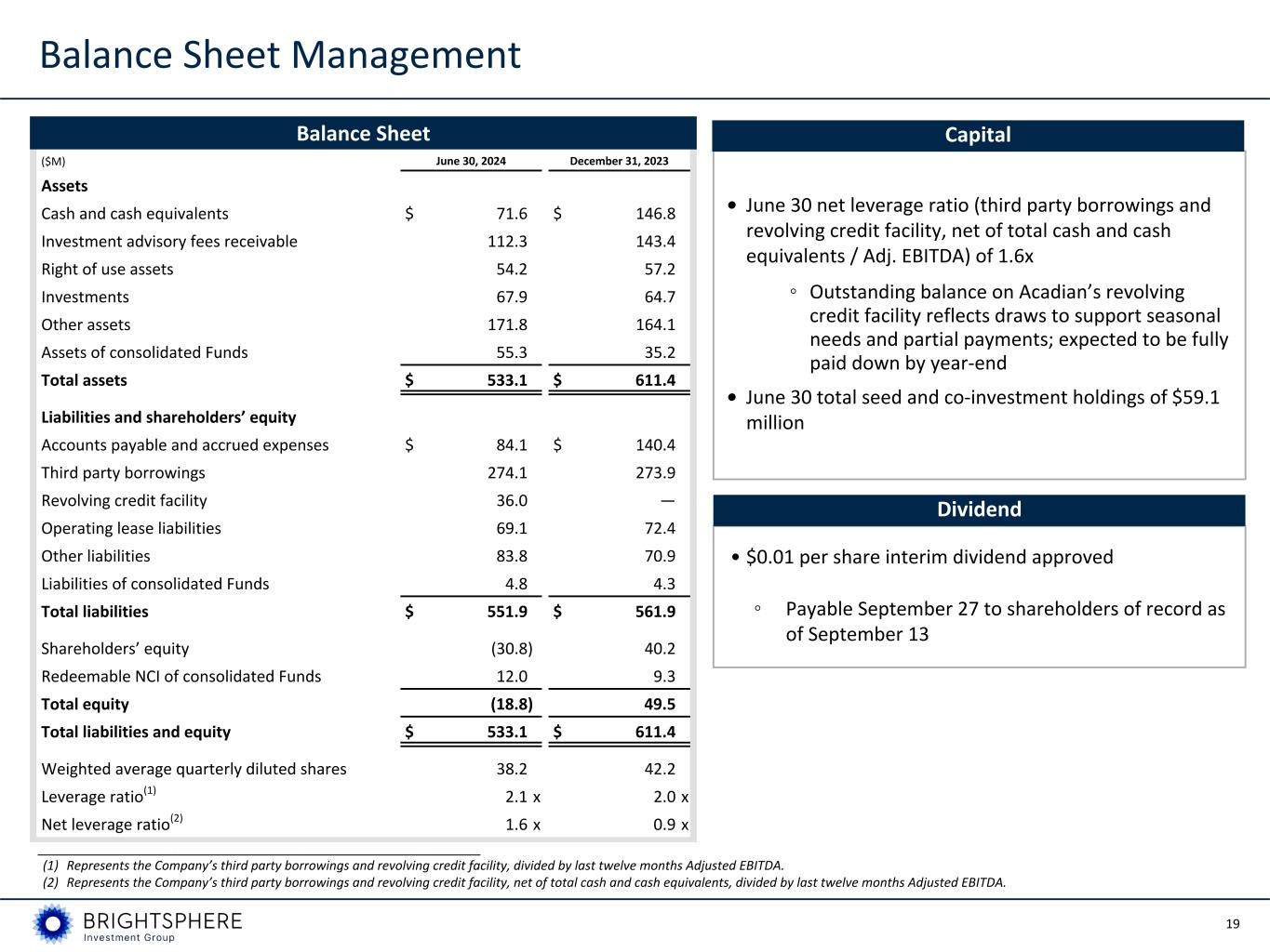 19 Balance Sheet ($M) June 30, 2024 December 31, 2023 Assets Cash and cash equivalents $ 71.6 $ 146.8 Investment advisory fees receivable 112.3 143.4 Right of use assets 54.2 57.2 Investments 67.9 64.7 Other assets 171.8 164.1 Assets of consolidated Funds 55.3 35.2 Total assets $ 533.1 $ 611.4 Liabilities and shareholders’ equity Accounts payable and accrued expenses $ 84.1 $ 140.4 Third party borrowings 274.1 273.9 Revolving credit facility 36.0 — Operating lease liabilities 69.1 72.4 Other liabilities 83.8 70.9 Liabilities of consolidated Funds 4.8 4.3 Total liabilities $ 551.9 $ 561.9 Shareholders’ equity (30.8) 40.2 Redeemable NCI of consolidated Funds 12.0 9.3 Total equity (18.8) 49.5 Total liabilities and equity $ 533.1 $ 611.4 Weighted average quarterly diluted shares 38.2 42.2 Leverage ratio(1) 2.1 x 2.0 x Net leverage ratio(2) 1.6 x 0.9 x Balance Sheet Management • $0.01 per share interim dividend approved ◦ Payable September 27 to shareholders of record as of September 13 • June 30 net leverage ratio (third party borrowings and revolving credit facility, net of total cash and cash equivalents / Adj. EBITDA) of 1.6x ◦ Outstanding balance on Acadian’s revolving credit facility reflects draws to support seasonal needs and partial payments; expected to be fully paid down by year-end • June 30 total seed and co-investment holdings of $59.1 million Capital Dividend _______________________________________________________________ (1) Represents the Company’s third party borrowings and revolving credit facility, divided by last twelve months Adjusted EBITDA. (2) Represents the Company’s third party borrowings and revolving credit facility, net of total cash and cash equivalents, divided by last twelve months Adjusted EBITDA.