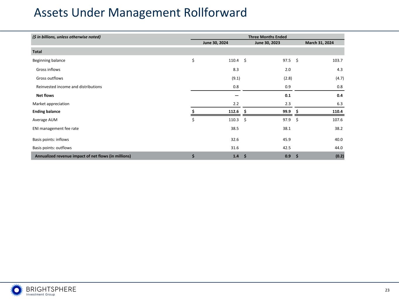 23 Assets Under Management Rollforward ($ in billions, unless otherwise noted) Three Months Ended June 30, 2024 June 30, 2023 March 31, 2024 Total Beginning balance $ 110.4 $ 97.5 $ 103.7 Gross inflows 8.3 2.0 4.3 Gross outflows (9.1) (2.8) (4.7) Reinvested income and distributions 0.8 0.9 0.8 Net flows — 0.1 0.4 Market appreciation 2.2 2.3 6.3 Ending balance $ 112.6 $ 99.9 $ 110.4 Average AUM $ 110.3 $ 97.9 $ 107.6 ENI management fee rate 38.5 38.1 38.2 Basis points: inflows 32.6 45.9 40.0 Basis points: outflows 31.6 42.5 44.0 Annualized revenue impact of net flows (in millions) $ 1.4 $ 0.9 $ (0.2)