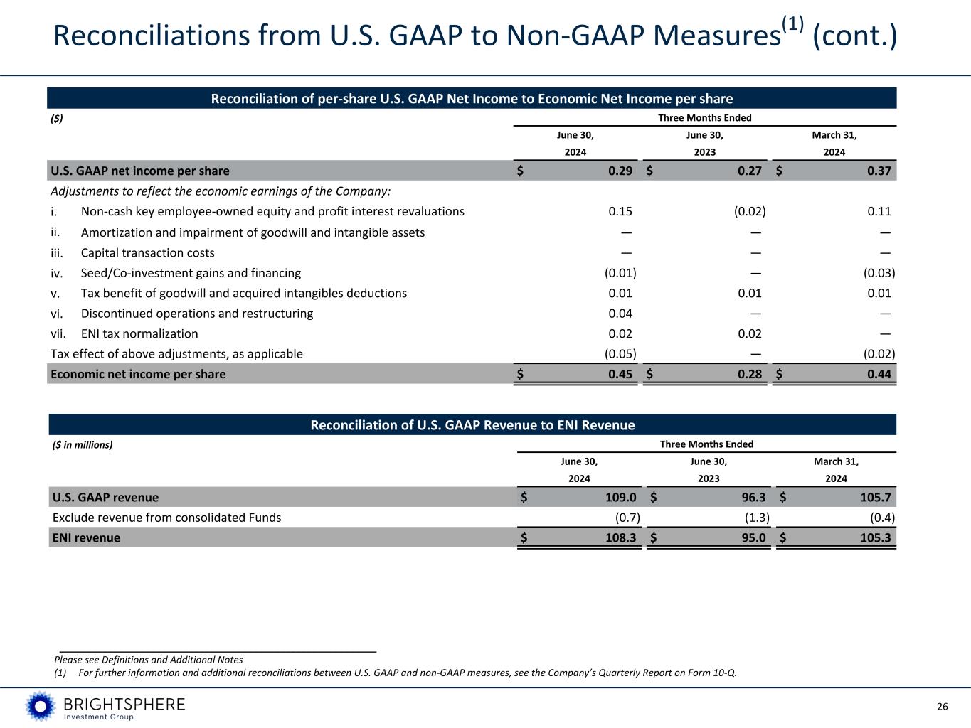 25 Three Months Ended ($ in millions) June 30, June 30, March 31, 2024 2023 2024 U.S. GAAP net income attributable to controlling interests $ 11.0 $ 11.4 $ 14.6 Adjustments to reflect the economic earnings of the Company: Non-cash key employee-owned equity and profit interest revaluations(2) 5.9 (0.7) 4.4 Amortization of acquired intangible assets(2) — — — Capital transaction costs(2) 0.1 0.1 0.1 Seed/Co-investment (gains) losses and financings(2) (0.2) (0.1) (1.2) Tax benefit of goodwill and acquired intangible deductions 0.4 0.3 0.4 Discontinued operations attributable to controlling interests and restructuring (2)(3) 1.4 0.2 — Total adjustment to reflect earnings of the Company $ 7.6 $ (0.2) $ 3.7 Tax effect of above adjustments(2) (2.0) 0.2 (0.9) ENI tax normalization 0.6 0.6 — Economic net income $ 17.2 $ 12.0 $ 17.4 ENI net interest expense to third parties 3.5 3.5 3.0 Depreciation and amortization(4) 4.7 4.8 4.9 Tax on Economic Net Income 6.6 4.4 6.6 Adjusted EBITDA $ 32.0 $ 24.7 $ 31.9 Reconciliations from U.S. GAAP to Non-GAAP Measures(1) i. Exclude non-cash expenses representing changes in the value of Affiliate equity and profit interests held by Affiliate key employees ii. Exclude non-cash amortization or impairment expenses related to acquired goodwill and other intangibles iii.Exclude capital transaction costs including the costs of raising debt or equity, gains or losses realized as a result of redeeming debt or equity and direct incremental costs associated with acquisitions of businesses or assets iv.Exclude gains/losses on seed capital and co- investments, as well as related financing costs v. Include cash tax benefits related to tax amortization of acquired intangibles vi.Exclude results of discontinued operations as they are not part of the ongoing business, and restructuring costs incurred in continuing operations vii. Exclude one-off tax benefits or costs unrelated to current operations ENI Adjustments 1 3 2 3 4 5 7 6 2 1 4 5 6 7 ___________________________________________________________ Please see Definitions and Additional Notes (1) For further information and additional reconciliations between U.S. GAAP and non-GAAP measures, see the Company’s Quarterly Report on Form 10-Q. (2) Tax-affected items for which adjustments are included in “Tax effect of above adjustments” line, excluding the discontinued operations component of item 6; taxed at 27.3% U.S. statutory rate (including state tax). (3) The three months ended June 30, 2024 includes costs associated with the transfer of an insurance policy from our former Parent of $0.4 million, severance-related items at Acadian of $(0.3) million, and costs associated with the wind-down of the Multi-Asset Class Strategies (“MACS”) business in the standalone format of $1.3 million. The three months ended June 30, 2023 includes costs associated with the transfer of an insurance policy from our former Parent of $0.2 million. The three months ended March 31, 2024 includes costs associated with the transfer of an insurance policy from our former Parent of $0.2 million, and severance-related items at Acadian of $(0.2) million. (4) Includes non-cash equity-based award amortization expense.