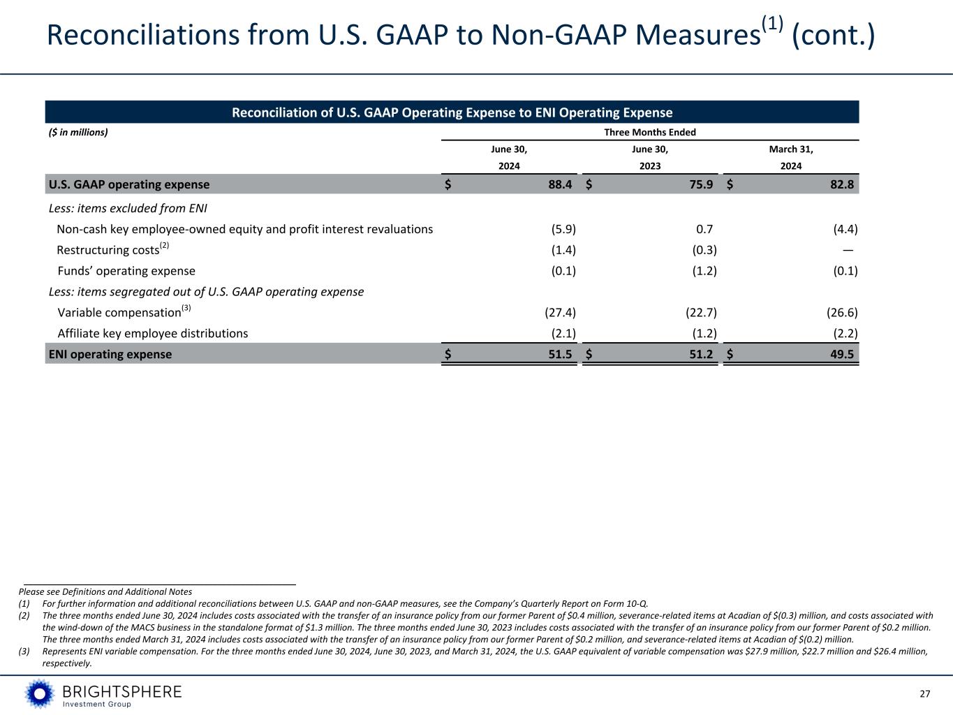 26 Reconciliations from U.S. GAAP to Non-GAAP Measures(1) (cont.) Reconciliation of per-share U.S. GAAP Net Income to Economic Net Income per share ($) Three Months Ended June 30, June 30, March 31, 2024 2023 2024 U.S. GAAP net income per share $ 0.29 $ 0.27 $ 0.37 Adjustments to reflect the economic earnings of the Company: i. Non-cash key employee-owned equity and profit interest revaluations 0.15 (0.02) 0.11 ii. Amortization and impairment of goodwill and intangible assets — — — iii. Capital transaction costs — — — iv. Seed/Co-investment gains and financing (0.01) — (0.03) v. Tax benefit of goodwill and acquired intangibles deductions 0.01 0.01 0.01 vi. Discontinued operations and restructuring 0.04 — — vii. ENI tax normalization 0.02 0.02 — Tax effect of above adjustments, as applicable (0.05) — (0.02) Economic net income per share $ 0.45 $ 0.28 $ 0.44 Reconciliation of U.S. GAAP Revenue to ENI Revenue ($ in millions) Three Months Ended June 30, June 30, March 31, 2024 2023 2024 U.S. GAAP revenue $ 109.0 $ 96.3 $ 105.7 Exclude revenue from consolidated Funds (0.7) (1.3) (0.4) ENI revenue $ 108.3 $ 95.0 $ 105.3 ___________________________________________________________ Please see Definitions and Additional Notes (1) For further information and additional reconciliations between U.S. GAAP and non-GAAP measures, see the Company’s Quarterly Report on Form 10-Q.
