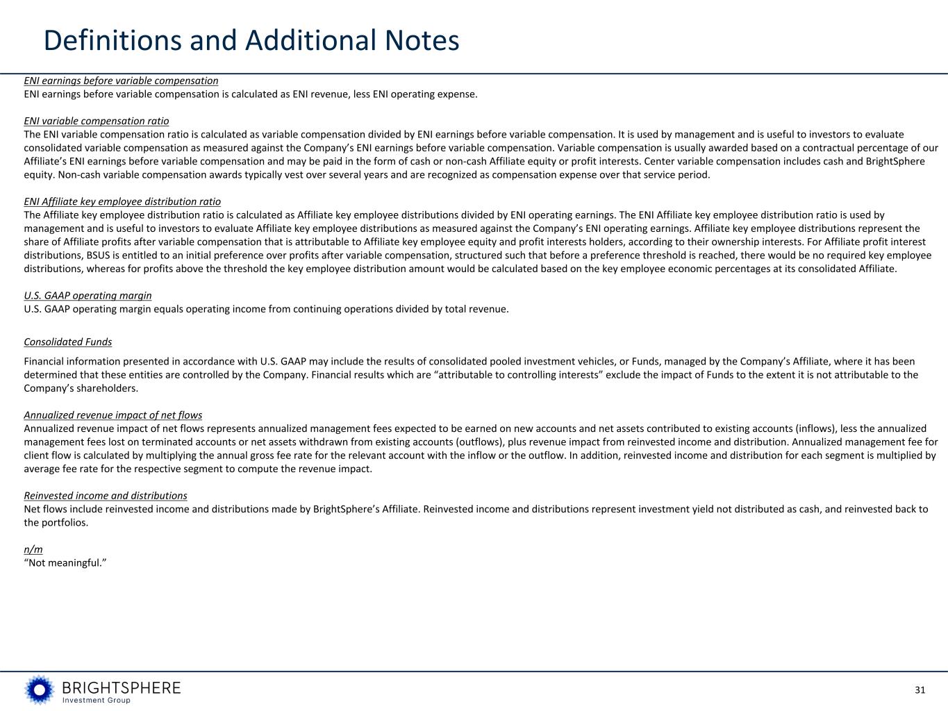 31 Definitions and Additional Notes ENI earnings before variable compensation ENI earnings before variable compensation is calculated as ENI revenue, less ENI operating expense. ENI variable compensation ratio The ENI variable compensation ratio is calculated as variable compensation divided by ENI earnings before variable compensation. It is used by management and is useful to investors to evaluate consolidated variable compensation as measured against the Company’s ENI earnings before variable compensation. Variable compensation is usually awarded based on a contractual percentage of our Affiliate’s ENI earnings before variable compensation and may be paid in the form of cash or non-cash Affiliate equity or profit interests. Center variable compensation includes cash and BrightSphere equity. Non-cash variable compensation awards typically vest over several years and are recognized as compensation expense over that service period. ENI Affiliate key employee distribution ratio The Affiliate key employee distribution ratio is calculated as Affiliate key employee distributions divided by ENI operating earnings. The ENI Affiliate key employee distribution ratio is used by management and is useful to investors to evaluate Affiliate key employee distributions as measured against the Company’s ENI operating earnings. Affiliate key employee distributions represent the share of Affiliate profits after variable compensation that is attributable to Affiliate key employee equity and profit interests holders, according to their ownership interests. For Affiliate profit interest distributions, BSUS is entitled to an initial preference over profits after variable compensation, structured such that before a preference threshold is reached, there would be no required key employee distributions, whereas for profits above the threshold the key employee distribution amount would be calculated based on the key employee economic percentages at its consolidated Affiliate. U.S. GAAP operating margin U.S. GAAP operating margin equals operating income from continuing operations divided by total revenue. Consolidated Funds Financial information presented in accordance with U.S. GAAP may include the results of consolidated pooled investment vehicles, or Funds, managed by the Company’s Affiliate, where it has been determined that these entities are controlled by the Company. Financial results which are “attributable to controlling interests” exclude the impact of Funds to the extent it is not attributable to the Company’s shareholders. Annualized revenue impact of net flows Annualized revenue impact of net flows represents annualized management fees expected to be earned on new accounts and net assets contributed to existing accounts (inflows), less the annualized management fees lost on terminated accounts or net assets withdrawn from existing accounts (outflows), plus revenue impact from reinvested income and distribution. Annualized management fee for client flow is calculated by multiplying the annual gross fee rate for the relevant account with the inflow or the outflow. In addition, reinvested income and distribution for each segment is multiplied by average fee rate for the respective segment to compute the revenue impact. Reinvested income and distributions Net flows include reinvested income and distributions made by BrightSphere’s Affiliate. Reinvested income and distributions represent investment yield not distributed as cash, and reinvested back to the portfolios. n/m “Not meaningful.”