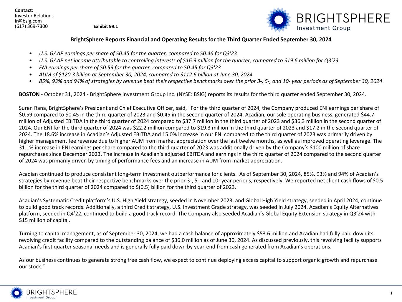 1 Contact: Investor Relations ir@bsig.com (617) 369-7300 Exhibit 99.1 BrightSphere Reports Financial and Operating Results for the Third Quarter Ended September 30, 2024 • U.S. GAAP earnings per share of $0.45 for the quarter, compared to $0.46 for Q3'23 • U.S. GAAP net income attributable to controlling interests of $16.9 million for the quarter, compared to $19.6 million for Q3'23 • ENI earnings per share of $0.59 for the quarter, compared to $0.45 for Q3'23 • AUM of $120.3 billion at September 30, 2024, compared to $112.6 billion at June 30, 2024 • 85%, 93% and 94% of strategies by revenue beat their respective benchmarks over the prior 3-, 5-, and 10- year periods as of September 30, 2024 BOSTON - October 31, 2024 - BrightSphere Investment Group Inc. (NYSE: BSIG) reports its results for the third quarter ended September 30, 2024. Suren Rana, BrightSphere’s President and Chief Executive Officer, said, “For the third quarter of 2024, the Company produced ENI earnings per share of $0.59 compared to $0.45 in the third quarter of 2023 and $0.45 in the second quarter of 2024. Acadian, our sole operating business, generated $44.7 million of Adjusted EBITDA in the third quarter of 2024 compared to $37.7 million in the third quarter of 2023 and $36.3 million in the second quarter of 2024. Our ENI for the third quarter of 2024 was $22.2 million compared to $19.3 million in the third quarter of 2023 and $17.2 in the second quarter of 2024. The 18.6% increase in Acadian’s Adjusted EBITDA and 15.0% increase in our ENI compared to the third quarter of 2023 was primarily driven by higher management fee revenue due to higher AUM from market appreciation over the last twelve months, as well as improved operating leverage. The 31.1% increase in ENI earnings per share compared to the third quarter of 2023 was additionally driven by the Company’s $100 million of share repurchases since December 2023. The increase in Acadian’s adjusted EBITDA and earnings in the third quarter of 2024 compared to the second quarter of 2024 was primarily driven by timing of performance fees and an increase in AUM from market appreciation. Acadian continued to produce consistent long-term investment outperformance for clients. As of September 30, 2024, 85%, 93% and 94% of Acadian’s strategies by revenue beat their respective benchmarks over the prior 3-, 5-, and 10- year periods, respectively. We reported net client cash flows of $0.5 billion for the third quarter of 2024 compared to $(0.5) billion for the third quarter of 2023. Acadian’s Systematic Credit platform’s U.S. High Yield strategy, seeded in November 2023, and Global High Yield strategy, seeded in April 2024, continue to build good track records. Additionally, a third Credit strategy, U.S. Investment Grade strategy, was seeded in July 2024. Acadian’s Equity Alternatives platform, seeded in Q4’22, continued to build a good track record. The Company also seeded Acadian’s Global Equity Extension strategy in Q3’24 with $15 million of capital. Turning to capital management, as of September 30, 2024, we had a cash balance of approximately $53.6 million and Acadian had fully paid down its revolving credit facility compared to the outstanding balance of $36.0 million as of June 30, 2024. As discussed previously, this revolving facility supports Acadian’s first quarter seasonal needs and is generally fully paid down by year-end from cash generated from Acadian’s operations. As our business continues to generate strong free cash flow, we expect to continue deploying excess capital to support organic growth and repurchase our stock.”