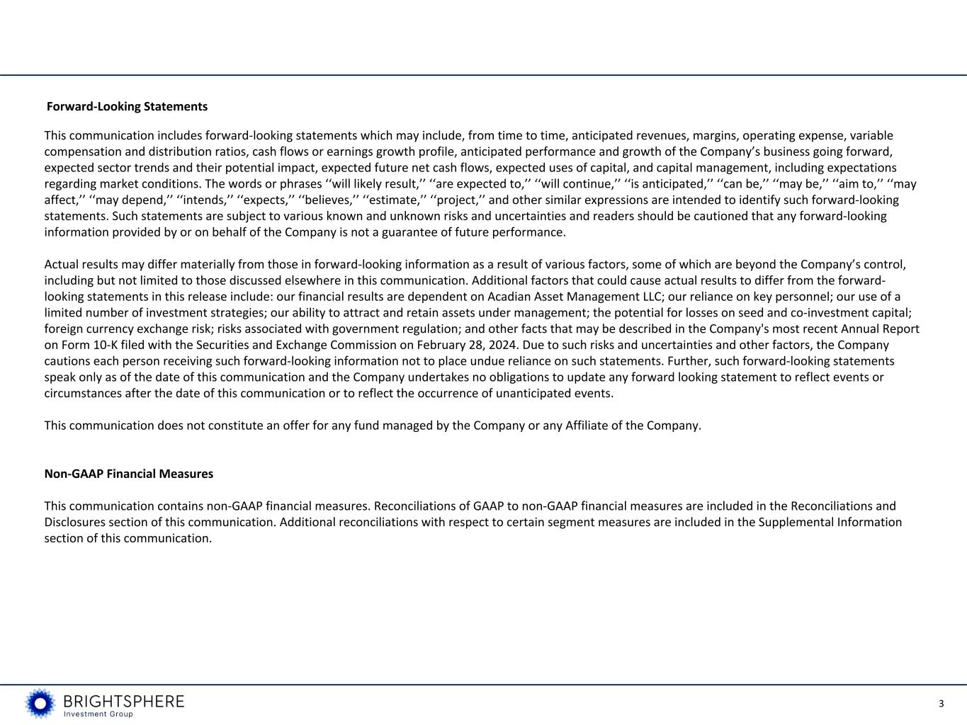3 Forward-Looking Statements This communication includes forward-looking statements which may include, from time to time, anticipated revenues, margins, operating expense, variable compensation and distribution ratios, cash flows or earnings growth profile, anticipated performance and growth of the Company’s business going forward, expected sector trends and their potential impact, expected future net cash flows, expected uses of capital, and capital management, including expectations regarding market conditions. The words or phrases ‘‘will likely result,’’ ‘‘are expected to,’’ ‘‘will continue,’’ ‘‘is anticipated,’’ ‘‘can be,’’ ‘‘may be,’’ ‘‘aim to,’’ ‘‘may affect,’’ ‘‘may depend,’’ ‘‘intends,’’ ‘‘expects,’’ ‘‘believes,’’ ‘‘estimate,’’ ‘‘project,’’ and other similar expressions are intended to identify such forward-looking statements. Such statements are subject to various known and unknown risks and uncertainties and readers should be cautioned that any forward-looking information provided by or on behalf of the Company is not a guarantee of future performance. Actual results may differ materially from those in forward-looking information as a result of various factors, some of which are beyond the Company’s control, including but not limited to those discussed elsewhere in this communication. Additional factors that could cause actual results to differ from the forward- looking statements in this release include: our financial results are dependent on Acadian Asset Management LLC; our reliance on key personnel; our use of a limited number of investment strategies; our ability to attract and retain assets under management; the potential for losses on seed and co-investment capital; foreign currency exchange risk; risks associated with government regulation; and other facts that may be described in the Company's most recent Annual Report on Form 10-K filed with the Securities and Exchange Commission on February 28, 2024. Due to such risks and uncertainties and other factors, the Company cautions each person receiving such forward-looking information not to place undue reliance on such statements. Further, such forward-looking statements speak only as of the date of this communication and the Company undertakes no obligations to update any forward looking statement to reflect events or circumstances after the date of this communication or to reflect the occurrence of unanticipated events. This communication does not constitute an offer for any fund managed by the Company or any Affiliate of the Company. Non-GAAP Financial Measures This communication contains non-GAAP financial measures. Reconciliations of GAAP to non-GAAP financial measures are included in the Reconciliations and Disclosures section of this communication. Additional reconciliations with respect to certain segment measures are included in the Supplemental Information section of this communication.