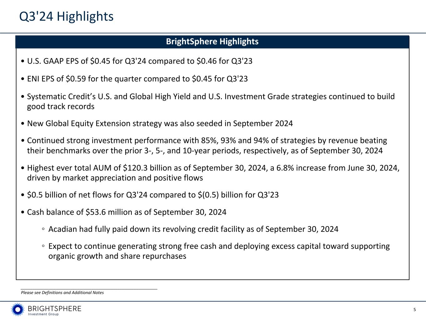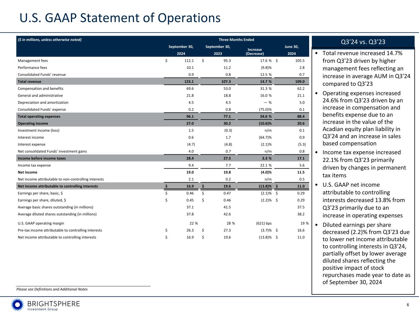 5 • U.S. GAAP EPS of $0.45 for Q3'24 compared to $0.46 for Q3'23 • ENI EPS of $0.59 for the quarter compared to $0.45 for Q3'23 • Systematic Credit’s U.S. and Global High Yield and U.S. Investment Grade strategies continued to build good track records • New Global Equity Extension strategy was also seeded in September 2024 • Continued strong investment performance with 85%, 93% and 94% of strategies by revenue beating their benchmarks over the prior 3-, 5-, and 10-year periods, respectively, as of September 30, 2024 • Highest ever total AUM of $120.3 billion as of September 30, 2024, a 6.8% increase from June 30, 2024, driven by market appreciation and positive flows • $0.5 billion of net flows for Q3'24 compared to $(0.5) billion for Q3'23 • Cash balance of $53.6 million as of September 30, 2024 ◦ Acadian had fully paid down its revolving credit facility as of September 30, 2024 ◦ Expect to continue generating strong free cash and deploying excess capital toward supporting organic growth and share repurchases BrightSphere Highlights Q3'24 Highlights __________________________________________________________ Please see Definitions and Additional Notes