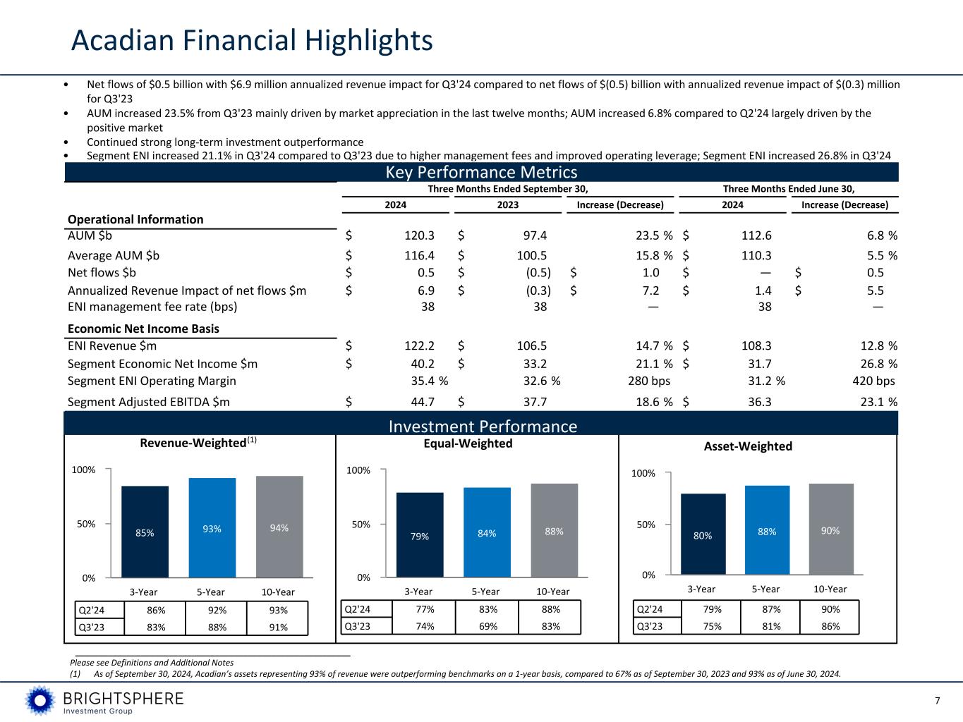 6 U.S. GAAP Statement of Operations ($ in millions, unless otherwise noted) Three Months Ended September 30, September 30, Increase (Decrease) June 30, 2024 2023 2024 Management fees $ 112.1 $ 95.3 17.6 % $ 105.5 Performance fees 10.1 11.2 (9.8) % 2.8 Consolidated Funds’ revenue 0.9 0.8 12.5 % 0.7 Total revenue 123.1 107.3 14.7 % 109.0 Compensation and benefits 69.6 53.0 31.3 % 62.2 General and administrative 21.8 18.8 16.0 % 21.1 Depreciation and amortization 4.5 4.5 — % 5.0 Consolidated Funds’ expense 0.2 0.8 (75.0) % 0.1 Total operating expenses 96.1 77.1 24.6 % 88.4 Operating income 27.0 30.2 (10.6) % 20.6 Investment income (loss) 1.5 (0.3) n/m 0.1 Interest income 0.6 1.7 (64.7) % 0.9 Interest expense (4.7) (4.8) (2.1) % (5.3) Net consolidated Funds’ investment gains 4.0 0.7 n/m 0.8 Income before income taxes 28.4 27.5 3.3 % 17.1 Income tax expense 9.4 7.7 22.1 % 5.6 Net income 19.0 19.8 (4.0) % 11.5 Net income attributable to non-controlling interests 2.1 0.2 n/m 0.5 Net income attributable to controlling interests $ 16.9 $ 19.6 (13.8) % $ 11.0 Earnings per share, basic, $ $ 0.46 $ 0.47 (2.1) % $ 0.29 Earnings per share, diluted, $ $ 0.45 $ 0.46 (2.2) % $ 0.29 Average basic shares outstanding (in millions) 37.1 41.5 37.5 Average diluted shares outstanding (in millions) 37.8 42.6 38.2 U.S. GAAP operating margin 22 % 28 % (621) bps 19 % Pre-tax income attributable to controlling interests $ 26.3 $ 27.3 (3.7) % $ 16.6 Net income attributable to controlling interests $ 16.9 $ 19.6 (13.8) % $ 11.0 Q3'24 vs. Q3'23 __________________________________________________________ Please see Definitions and Additional Notes • Total revenue increased 14.7% from Q3'23 driven by higher management fees reflecting an increase in average AUM in Q3'24 compared to Q3'23 • Operating expenses increased 24.6% from Q3'23 driven by an increase in compensation and benefits expense due to an increase in the value of the Acadian equity plan liability in Q3'24 and an increase in sales based compensation • Income tax expense increased 22.1% from Q3'23 primarily driven by changes in permanent tax items • U.S. GAAP net income attributable to controlling interests decreased 13.8% from Q3'23 primarily due to an increase in operating expenses • Diluted earnings per share decreased (2.2)% from Q3'23 due to lower net income attributable to controlling interests in Q3'24, partially offset by lower average diluted shares reflecting the positive impact of stock repurchases made year to date as of September 30, 2024