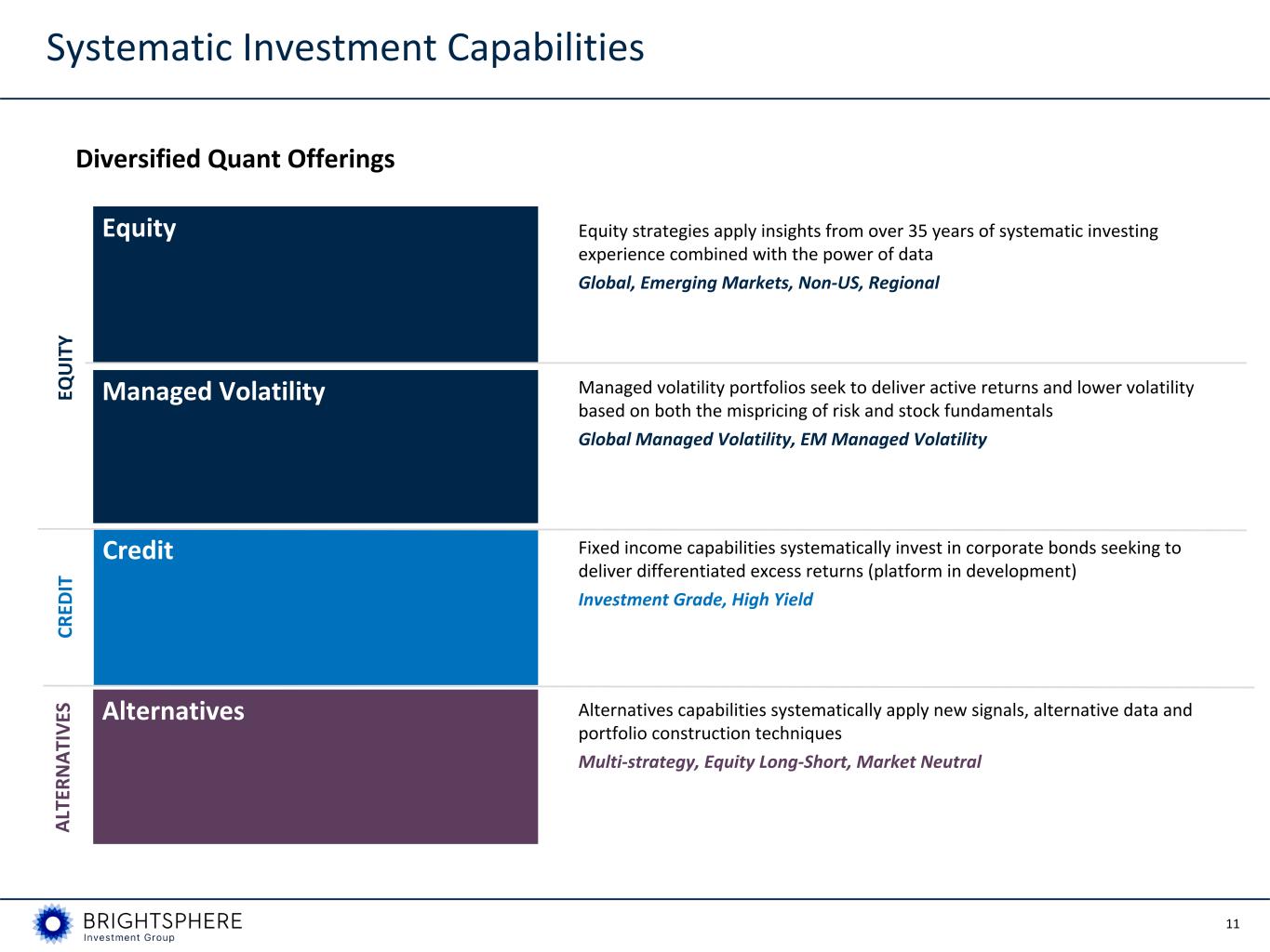 11 Equity strategies apply insights from over 35 years of systematic investing experience combined with the power of data Global, Emerging Markets, Non-US, Regional Managed volatility portfolios seek to deliver active returns and lower volatility based on both the mispricing of risk and stock fundamentals Global Managed Volatility, EM Managed Volatility Fixed income capabilities systematically invest in corporate bonds seeking to deliver differentiated excess returns (platform in development) Investment Grade, High Yield Alternatives capabilities systematically apply new signals, alternative data and portfolio construction techniques Multi-strategy, Equity Long-Short, Market Neutral Diversified Quant Offerings Managed VolatilityEQ U IT Y CR ED IT Credit Alternatives A LT ER N A TI V ES Systematic Investment Capabilities Equity