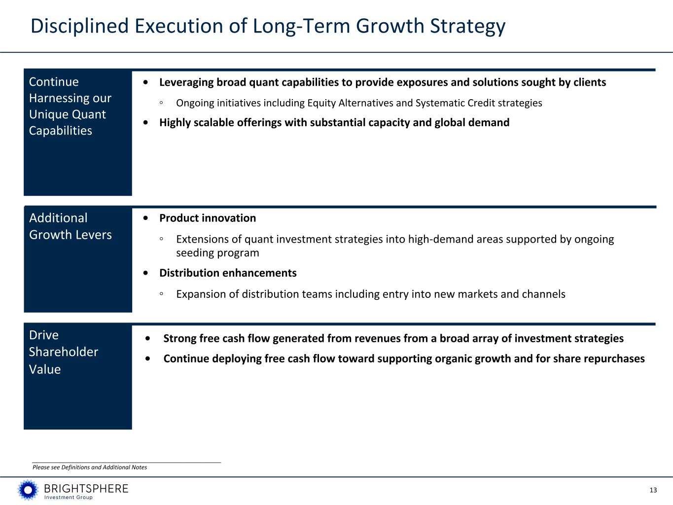 12 Sector Tailwinds Expected to Support Organic Long-term Growth Alpha Secular Trends Anticipated Impact for Acadian Acadian Brand and Barriers to Entry Organic Growth Applying Data and Expertise to New Capabilities Explosive Growth in Alternative Data Continued Development of Advanced Techniques: Machine Learning, AI Scale of Investment in Data, Technology, and Talent Increasingly Important Growing Demand for Uncorrelated Strategies and Customization