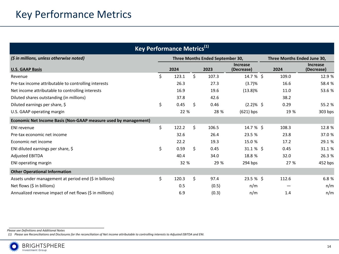 30 The Company adjusts its income tax expense to reflect any tax impact of its ENI adjustments. Adjusted EBITDA Adjusted EBITDA is defined as economic net income before interest, income taxes, depreciation and amortization. The Company notes that its calculation of Adjusted EBITDA may not be consistent with Adjusted EBITDA as calculated by other companies. The Company believes Adjusted EBITDA is a useful liquidity metric because it indicates the Company’s ability to make further investments in its business, service debt and meet working capital requirements. Refer to the reconciliation of U.S. GAAP net income attributable to controlling interests to ENI and Adjusted EBITDA. Segment ENI Segment ENI represents ENI for the Company’s reportable segment, calculated in accordance with the Company’s definition of Economic Net Income, before income tax, interest income and interest expense. Methodologies for calculating investment performance: Revenue-weighted investment performance measures the percentage of management fee revenue generated by Affiliate strategies which are beating benchmarks. It calculates each strategy’s percentage weight by taking its estimated composite revenue over total composite revenues in each period, then sums the total percentage of revenue for strategies outperforming. Equal-weighted investment performance measures the percentage of Affiliate scale strategies (defined as strategies with greater than $100 million of AUM) beating benchmarks. Each outperforming strategy over $100 million has the same weight; the calculation sums the number of strategies outperforming relative to the total number of composites over $100 million. Asset-weighted investment performance measures the percentage of AUM in strategies beating benchmarks. It calculates each strategy’s percentage weight by taking its composite AUM over total composite AUM in each period, then sums the total percentage of AUM for strategies outperforming. ENI operating earnings ENI operating earnings represents ENI earnings before Affiliate key employee distributions and is calculated as ENI revenue, less ENI operating expense, less ENI variable compensation. It differs from economic net income because it does not include the effects of Affiliate key employee distributions, net interest expense or income tax expense. ENI operating margin The ENI operating margin, which is calculated before Affiliate key employee distributions, is used by management and is useful to investors to evaluate the overall operating margin of the business without regard to the Company’s various ownership levels at each of the Affiliates. ENI operating margin is a non-GAAP efficiency measure, calculated based on ENI operating earnings divided by ENI revenue. The ENI operating margin is most comparable to the Company’s U.S. GAAP operating margin. ENI management fee revenue ENI management fee revenue corresponds to U.S. GAAP management fee revenue. ENI operating expense ratio The ENI operating expense ratio is used by management and is useful to investors to evaluate the level of operating expense as measured against the Company’s recurring management fee revenue. The Company has provided this ratio since many operating expenses, including fixed compensation & benefits and general and administrative expense, are generally linked to the overall size of the business. The Company tracks this ratio as a key measure of scale economies at BrightSphere because in its profit sharing economic model, scale benefits both the Affiliate employees and BrightSphere shareholders. Definitions and Additional Notes