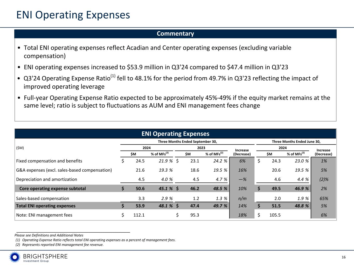 15 ENI Revenue • ENI revenue includes management fees and performance fees • Q3'24 ENI revenue of $122.2 million increased from Q3'23 by 15%; primarily due to higher management fees driven by higher average AUM • Management fees increased 18% from Q3'23 reflecting a 16% increase in average AUM driven by market appreciation Commentary ENI Revenue ($M) Three Months Ended September 30, Three Months Ended June 30, 2024 2023 Increase (Decrease) 2024 Increase (Decrease) Management fees $ 112.1 $ 95.3 18% $ 105.5 6% Performance fees 10.1 11.2 (10)% 2.8 n/m ENI revenue $ 122.2 $ 106.5 15% $ 108.3 13% __________________________________________________________ Please see Definitions and Additional Notes