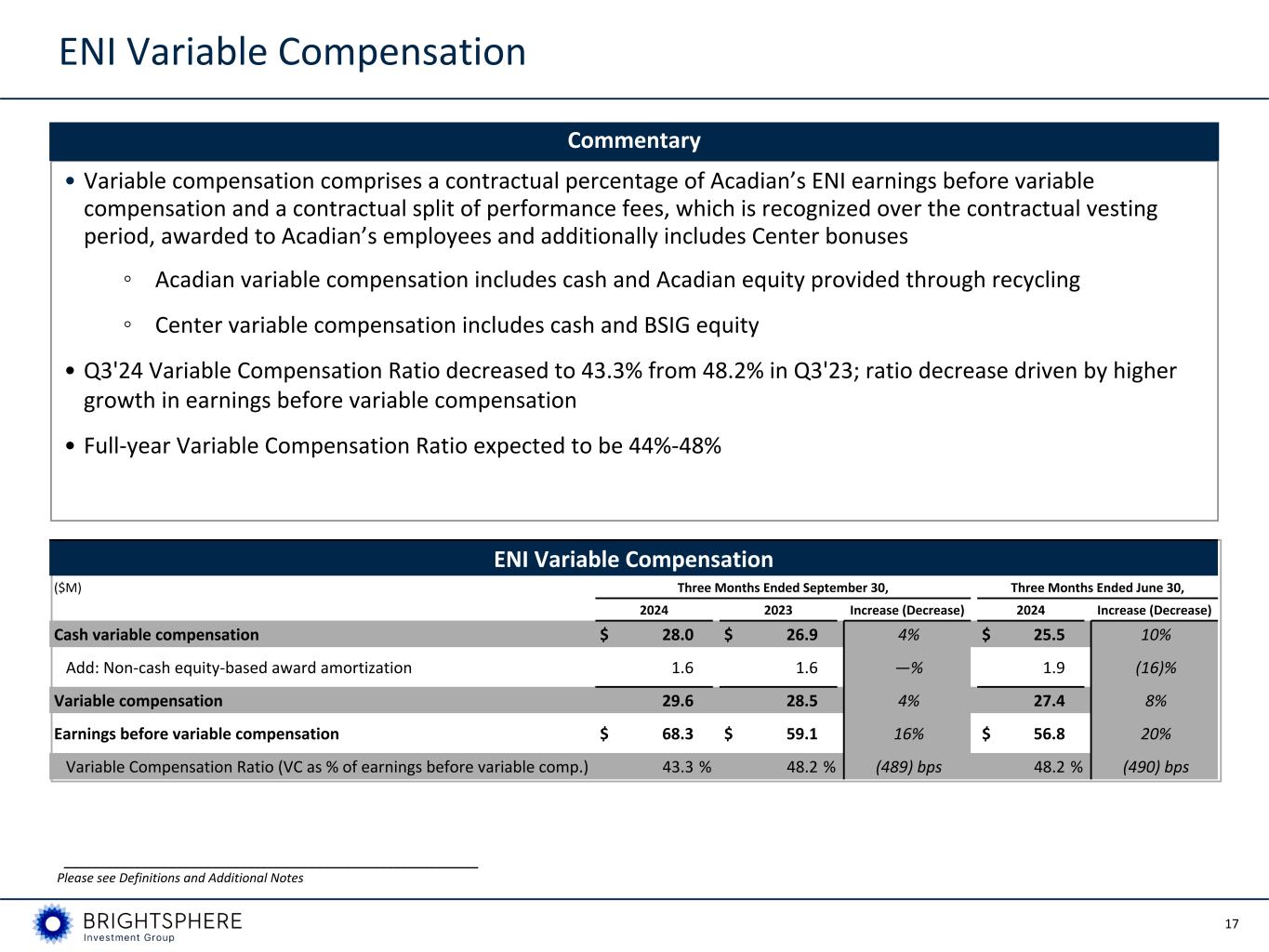 16 ENI Operating Expenses Three Months Ended September 30, Three Months Ended June 30, ($M) 2024 2023 Increase (Decrease) 2024 Increase (Decrease)$M % of MFs(2) $M % of MFs(2) $M % of MFs(2) Fixed compensation and benefits $ 24.5 21.9 % $ 23.1 24.2 % 6% $ 24.3 23.0 % 1% G&A expenses (excl. sales-based compensation) 21.6 19.3 % 18.6 19.5 % 16% 20.6 19.5 % 5% Depreciation and amortization 4.5 4.0 % 4.5 4.7 % —% 4.6 4.4 % (2)% Core operating expense subtotal $ 50.6 45.1 % $ 46.2 48.5 % 10% $ 49.5 46.9 % 2% Sales-based compensation 3.3 2.9 % 1.2 1.3 % n/m 2.0 1.9 % 65% Total ENI operating expenses $ 53.9 48.1 % $ 47.4 49.7 % 14% $ 51.5 48.8 % 5% Note: ENI management fees $ 112.1 $ 95.3 18% $ 105.5 6% • Total ENI operating expenses reflect Acadian and Center operating expenses (excluding variable compensation) • ENI operating expenses increased to $53.9 million in Q3'24 compared to $47.4 million in Q3'23 • Q3'24 Operating Expense Ratio(1) fell to 48.1% for the period from 49.7% in Q3'23 reflecting the impact of improved operating leverage • Full-year Operating Expense Ratio expected to be approximately 45%-49% if the equity market remains at the same level; ratio is subject to fluctuations as AUM and ENI management fees change __________________________________________________________ Please see Definitions and Additional Notes (1) Operating Expense Ratio reflects total ENI operating expenses as a percent of management fees. (2) Represents reported ENI management fee revenue. ENI Operating Expenses Commentary