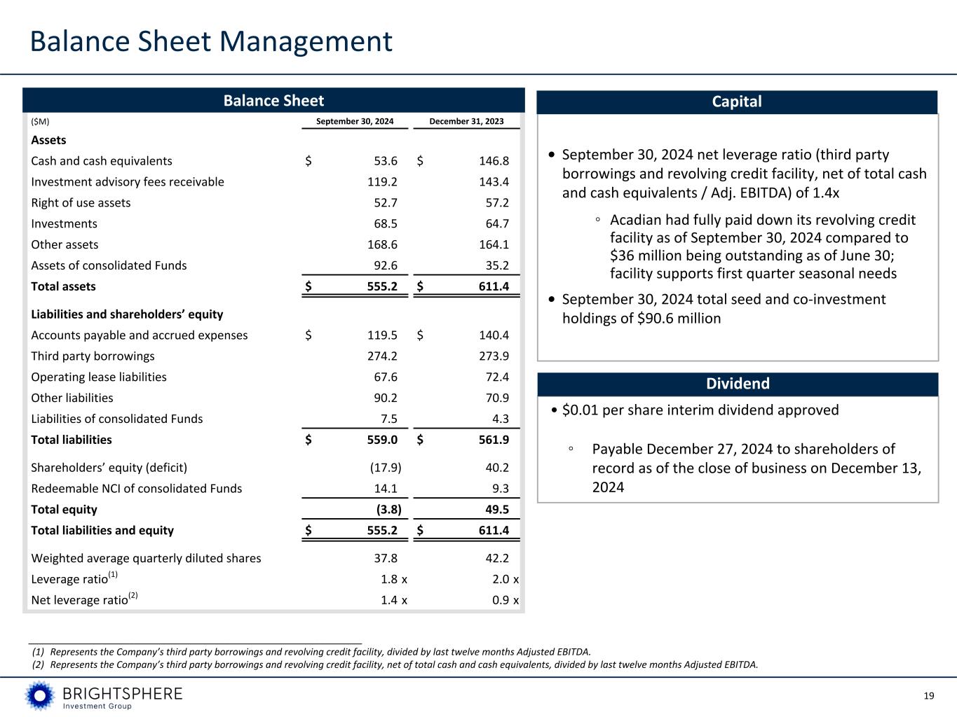 19 Balance Sheet ($M) September 30, 2024 December 31, 2023 Assets Cash and cash equivalents $ 53.6 $ 146.8 Investment advisory fees receivable 119.2 143.4 Right of use assets 52.7 57.2 Investments 68.5 64.7 Other assets 168.6 164.1 Assets of consolidated Funds 92.6 35.2 Total assets $ 555.2 $ 611.4 Liabilities and shareholders’ equity Accounts payable and accrued expenses $ 119.5 $ 140.4 Third party borrowings 274.2 273.9 Operating lease liabilities 67.6 72.4 Other liabilities 90.2 70.9 Liabilities of consolidated Funds 7.5 4.3 Total liabilities $ 559.0 $ 561.9 Shareholders’ equity (deficit) (17.9) 40.2 Redeemable NCI of consolidated Funds 14.1 9.3 Total equity (3.8) 49.5 Total liabilities and equity $ 555.2 $ 611.4 Weighted average quarterly diluted shares 37.8 42.2 Leverage ratio(1) 1.8 x 2.0 x Net leverage ratio(2) 1.4 x 0.9 x Balance Sheet Management • $0.01 per share interim dividend approved ◦ Payable December 27, 2024 to shareholders of record as of the close of business on December 13, 2024 • September 30, 2024 net leverage ratio (third party borrowings and revolving credit facility, net of total cash and cash equivalents / Adj. EBITDA) of 1.4x ◦ Acadian had fully paid down its revolving credit facility as of September 30, 2024 compared to $36 million being outstanding as of June 30; facility supports first quarter seasonal needs • September 30, 2024 total seed and co-investment holdings of $90.6 million Capital Dividend _______________________________________________________________ (1) Represents the Company’s third party borrowings and revolving credit facility, divided by last twelve months Adjusted EBITDA. (2) Represents the Company’s third party borrowings and revolving credit facility, net of total cash and cash equivalents, divided by last twelve months Adjusted EBITDA.