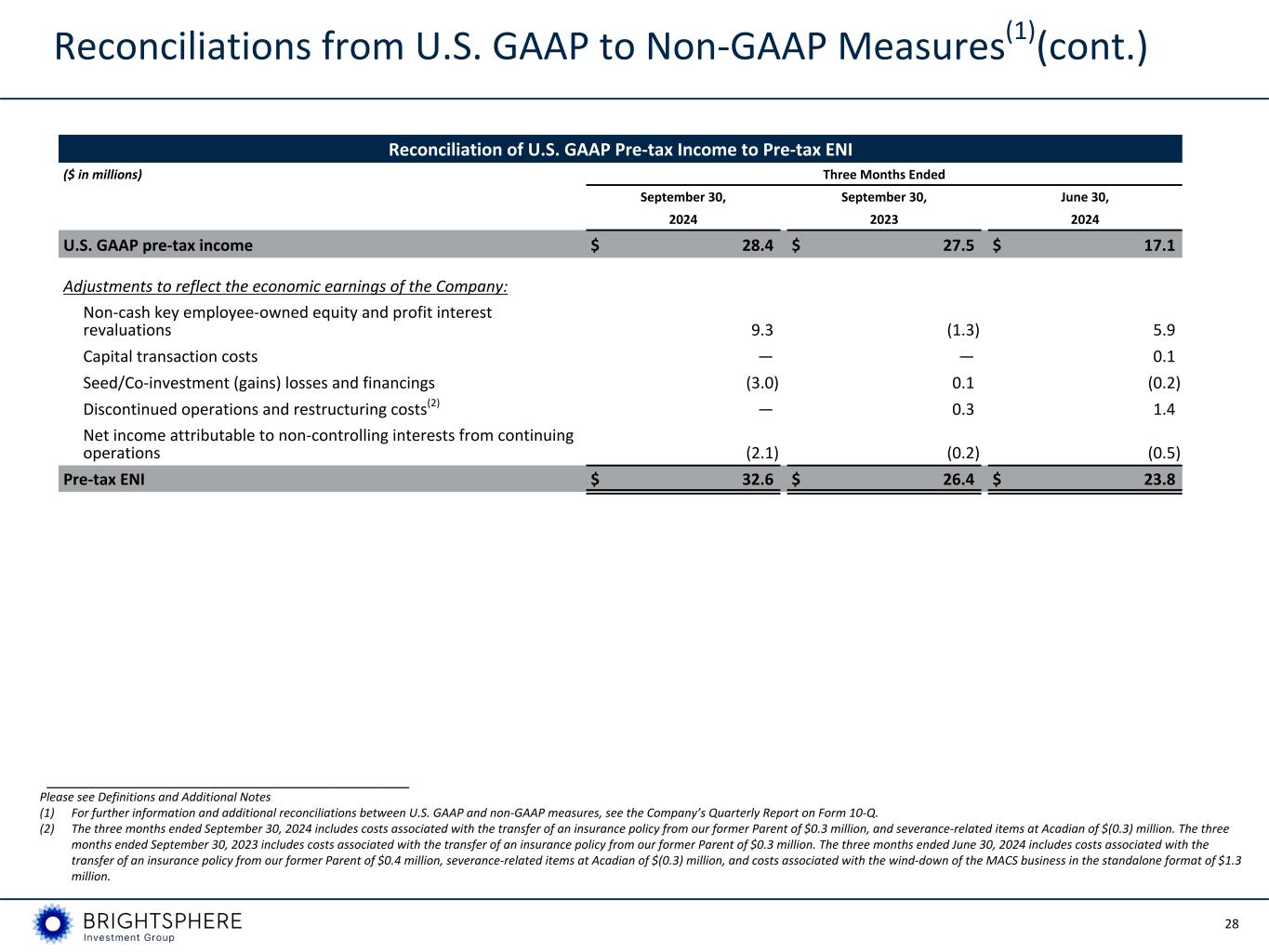 27 Reconciliations from U.S. GAAP to Non-GAAP Measures(1) (cont.) Reconciliation of U.S. GAAP Operating Expense to ENI Operating Expense ($ in millions) Three Months Ended September 30, September 30, June 30, 2024 2023 2024 U.S. GAAP operating expense $ 96.1 $ 77.1 $ 88.4 Less: items excluded from ENI Non-cash key employee-owned equity and profit interest revaluations (9.3) 1.3 (5.9) Restructuring costs(2) — (0.2) (1.4) Funds’ operating expense (0.2) (0.8) (0.1) Less: items segregated out of U.S. GAAP operating expense Variable compensation(3) (29.6) (28.5) (27.4) Affiliate key employee distributions (3.1) (1.5) (2.1) ENI operating expense $ 53.9 $ 47.4 $ 51.5 ___________________________________________________________ Please see Definitions and Additional Notes (1) For further information and additional reconciliations between U.S. GAAP and non-GAAP measures, see the Company’s Quarterly Report on Form 10-Q. (2) The three months ended September 30, 2024 includes costs associated with the transfer of an insurance policy from our former Parent of $0.3 million and severance-related items at Acadian of $(0.3) million. The three months ended September 30, 2023 includes costs associated with the transfer of an insurance policy from our former Parent of $0.3 million. The three months ended June 30, 2024 includes costs associated with the transfer of an insurance policy from our former Parent of $0.4 million, severance-related items at Acadian of $(0.3) million, and costs associated with the wind-down of the MACS business in the standalone format of $1.3 million. (3) Represents ENI variable compensation. For the three months ended September 30, 2024, September 30, 2023, and June 30, 2024, the U.S. GAAP equivalent of variable compensation was $29.4 million, $28.5 million and $27.9 million, respectively.