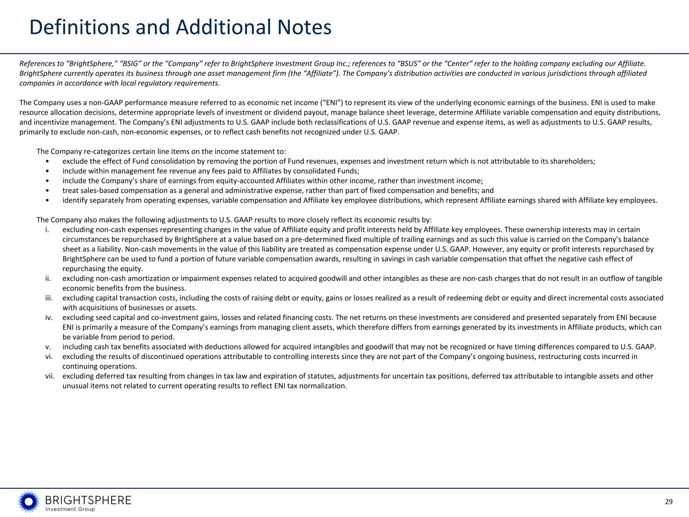 29 Definitions and Additional Notes References to “BrightSphere,” “BSIG” or the “Company” refer to BrightSphere Investment Group Inc.; references to “BSUS” or the “Center” refer to the holding company excluding our Affiliate. BrightSphere currently operates its business through one asset management firm (the “Affiliate”). The Company’s distribution activities are conducted in various jurisdictions through affiliated companies in accordance with local regulatory requirements. The Company uses a non-GAAP performance measure referred to as economic net income (“ENI”) to represent its view of the underlying economic earnings of the business. ENI is used to make resource allocation decisions, determine appropriate levels of investment or dividend payout, manage balance sheet leverage, determine Affiliate variable compensation and equity distributions, and incentivize management. The Company’s ENI adjustments to U.S. GAAP include both reclassifications of U.S. GAAP revenue and expense items, as well as adjustments to U.S. GAAP results, primarily to exclude non-cash, non-economic expenses, or to reflect cash benefits not recognized under U.S. GAAP. The Company re-categorizes certain line items on the income statement to: • exclude the effect of Fund consolidation by removing the portion of Fund revenues, expenses and investment return which is not attributable to its shareholders; • include within management fee revenue any fees paid to Affiliates by consolidated Funds; • include the Company’s share of earnings from equity-accounted Affiliates within other income, rather than investment income; • treat sales-based compensation as a general and administrative expense, rather than part of fixed compensation and benefits; and • identify separately from operating expenses, variable compensation and Affiliate key employee distributions, which represent Affiliate earnings shared with Affiliate key employees. The Company also makes the following adjustments to U.S. GAAP results to more closely reflect its economic results by: i. excluding non-cash expenses representing changes in the value of Affiliate equity and profit interests held by Affiliate key employees. These ownership interests may in certain circumstances be repurchased by BrightSphere at a value based on a pre-determined fixed multiple of trailing earnings and as such this value is carried on the Company’s balance sheet as a liability. Non-cash movements in the value of this liability are treated as compensation expense under U.S. GAAP. However, any equity or profit interests repurchased by BrightSphere can be used to fund a portion of future variable compensation awards, resulting in savings in cash variable compensation that offset the negative cash effect of repurchasing the equity. ii. excluding non-cash amortization or impairment expenses related to acquired goodwill and other intangibles as these are non-cash charges that do not result in an outflow of tangible economic benefits from the business. iii. excluding capital transaction costs, including the costs of raising debt or equity, gains or losses realized as a result of redeeming debt or equity and direct incremental costs associated with acquisitions of businesses or assets. iv. excluding seed capital and co-investment gains, losses and related financing costs. The net returns on these investments are considered and presented separately from ENI because ENI is primarily a measure of the Company’s earnings from managing client assets, which therefore differs from earnings generated by its investments in Affiliate products, which can be variable from period to period. v. including cash tax benefits associated with deductions allowed for acquired intangibles and goodwill that may not be recognized or have timing differences compared to U.S. GAAP. vi. excluding the results of discontinued operations attributable to controlling interests since they are not part of the Company’s ongoing business, restructuring costs incurred in continuing operations. vii. excluding deferred tax resulting from changes in tax law and expiration of statutes, adjustments for uncertain tax positions, deferred tax attributable to intangible assets and other unusual items not related to current operating results to reflect ENI tax normalization.