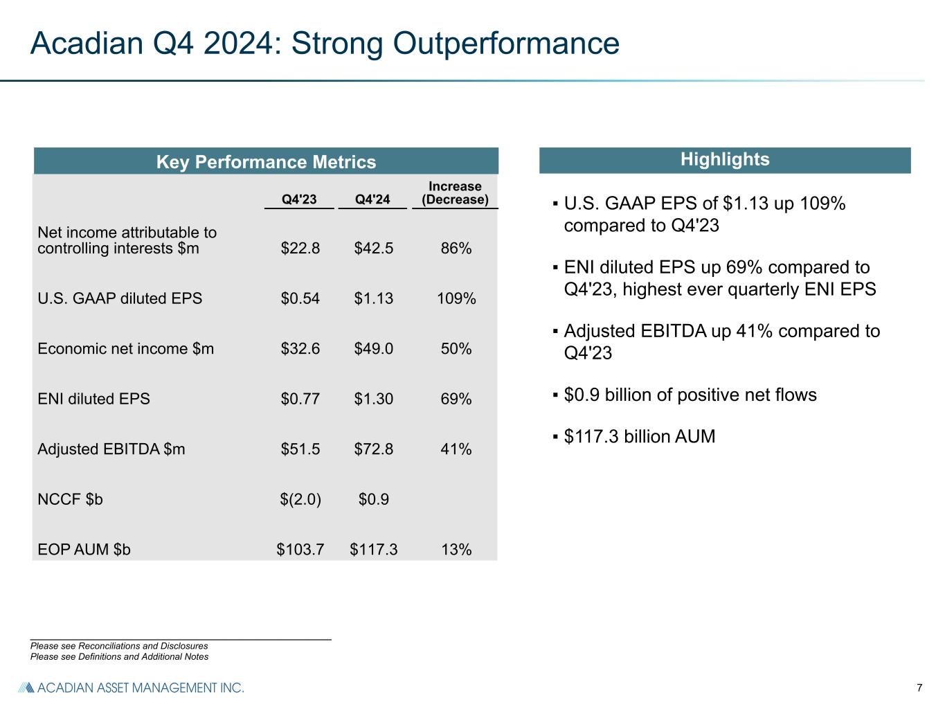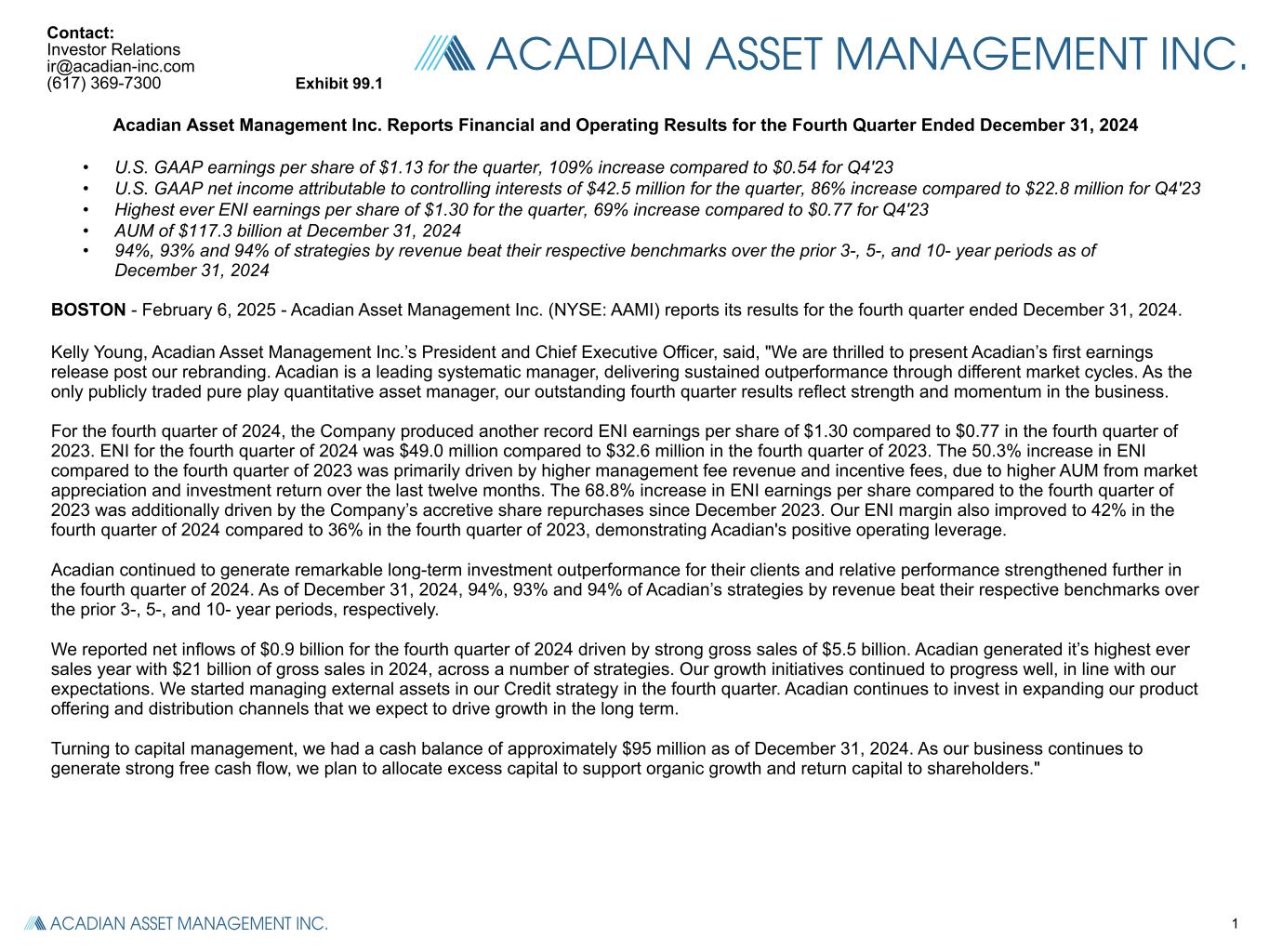 1 Acadian Asset Management Inc. Reports Financial and Operating Results for the Fourth Quarter Ended December 31, 2024 • U.S. GAAP earnings per share of $1.13 for the quarter, 109% increase compared to $0.54 for Q4'23 • U.S. GAAP net income attributable to controlling interests of $42.5 million for the quarter, 86% increase compared to $22.8 million for Q4'23 • Highest ever ENI earnings per share of $1.30 for the quarter, 69% increase compared to $0.77 for Q4'23 • AUM of $117.3 billion at December 31, 2024 • 94%, 93% and 94% of strategies by revenue beat their respective benchmarks over the prior 3-, 5-, and 10- year periods as of December 31, 2024 BOSTON - February 6, 2025 - Acadian Asset Management Inc. (NYSE: AAMI) reports its results for the fourth quarter ended December 31, 2024. Kelly Young, Acadian Asset Management Inc.’s President and Chief Executive Officer, said, "We are thrilled to present Acadian’s first earnings release post our rebranding. Acadian is a leading systematic manager, delivering sustained outperformance through different market cycles. As the only publicly traded pure play quantitative asset manager, our outstanding fourth quarter results reflect strength and momentum in the business. For the fourth quarter of 2024, the Company produced another record ENI earnings per share of $1.30 compared to $0.77 in the fourth quarter of 2023. ENI for the fourth quarter of 2024 was $49.0 million compared to $32.6 million in the fourth quarter of 2023. The 50.3% increase in ENI compared to the fourth quarter of 2023 was primarily driven by higher management fee revenue and incentive fees, due to higher AUM from market appreciation and investment return over the last twelve months. The 68.8% increase in ENI earnings per share compared to the fourth quarter of 2023 was additionally driven by the Company’s accretive share repurchases since December 2023. Our ENI margin also improved to 42% in the fourth quarter of 2024 compared to 36% in the fourth quarter of 2023, demonstrating Acadian's positive operating leverage. Acadian continued to generate remarkable long-term investment outperformance for their clients and relative performance strengthened further in the fourth quarter of 2024. As of December 31, 2024, 94%, 93% and 94% of Acadian’s strategies by revenue beat their respective benchmarks over the prior 3-, 5-, and 10- year periods, respectively. We reported net inflows of $0.9 billion for the fourth quarter of 2024 driven by strong gross sales of $5.5 billion. Acadian generated it’s highest ever sales year with $21 billion of gross sales in 2024, across a number of strategies. Our growth initiatives continued to progress well, in line with our expectations. We started managing external assets in our Credit strategy in the fourth quarter. Acadian continues to invest in expanding our product offering and distribution channels that we expect to drive growth in the long term. Turning to capital management, we had a cash balance of approximately $95 million as of December 31, 2024. As our business continues to generate strong free cash flow, we plan to allocate excess capital to support organic growth and return capital to shareholders." Contact: Investor Relations ir@acadian-inc.com (617) 369-7300 Exhibit 99.1