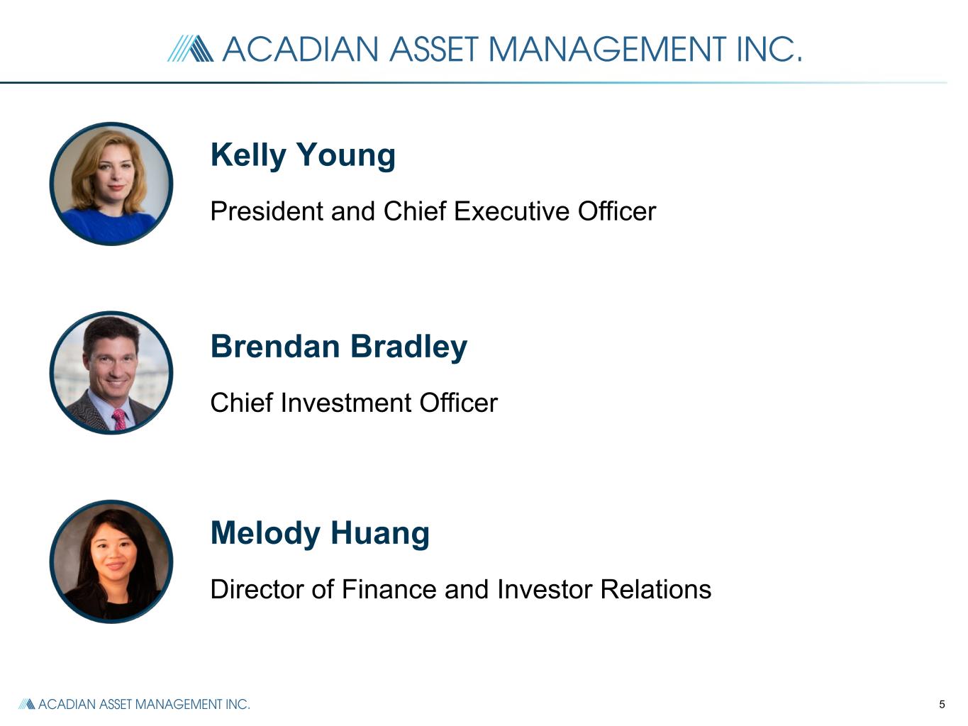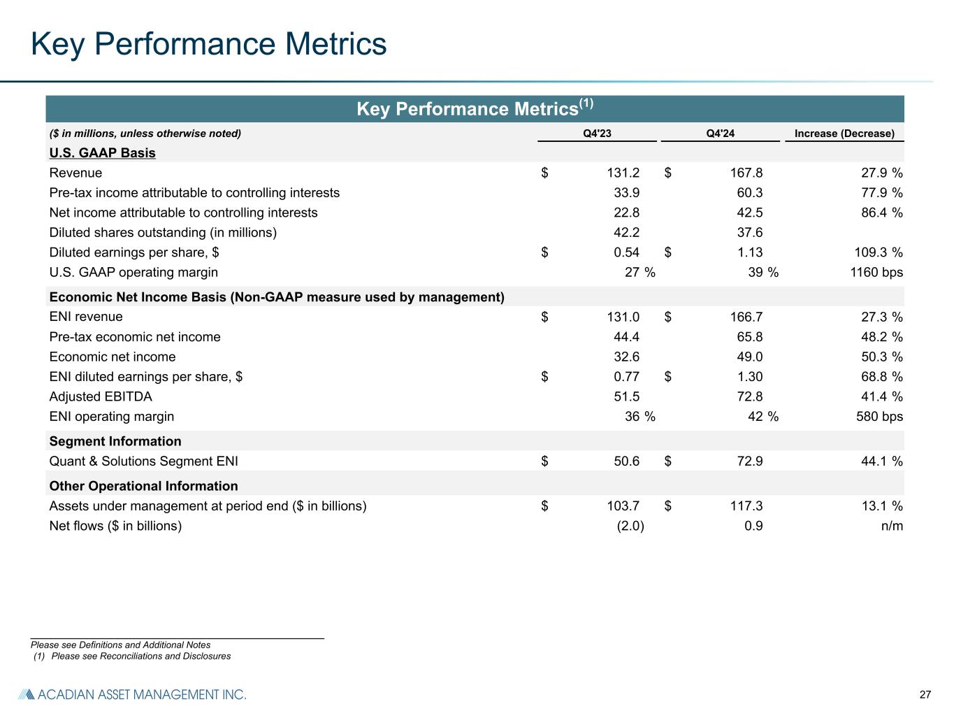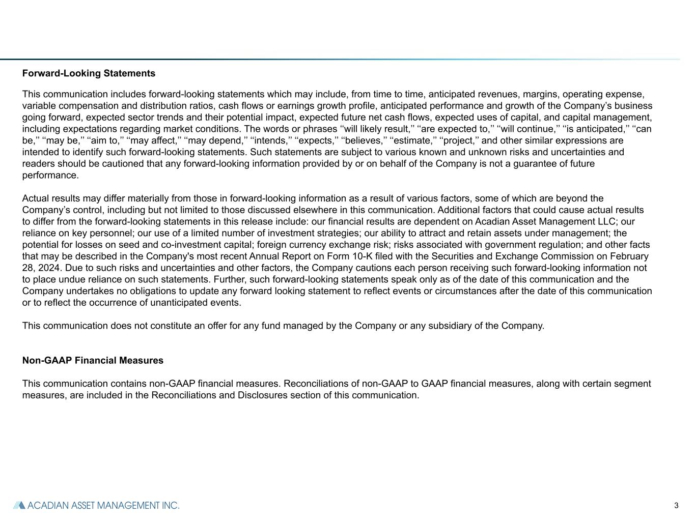 3 Forward-Looking Statements This communication includes forward-looking statements which may include, from time to time, anticipated revenues, margins, operating expense, variable compensation and distribution ratios, cash flows or earnings growth profile, anticipated performance and growth of the Company’s business going forward, expected sector trends and their potential impact, expected future net cash flows, expected uses of capital, and capital management, including expectations regarding market conditions. The words or phrases ‘‘will likely result,’’ ‘‘are expected to,’’ ‘‘will continue,’’ ‘‘is anticipated,’’ ‘‘can be,’’ ‘‘may be,’’ ‘‘aim to,’’ ‘‘may affect,’’ ‘‘may depend,’’ ‘‘intends,’’ ‘‘expects,’’ ‘‘believes,’’ ‘‘estimate,’’ ‘‘project,’’ and other similar expressions are intended to identify such forward-looking statements. Such statements are subject to various known and unknown risks and uncertainties and readers should be cautioned that any forward-looking information provided by or on behalf of the Company is not a guarantee of future performance. Actual results may differ materially from those in forward-looking information as a result of various factors, some of which are beyond the Company’s control, including but not limited to those discussed elsewhere in this communication. Additional factors that could cause actual results to differ from the forward-looking statements in this release include: our financial results are dependent on Acadian Asset Management LLC; our reliance on key personnel; our use of a limited number of investment strategies; our ability to attract and retain assets under management; the potential for losses on seed and co-investment capital; foreign currency exchange risk; risks associated with government regulation; and other facts that may be described in the Company's most recent Annual Report on Form 10-K filed with the Securities and Exchange Commission on February 28, 2024. Due to such risks and uncertainties and other factors, the Company cautions each person receiving such forward-looking information not to place undue reliance on such statements. Further, such forward-looking statements speak only as of the date of this communication and the Company undertakes no obligations to update any forward looking statement to reflect events or circumstances after the date of this communication or to reflect the occurrence of unanticipated events. This communication does not constitute an offer for any fund managed by the Company or any subsidiary of the Company. Non-GAAP Financial Measures This communication contains non-GAAP financial measures. Reconciliations of non-GAAP to GAAP financial measures, along with certain segment measures, are included in the Reconciliations and Disclosures section of this communication.