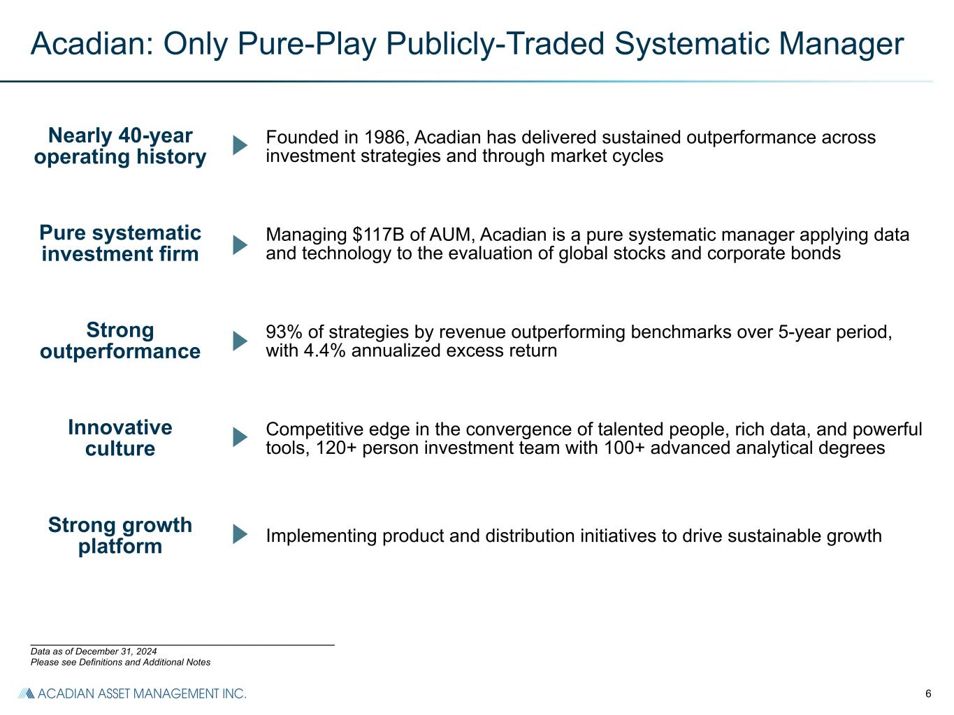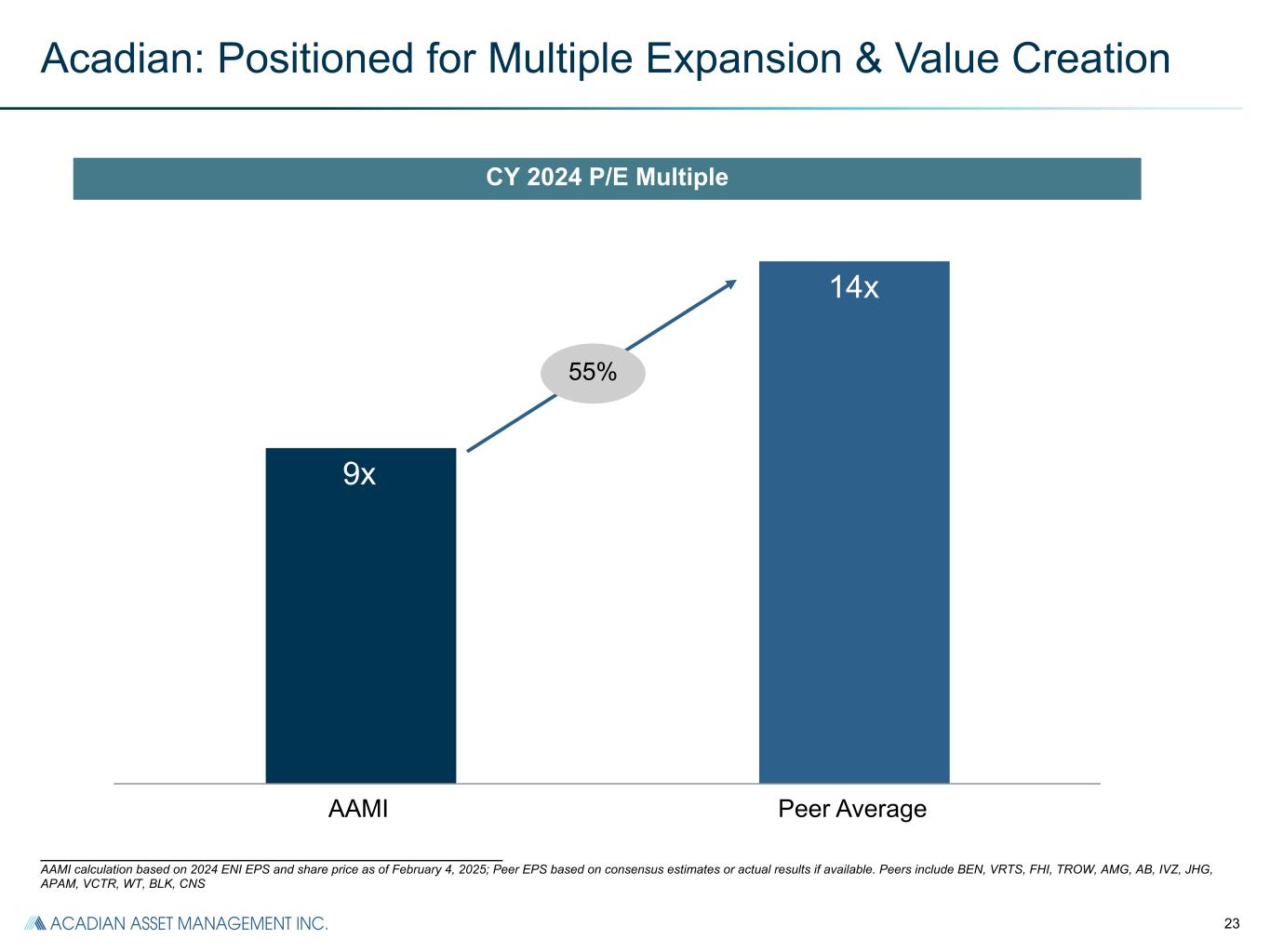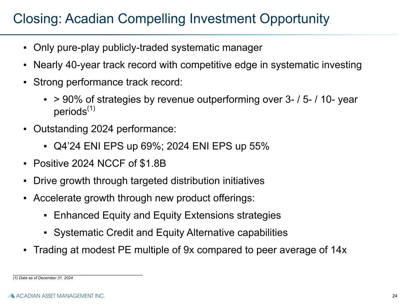 24 Closing: Acadian Compelling Investment Opportunity ▪ Only pure-play publicly-traded systematic manager ▪ Nearly 40-year track record with competitive edge in systematic investing ▪ Strong performance track record: ▪ > 90% of strategies by revenue outperforming over 3- / 5- / 10- year periods(1) ▪ Outstanding 2024 performance: ▪ Q4’24 ENI EPS up 69%; 2024 ENI EPS up 55% ▪ Positive 2024 NCCF of $1.8B ▪ Drive growth through targeted distribution initiatives ▪ Accelerate growth through new product offerings: ▪ Enhanced Equity and Equity Extensions strategies ▪ Systematic Credit and Equity Alternative capabilities ▪ Trading at modest PE multiple of 9x compared to peer average of 14x ___________________________________________________________ (1) Data as of December 31, 2024