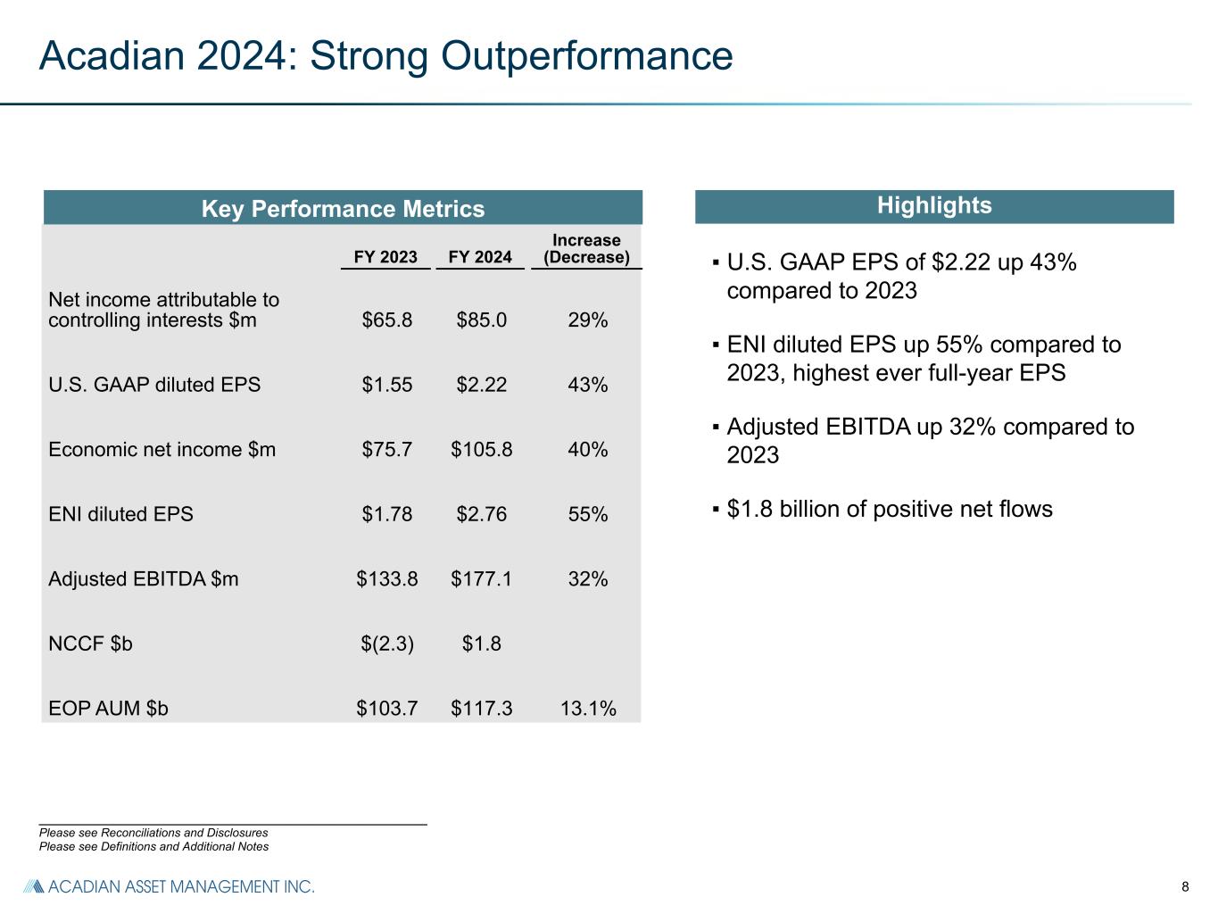 7 Key Performance Metrics Q4'23 Q4'24 Increase (Decrease) Net income attributable to controlling interests $m $22.8 $42.5 86% U.S. GAAP diluted EPS $0.54 $1.13 109% Economic net income $m $32.6 $49.0 50% ENI diluted EPS $0.77 $1.30 69% Adjusted EBITDA $m $51.5 $72.8 41% NCCF $b $(2.0) $0.9 EOP AUM $b $103.7 $117.3 13% Acadian Q4 2024: Strong Outperformance Highlights ▪ U.S. GAAP EPS of $1.13 up 109% compared to Q4'23 ▪ ENI diluted EPS up 69% compared to Q4'23, highest ever quarterly ENI EPS ▪ Adjusted EBITDA up 41% compared to Q4'23 ▪ $0.9 billion of positive net flows ▪ $117.3 billion AUM ___________________________________________________________ Please see Reconciliations and Disclosures Please see Definitions and Additional Notes