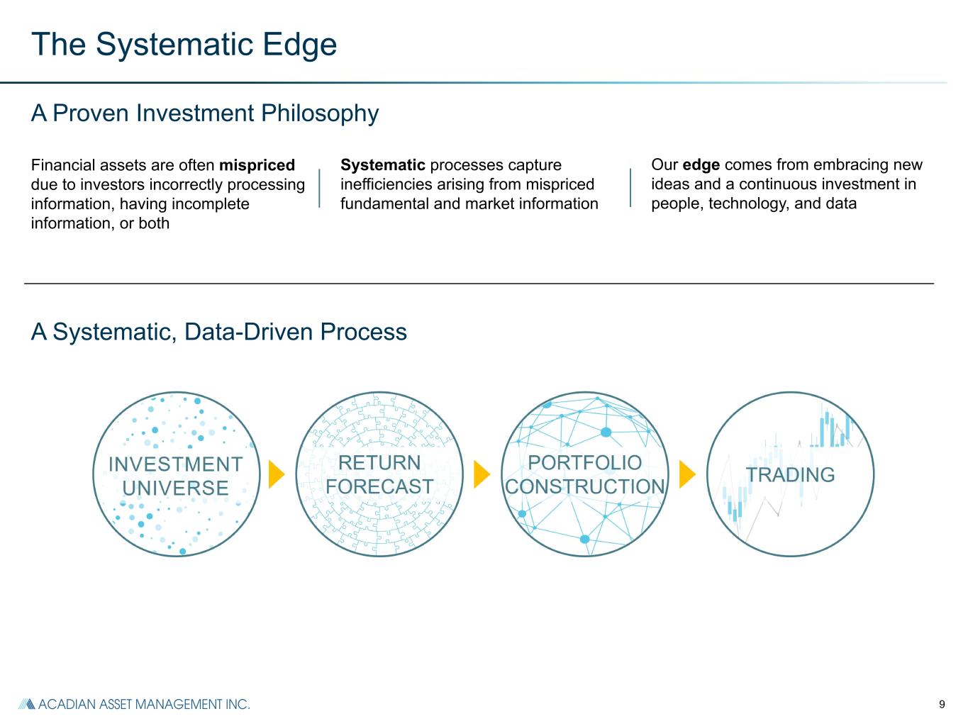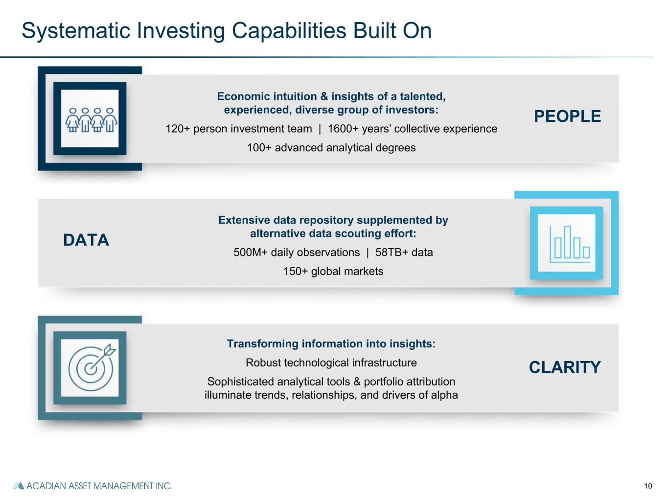 9 Financial assets are often mispriced due to investors incorrectly processing information, having incomplete information, or both The Systematic Edge A Proven Investment Philosophy A Systematic, Data-Driven Process Systematic processes capture inefficiencies arising from mispriced fundamental and market information Our edge comes from embracing new ideas and a continuous investment in people, technology, and data