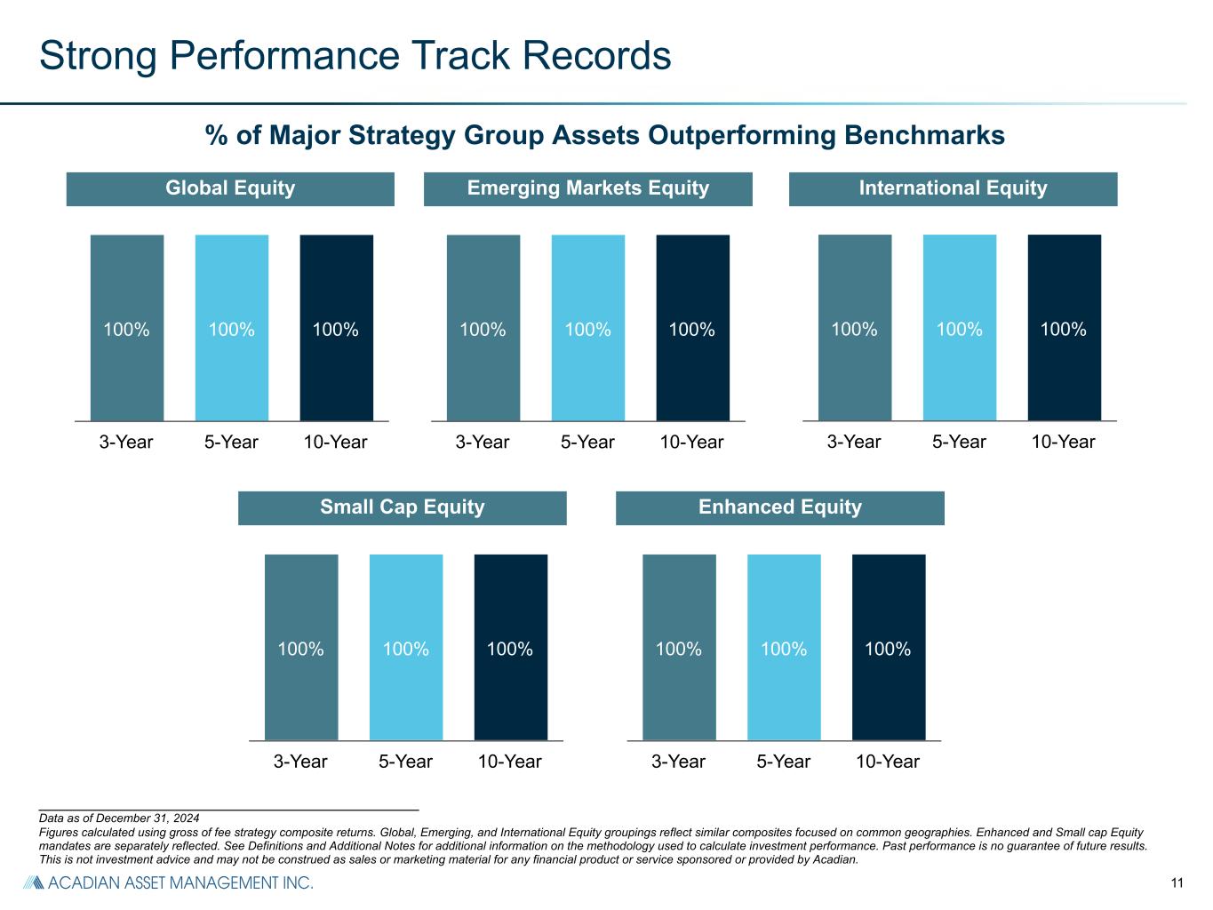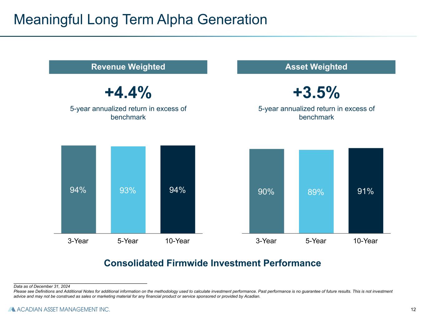 11 100% 100% 100% 3-Year 5-Year 10-Year 100% 100% 100% 3-Year 5-Year 10-Year 100% 100% 100% 3-Year 5-Year 10-Year 100% 100% 100% 3-Year 5-Year 10-Year 100% 100% 100% 3-Year 5-Year 10-Year Global Equity Strong Performance Track Records % of Major Strategy Group Assets Outperforming Benchmarks Emerging Markets Equity International Equity Small Cap Equity Enhanced Equity __________________________________________________________ Data as of December 31, 2024 Figures calculated using gross of fee strategy composite returns. Global, Emerging, and International Equity groupings reflect similar composites focused on common geographies. Enhanced and Small cap Equity mandates are separately reflected. See Definitions and Additional Notes for additional information on the methodology used to calculate investment performance. Past performance is no guarantee of future results. This is not investment advice and may not be construed as sales or marketing material for any financial product or service sponsored or provided by Acadian.