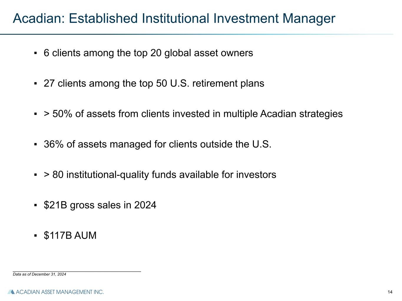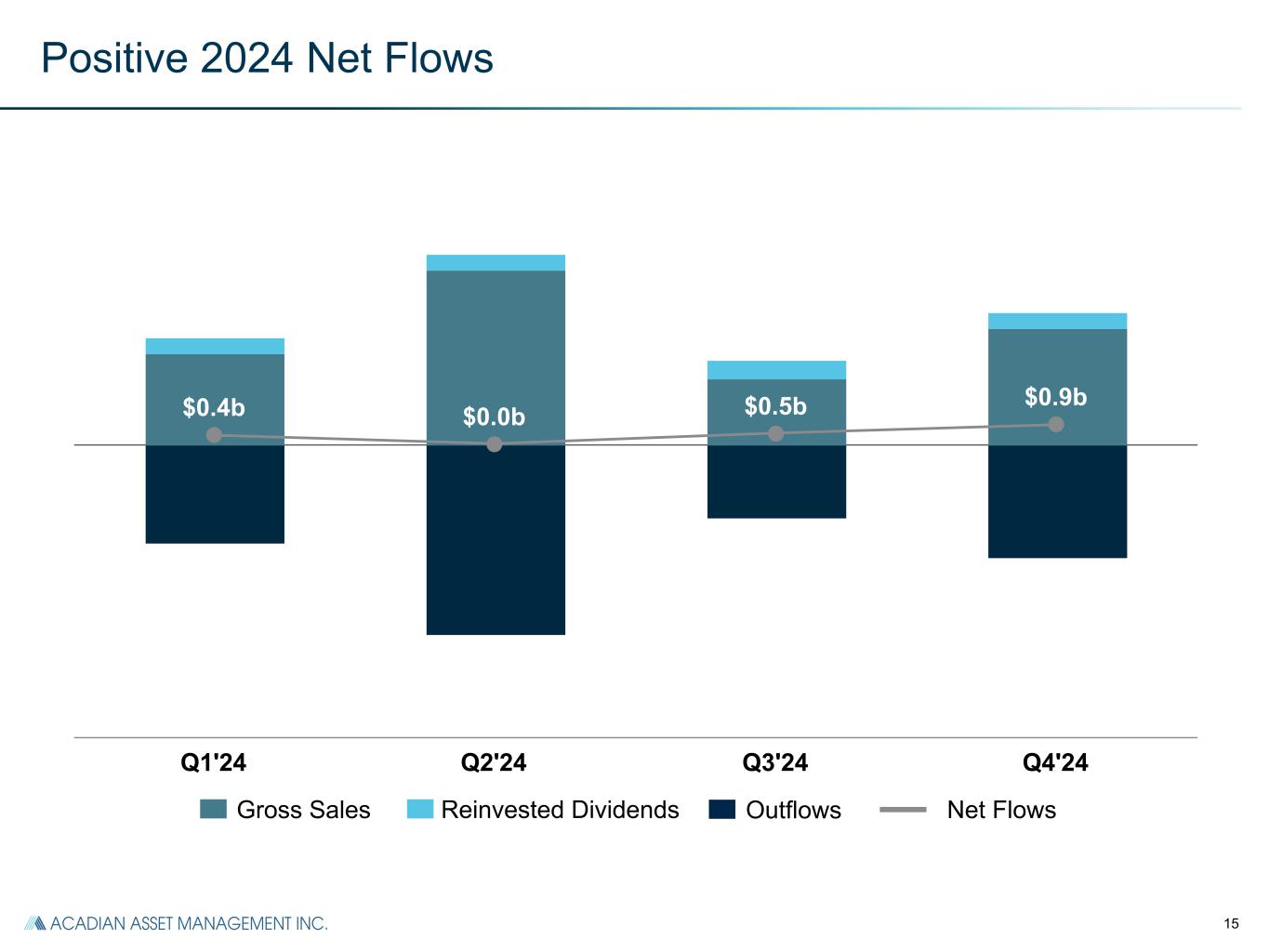 14 Acadian: Established Institutional Investment Manager ▪ 6 clients among the top 20 global asset owners ▪ 27 clients among the top 50 U.S. retirement plans ▪ > 50% of assets from clients invested in multiple Acadian strategies ▪ 36% of assets managed for clients outside the U.S. ▪ > 80 institutional-quality funds available for investors ▪ $21B gross sales in 2024 ▪ $117B AUM ___________________________________________________________ Data as of December 31, 2024