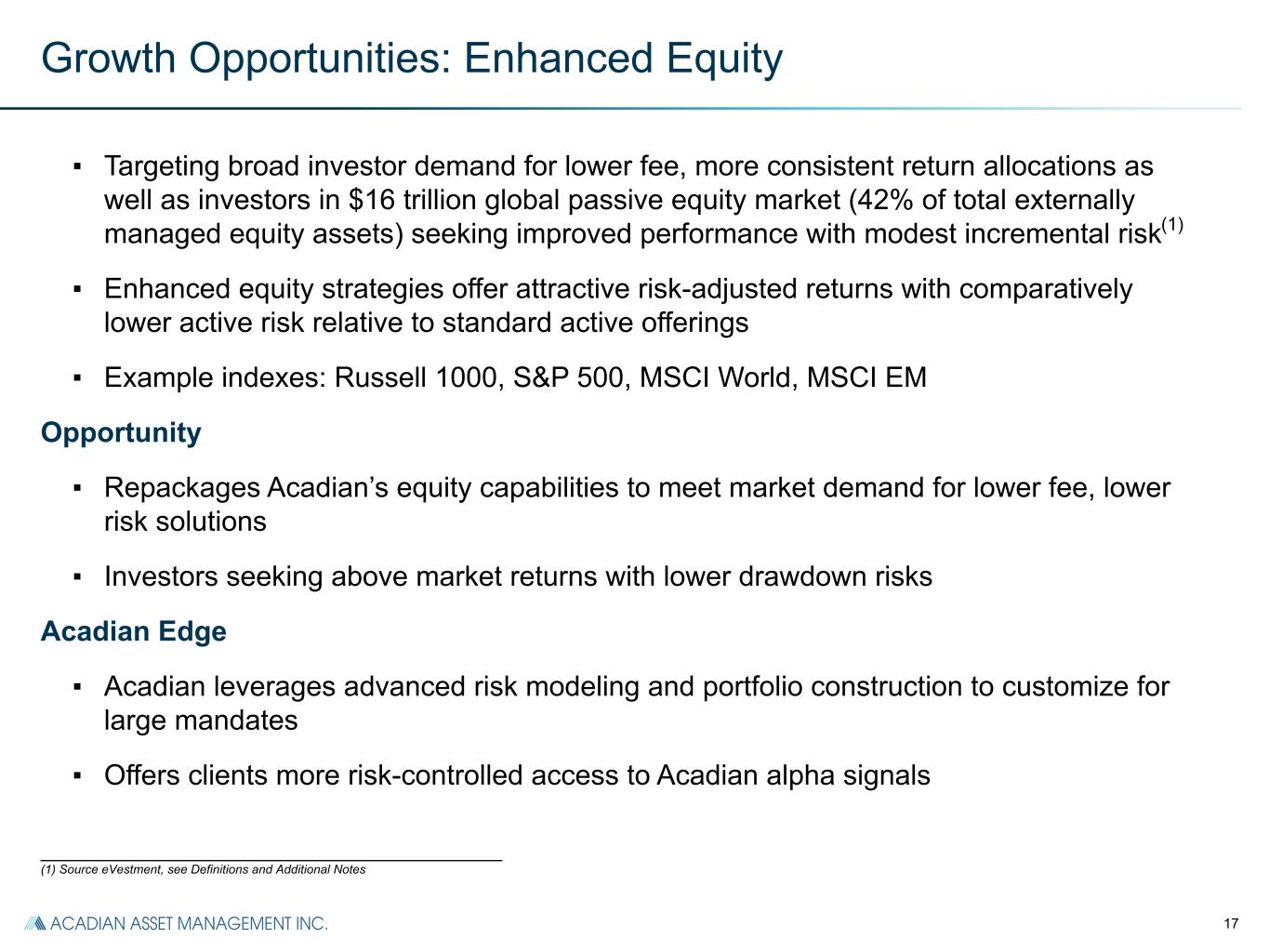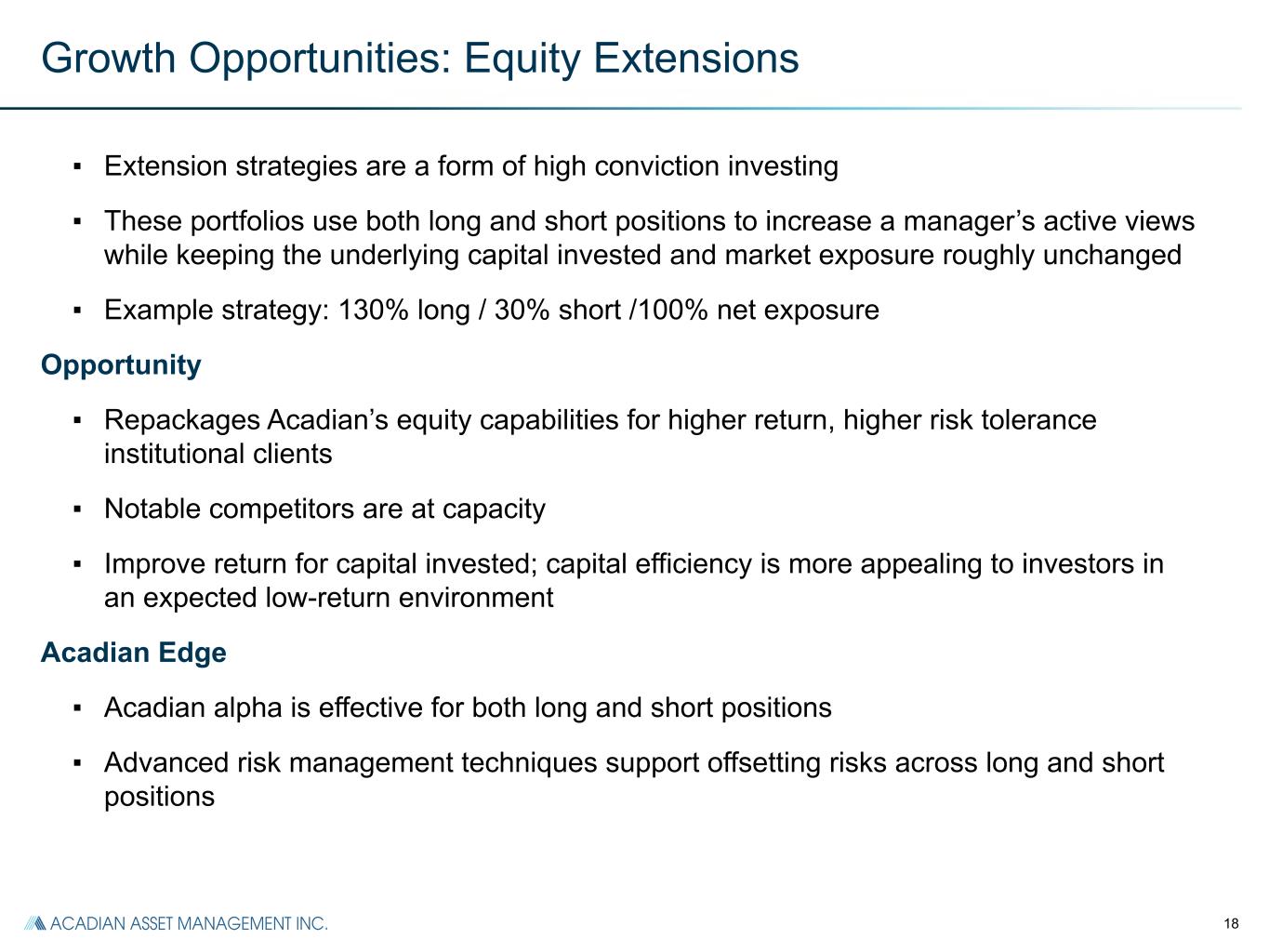 17 Growth Opportunities: Enhanced Equity ▪ Targeting broad investor demand for lower fee, more consistent return allocations as well as investors in $16 trillion global passive equity market (42% of total externally managed equity assets) seeking improved performance with modest incremental risk(1) ▪ Enhanced equity strategies offer attractive risk-adjusted returns with comparatively lower active risk relative to standard active offerings ▪ Example indexes: Russell 1000, S&P 500, MSCI World, MSCI EM Opportunity ▪ Repackages Acadian’s equity capabilities to meet market demand for lower fee, lower risk solutions ▪ Investors seeking above market returns with lower drawdown risks Acadian Edge ▪ Acadian leverages advanced risk modeling and portfolio construction to customize for large mandates ▪ Offers clients more risk-controlled access to Acadian alpha signals ___________________________________________________________ (1) Source eVestment, see Definitions and Additional Notes