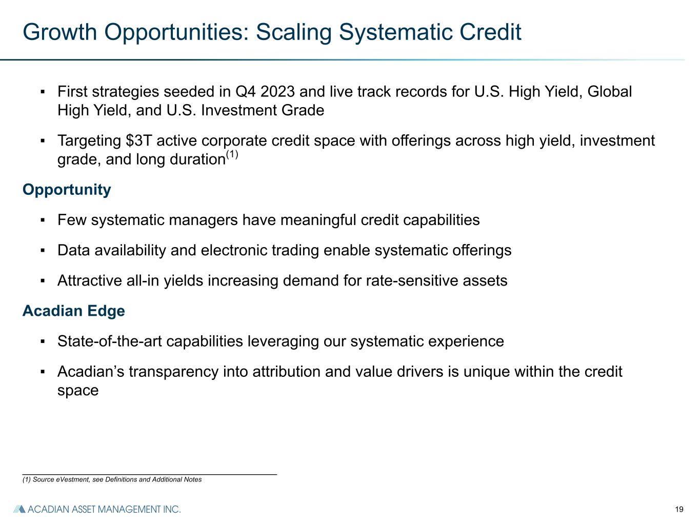 18 Growth Opportunities: Equity Extensions ▪ Extension strategies are a form of high conviction investing ▪ These portfolios use both long and short positions to increase a manager’s active views while keeping the underlying capital invested and market exposure roughly unchanged ▪ Example strategy: 130% long / 30% short /100% net exposure Opportunity ▪ Repackages Acadian’s equity capabilities for higher return, higher risk tolerance institutional clients ▪ Notable competitors are at capacity ▪ Improve return for capital invested; capital efficiency is more appealing to investors in an expected low-return environment Acadian Edge ▪ Acadian alpha is effective for both long and short positions ▪ Advanced risk management techniques support offsetting risks across long and short positions