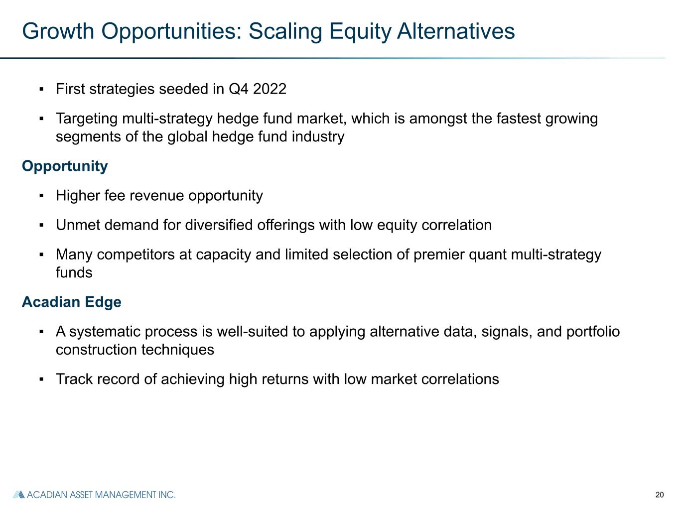 20 Growth Opportunities: Scaling Equity Alternatives ▪ First strategies seeded in Q4 2022 ▪ Targeting multi-strategy hedge fund market, which is amongst the fastest growing segments of the global hedge fund industry Opportunity ▪ Higher fee revenue opportunity ▪ Unmet demand for diversified offerings with low equity correlation ▪ Many competitors at capacity and limited selection of premier quant multi-strategy funds Acadian Edge ▪ A systematic process is well-suited to applying alternative data, signals, and portfolio construction techniques ▪ Track record of achieving high returns with low market correlations
