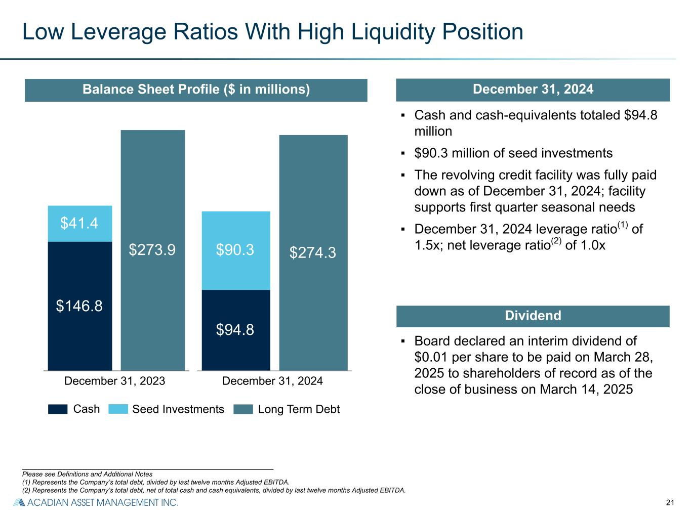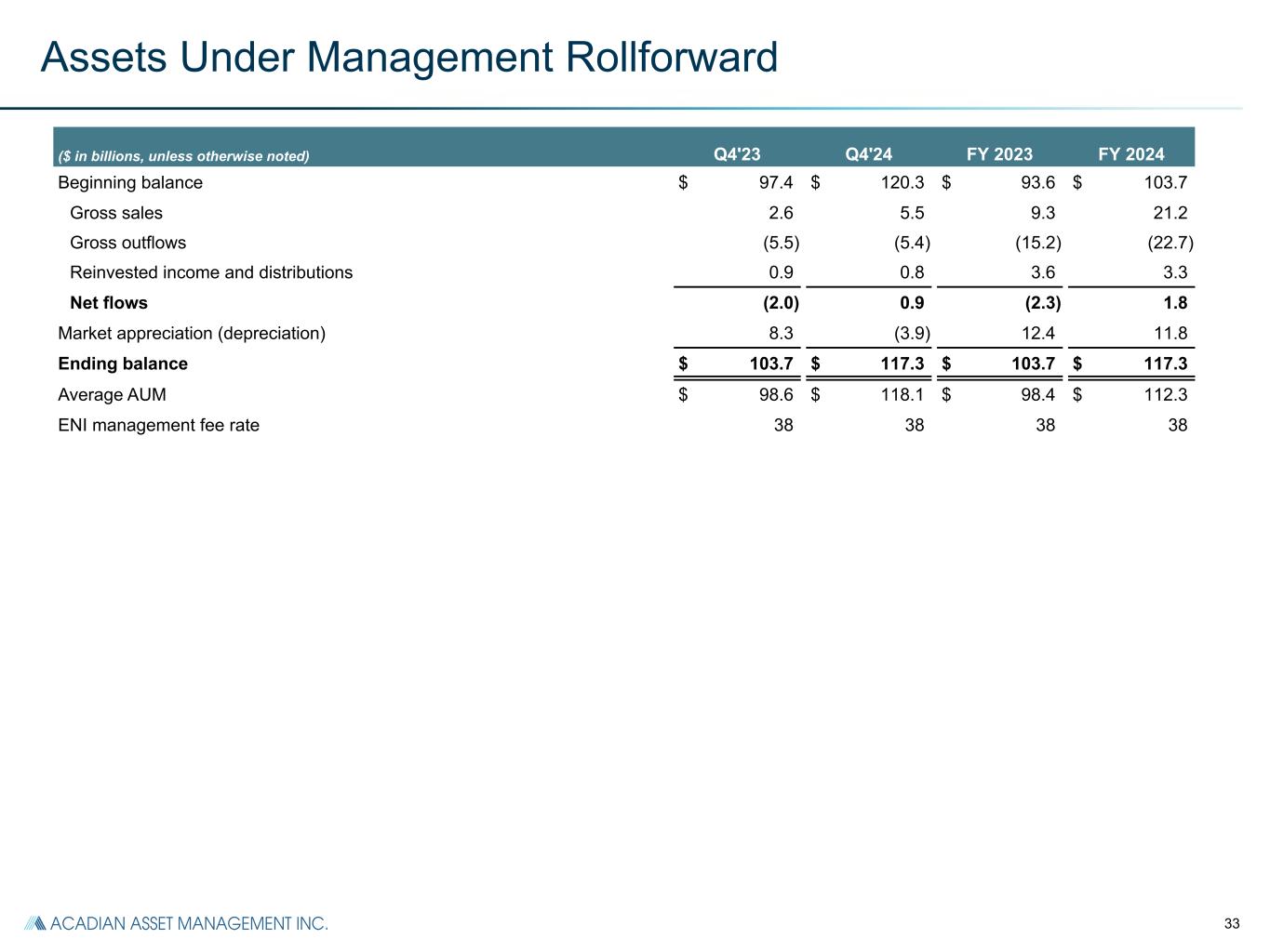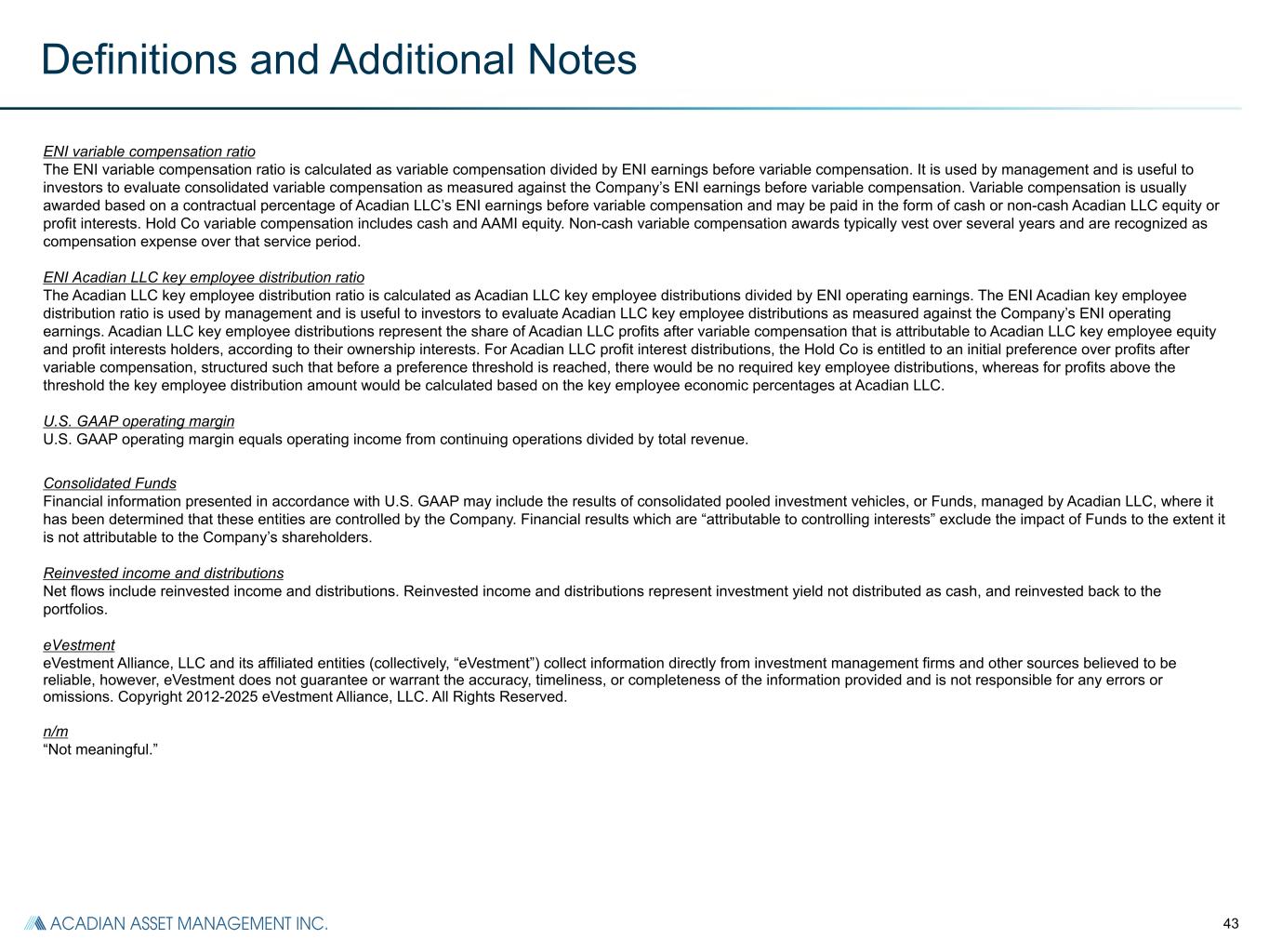 43 ENI variable compensation ratio The ENI variable compensation ratio is calculated as variable compensation divided by ENI earnings before variable compensation. It is used by management and is useful to investors to evaluate consolidated variable compensation as measured against the Company’s ENI earnings before variable compensation. Variable compensation is usually awarded based on a contractual percentage of Acadian LLC’s ENI earnings before variable compensation and may be paid in the form of cash or non-cash Acadian LLC equity or profit interests. Hold Co variable compensation includes cash and AAMI equity. Non-cash variable compensation awards typically vest over several years and are recognized as compensation expense over that service period. ENI Acadian LLC key employee distribution ratio The Acadian LLC key employee distribution ratio is calculated as Acadian LLC key employee distributions divided by ENI operating earnings. The ENI Acadian key employee distribution ratio is used by management and is useful to investors to evaluate Acadian LLC key employee distributions as measured against the Company’s ENI operating earnings. Acadian LLC key employee distributions represent the share of Acadian LLC profits after variable compensation that is attributable to Acadian LLC key employee equity and profit interests holders, according to their ownership interests. For Acadian LLC profit interest distributions, the Hold Co is entitled to an initial preference over profits after variable compensation, structured such that before a preference threshold is reached, there would be no required key employee distributions, whereas for profits above the threshold the key employee distribution amount would be calculated based on the key employee economic percentages at Acadian LLC. U.S. GAAP operating margin U.S. GAAP operating margin equals operating income from continuing operations divided by total revenue. Consolidated Funds Financial information presented in accordance with U.S. GAAP may include the results of consolidated pooled investment vehicles, or Funds, managed by Acadian LLC, where it has been determined that these entities are controlled by the Company. Financial results which are “attributable to controlling interests” exclude the impact of Funds to the extent it is not attributable to the Company’s shareholders. Reinvested income and distributions Net flows include reinvested income and distributions. Reinvested income and distributions represent investment yield not distributed as cash, and reinvested back to the portfolios. eVestment eVestment Alliance, LLC and its affiliated entities (collectively, “eVestment”) collect information directly from investment management firms and other sources believed to be reliable, however, eVestment does not guarantee or warrant the accuracy, timeliness, or completeness of the information provided and is not responsible for any errors or omissions. Copyright 2012-2025 eVestment Alliance, LLC. All Rights Reserved. n/m “Not meaningful.” Definitions and Additional Notes