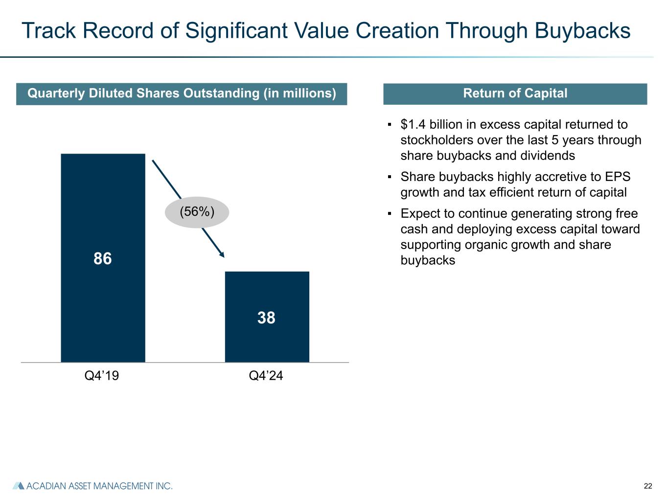 21 ___________________________________________________________ Please see Definitions and Additional Notes (1) Represents the Company’s total debt, divided by last twelve months Adjusted EBITDA. (2) Represents the Company’s total debt, net of total cash and cash equivalents, divided by last twelve months Adjusted EBITDA. Low Leverage Ratios With High Liquidity Position ▪ Cash and cash-equivalents totaled $94.8 million ▪ $90.3 million of seed investments ▪ The revolving credit facility was fully paid down as of December 31, 2024; facility supports first quarter seasonal needs ▪ December 31, 2024 leverage ratio(1) of 1.5x; net leverage ratio(2) of 1.0x December 31, 2024 $94.8 $90.3 $274.3 $146.8 $41.4 $273.9 Cash Long Term Debt December 31, 2023 December 31, 2024 ▪ Board declared an interim dividend of $0.01 per share to be paid on March 28, 2025 to shareholders of record as of the close of business on March 14, 2025 Dividend Balance Sheet Profile ($ in millions) Seed Investments