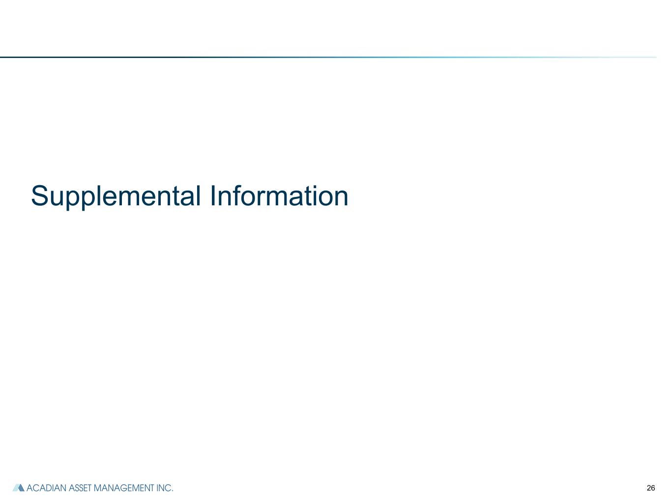 25 U.S. GAAP Statement of Operations ($ in millions, unless otherwise noted) Q4'23 Q4'24 Increase (Decrease) FY 2023 FY 2024 Management fees $ 94.5 $ 111.3 17.8 % $ 373.2 $ 431.1 Performance fees 36.5 55.4 51.8 % 50.4 71.4 Consolidated Funds’ revenue 0.2 1.1 n/m 3.0 3.1 Total revenue 131.2 167.8 27.9 % 426.6 505.6 Compensation and benefits 67.3 75.6 12.3 % 217.9 265.5 General and administrative 23.6 22.3 (5.5) % 82.6 85.2 Depreciation and amortization 4.6 4.4 (4.3) % 17.3 18.5 Consolidated Funds’ expense 0.1 0.5 n/m 2.8 0.9 Total operating expenses 95.6 102.8 7.5 % 320.6 370.1 Operating income 35.6 65.0 82.6 % 106.0 135.5 Investment income (loss) (0.3) (0.3) n/m (0.1) 2.2 Interest income 1.8 0.7 (61.1) % 6.1 3.5 Interest expense (4.5) (4.4) (2.2) % (19.6) (19.4) Net consolidated Funds’ investment gains (losses) 2.3 (2.6) n/m 4.1 3.9 Income before income taxes 34.9 58.4 67.3 % 96.5 125.7 Income tax expense 11.1 17.8 60.4 % 29.4 38.9 Net income 23.8 40.6 70.6 % 67.1 86.8 Net income (loss) attributable to non-controlling interests 1.0 (1.9) n/m 1.3 1.8 Net income attributable to controlling interests $ 22.8 $ 42.5 86.4 % $ 65.8 $ 85.0 Earnings per share, basic, $ $ 0.55 $ 1.14 107.3 % $ 1.59 $ 2.25 Earnings per share, diluted, $ $ 0.54 $ 1.13 109.3 % $ 1.55 $ 2.22 Average basic shares outstanding (in millions) 41.5 37.4 41.5 37.8 Average diluted shares outstanding (in millions) 42.2 37.6 42.5 38.3 U.S. GAAP operating margin 27 % 39 % 1160 bps 25 % 27 % Pre-tax income attributable to controlling interests $ 33.9 $ 60.3 77.9 % $ 95.2 $ 123.9 Net income attributable to controlling interests $ 22.8 $ 42.5 86.4 % $ 65.8 $ 85.0 Q4'24 vs. Q4'23 ▪ Total revenue increased 27.9% from Q4'23 driven by higher management fees reflecting an increase in average AUM in Q4'24 compared to Q4'23 and higher performance fees ▪ Operating expenses increased 7.5% from Q4'23 driven by an increase in compensation and benefits expense primarily due to higher sales based compensation, higher variable compensation, and an increase in the value of the Acadian LLC equity plan liability in Q4'24 compared to prior year ▪ Income tax expense increased 60.4% from Q4'23 in line with the increase in pre-tax earnings ▪ U.S. GAAP net income attributable to controlling interests increased 86.4% from Q4'23 primarily due to the increase in revenue ▪ Diluted earnings per share increased 109.3% from Q4'23 due to higher net income attributable to controlling interests in Q4'24, and the decrease in the average diluted shares outstanding, reflecting the positive impact of stock repurchases made during the year ___________________________________________________________ Please see Definitions and Additional Notes