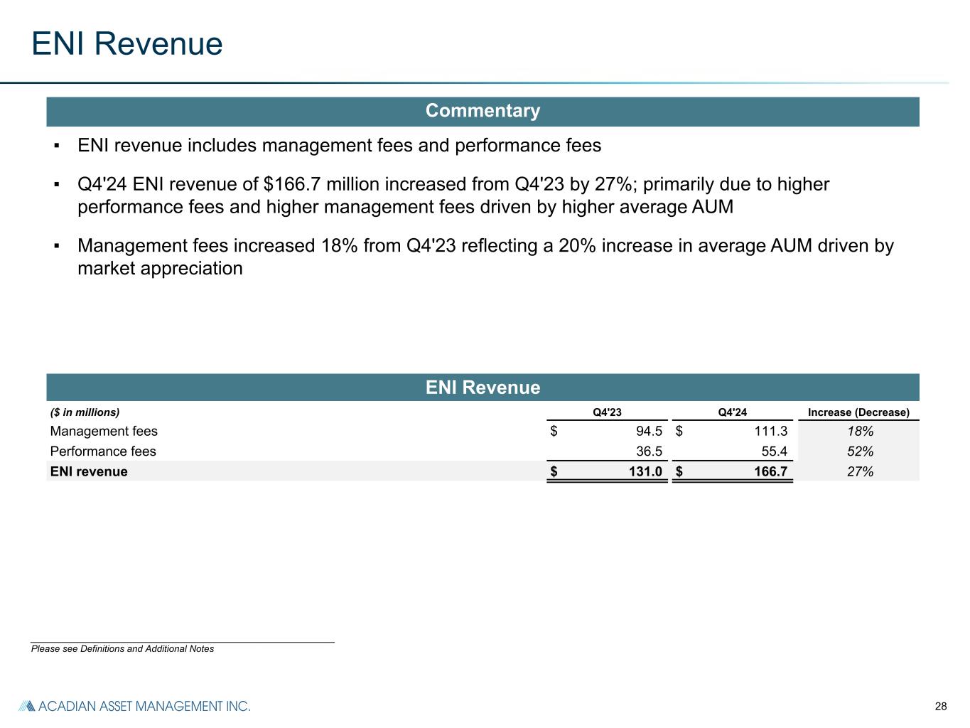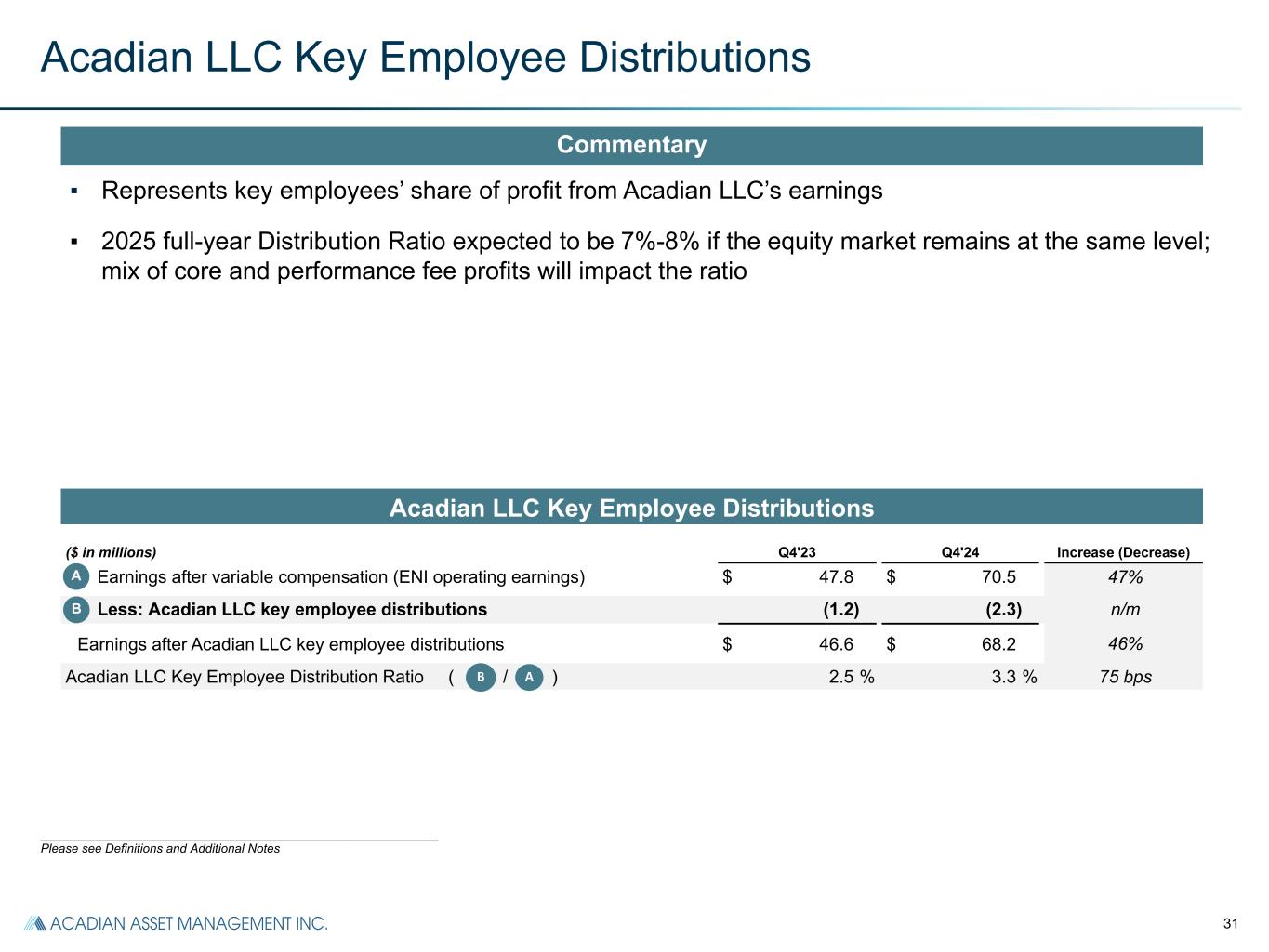 30 ENI Variable Compensation ($ in millions) Q4'23 Q4'24 Increase (Decrease) Cash variable compensation $ 28.7 $ 37.5 31% Add: Non-cash equity-based award amortization 1.8 1.7 (6)% Variable compensation 30.5 39.2 29% Earnings before variable compensation $ 78.3 $ 109.7 40% Variable Compensation Ratio (VC as % of earnings before variable comp.) 39.0 % 35.7 % (322) bps ▪ Variable compensation is primarily comprised of a contractual percentage of ENI earnings before variable compensation and a contractual split of performance fees, which is awarded to employees and recognized over a contractual vesting period ▪ Variable compensation also includes non-cash compensation in the form of Acadian LLC equity provided through recycling and AAMI equity ▪ Q4'24 Variable Compensation Ratio decreased to 35.7% from 39.0% in Q4'23; ratio decreased largely driven by higher growth in performance fee revenue ▪ 2025 full-year Variable Compensation Ratio expected to be 44%-48% ___________________________________________________________ Please see Definitions and Additional Notes ENI Variable Compensation Commentary